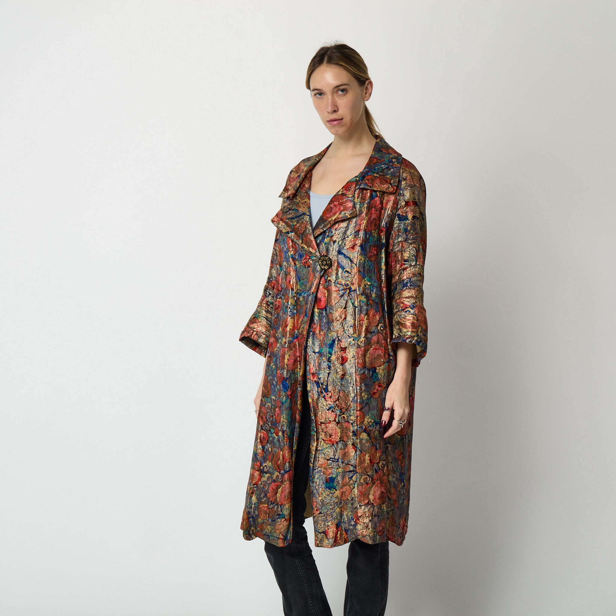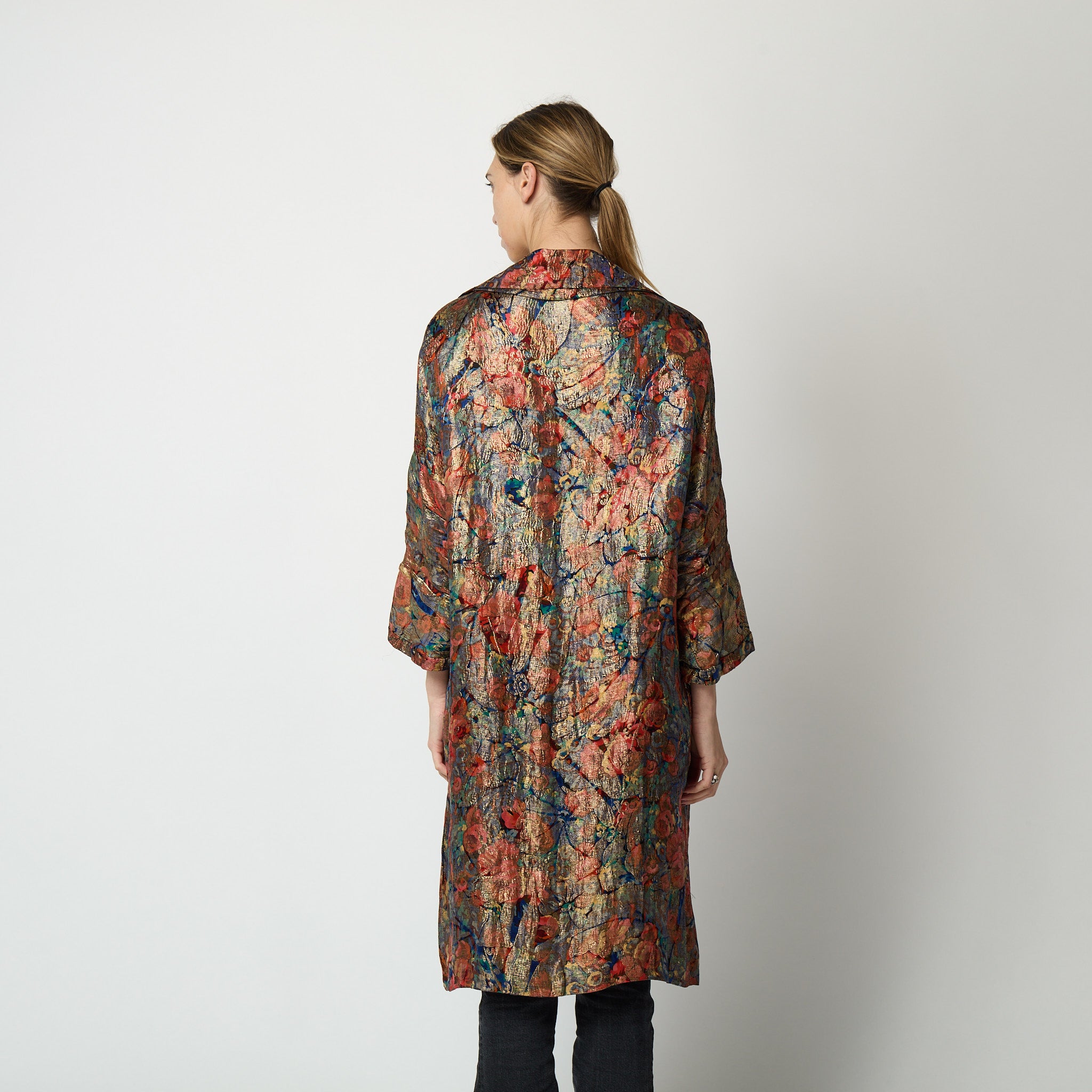 This 1920s to early 1930s long jacket is crafted from the most beautiful lame fabric with deeply considered attention to detail in its construction. It is crafted from a lightweight silk lame patterned with painterly rainbow flowers - we love the deeper toned art deco hues and vibrant blue, pink and tangerine details. The fabric is woven all-over with metallic gold lamé thread which forms hazy, sheer florals and vines. Tailored to a loose fit, almost like a duster coat, it has a panelled construction throughout. The notched collar is wide and relaxed, as are the sleeves. It fastens with a wrap-over front secured with a single button. The button is as decadent as the fabric; it is black and carved with geometric patterns and detailed with gold metallic paint. The jacket is lined with matte butter-yellow shot silk.