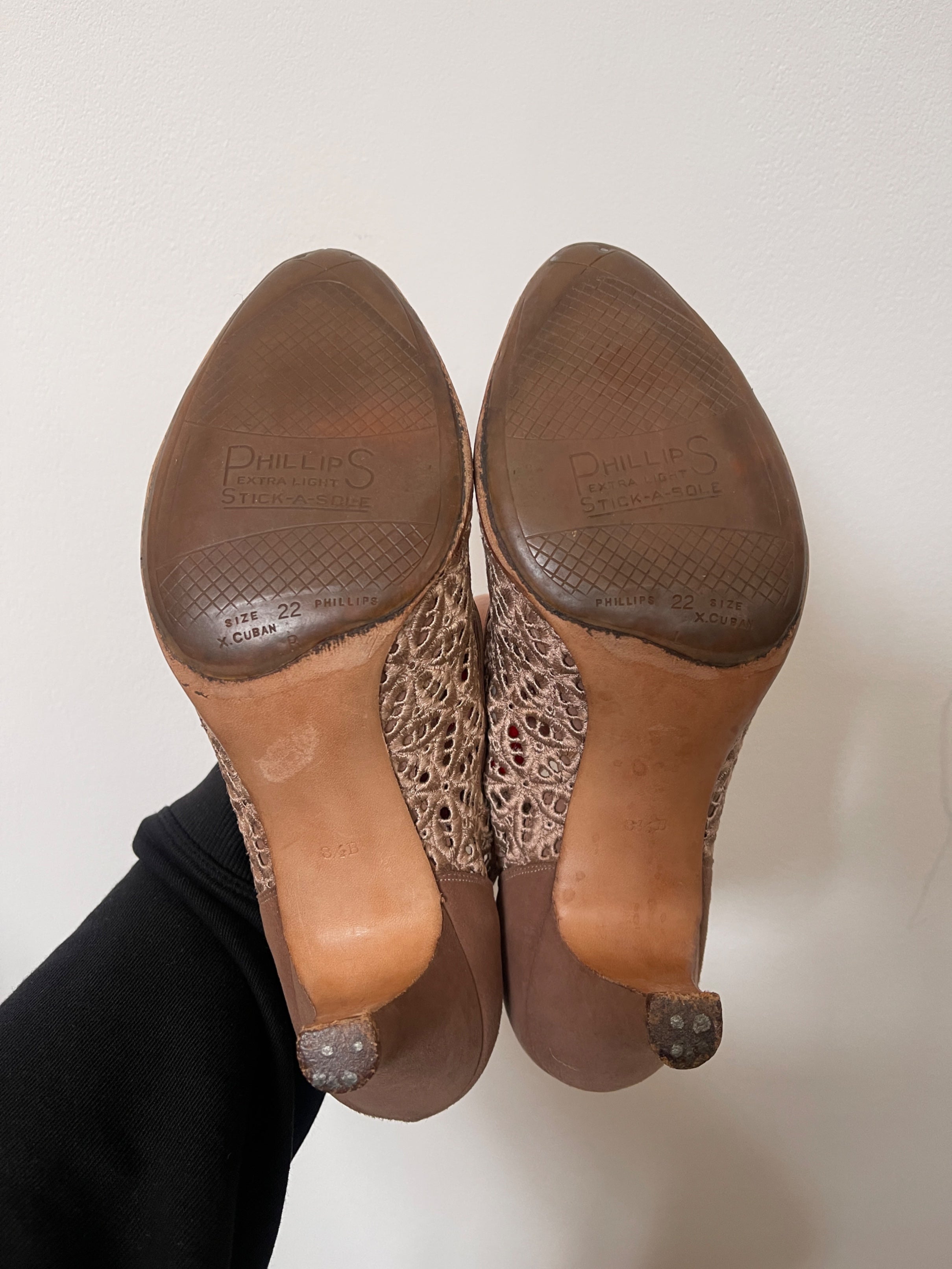 A very finely preserved example of 1930s USA footwear design, these coffee-brown suede shoes have machine embroidered pale creamy brown cutwork detailing that curves gracefully around the sides and front, giving the appearance of lace. The toe features a softly rounded brogue-style cap, while a small frill of matching suede trims the front for a feminine touch. Finished with a 7 cm heel and labelled Marylee Bective in gold script inside. The soles have a Phillips Extra Light Stick-a-Sole added, possibly around the same time, for extra grip and protection.