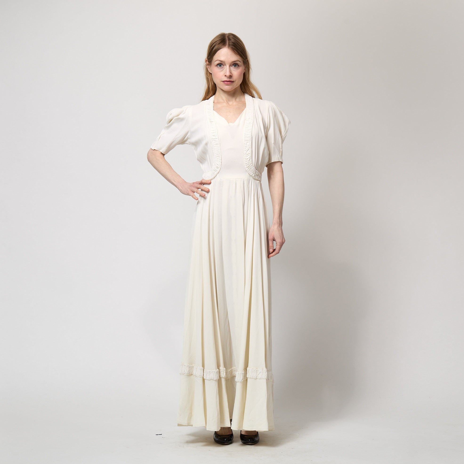 Phenomenal and original rayon crepe wedding dress, couture made in France around 1937 - 1940. Made from fine woven medium weight rayon crepe in ivory white which reaches to the floor. The illusion bodice is designed to look like a jacket is overlaying the dress but is in fact expertly tailored with the addition of a stitched ruched band outlining the shape of a bolero. The sleeve shape is in the desirable Hollywood regency style - a seamed short sleeve tapered puff whilst from the darted waist band falls a long sweeping a-line skirt with deep flounce. This flounce echoes the ruched banding around the bodice and back of the waist band. The dress is accessed through a series of hook and eyes and poppers on the left inside seam and waist band. Unlabelled French couture.