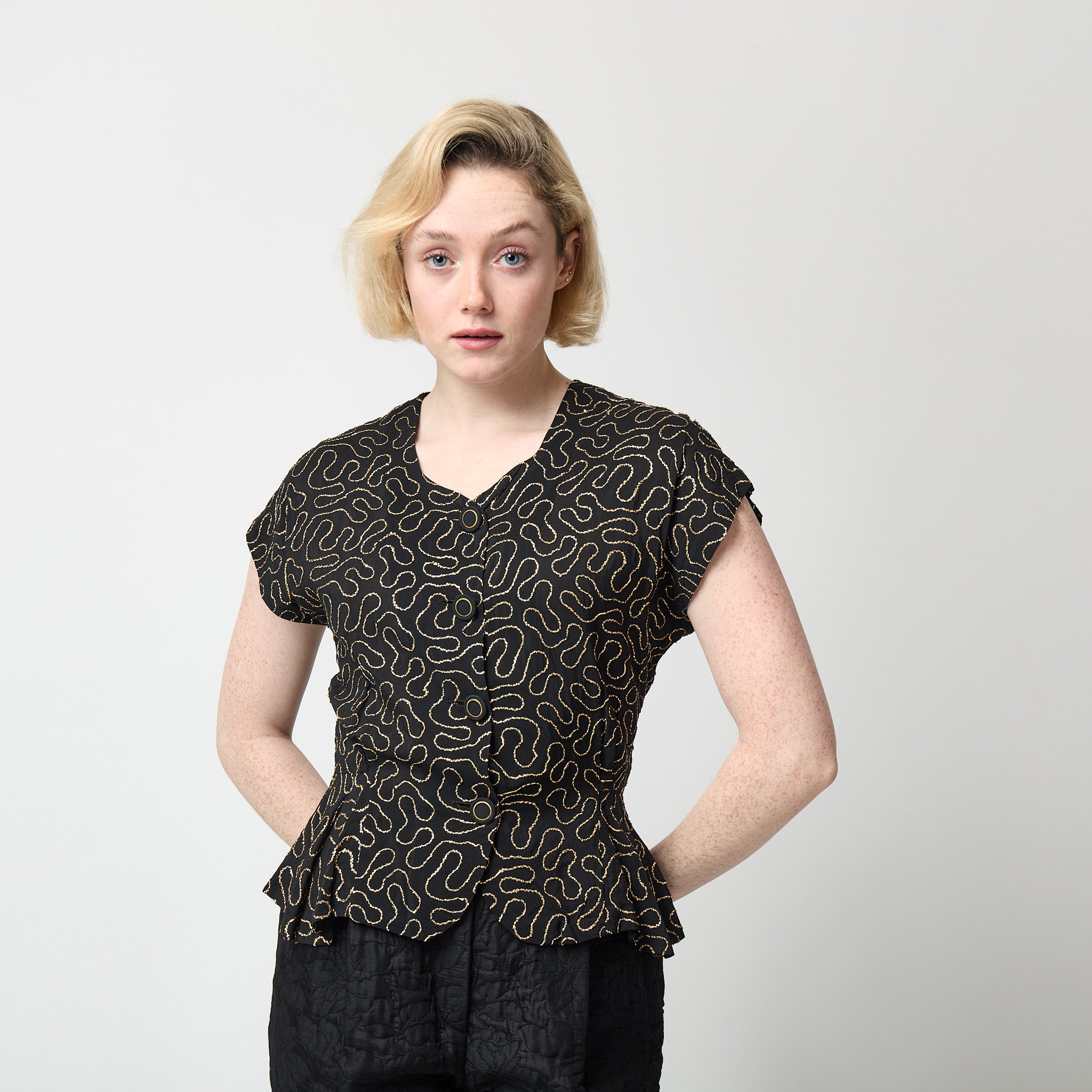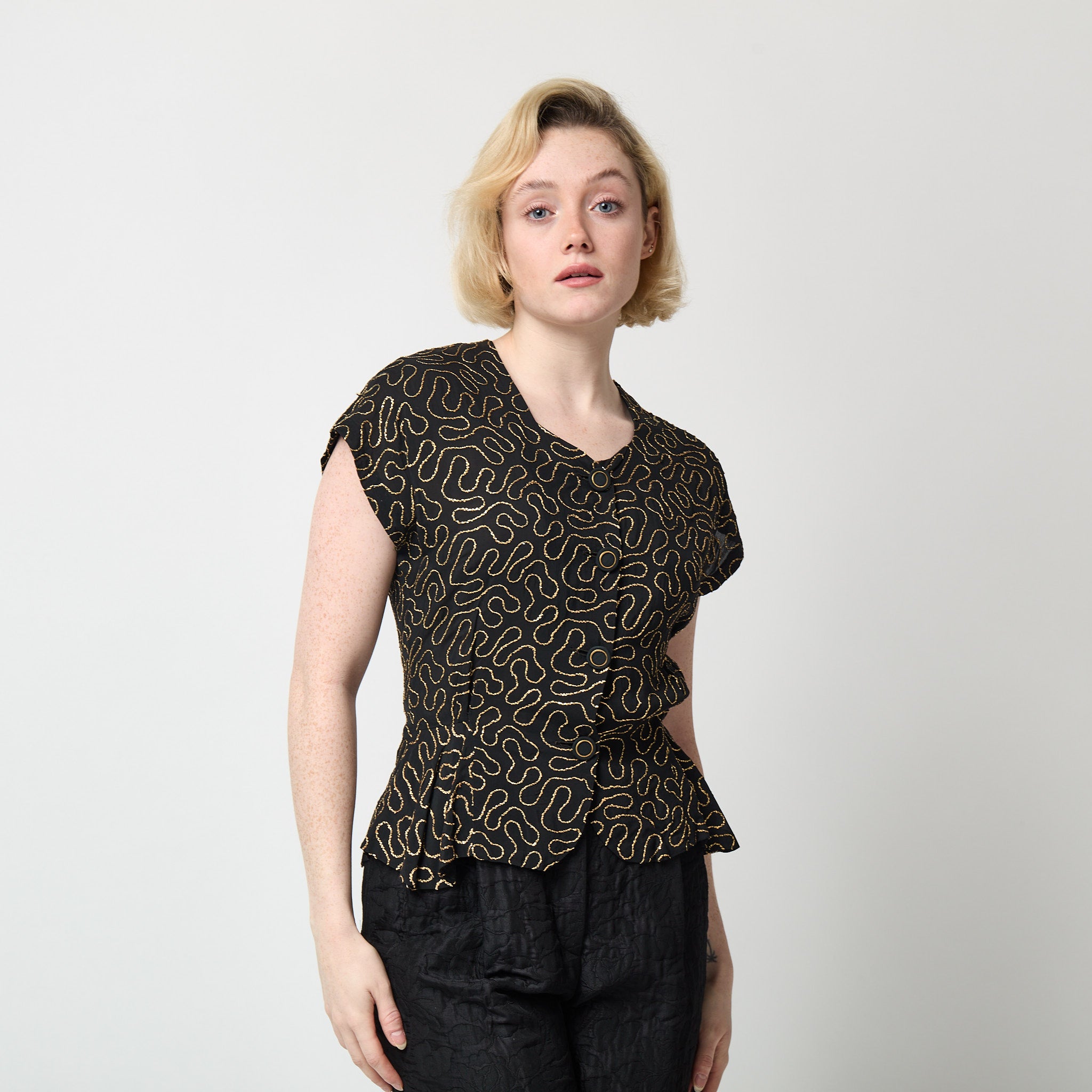 This is an original 1940s black crepe blouse with a striking metallic gold swirl design. One of the best cocktail separates we've ever had, with a dropped shoulder, a gentle draping cap sleeve and a fabulous, figure-hugging shape that is well-darted and shaped at the waist. It fastens with the original fabric covered buttons that have a fine, gold circular ring.