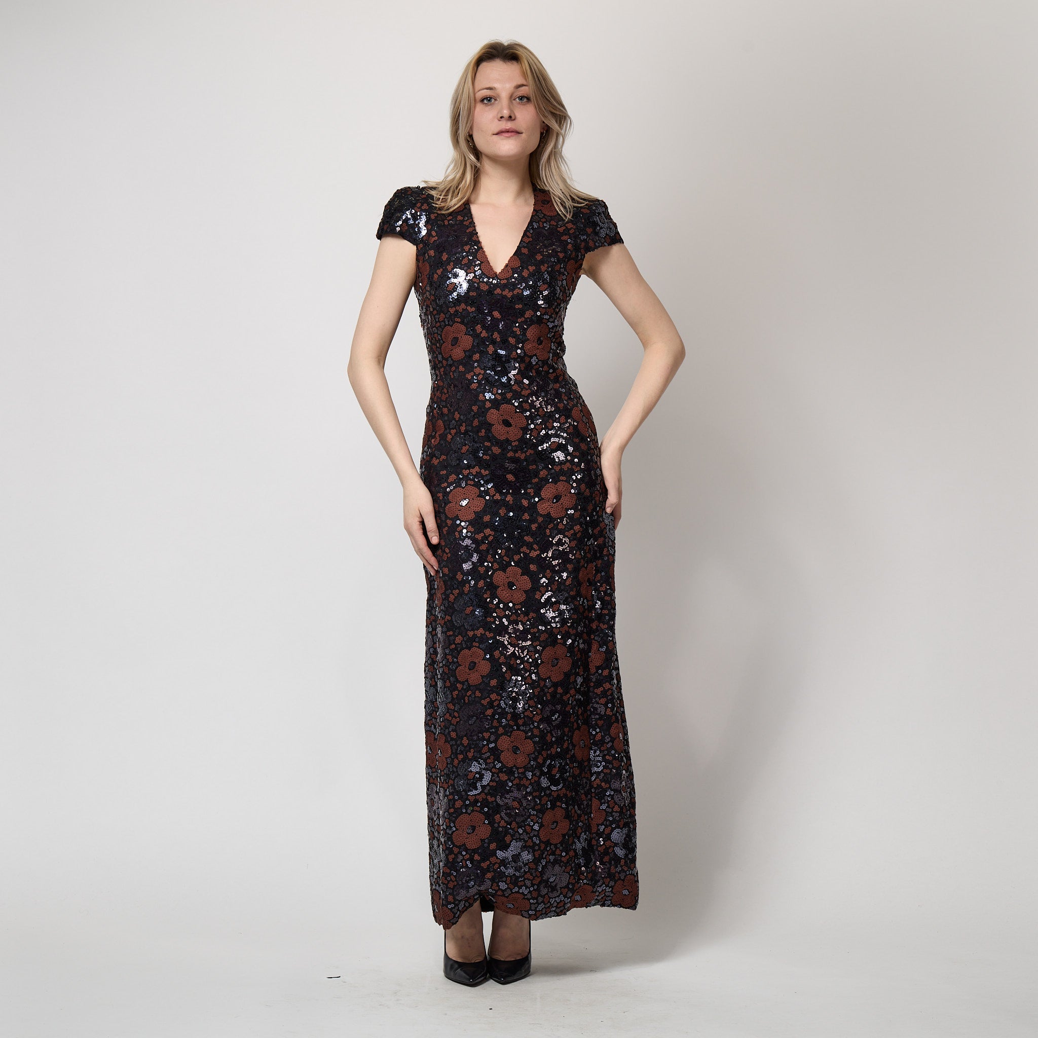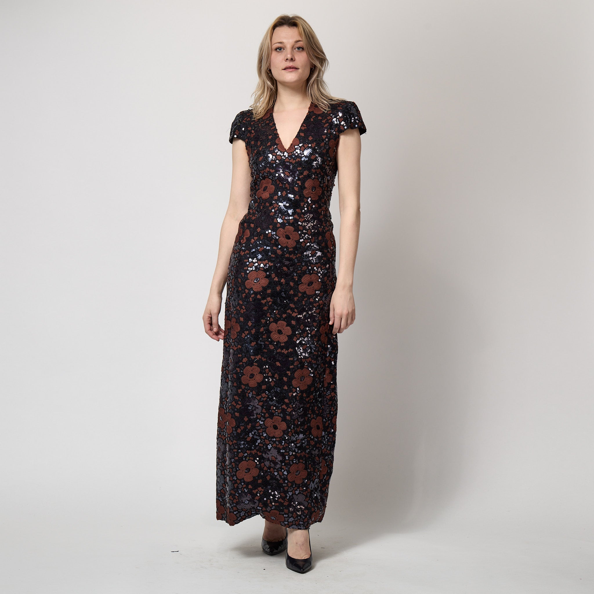 A very elegant 1980s sequin dress from Italian couturier Andre Laug from his haute couture / alta moda line. The dress has beautiful cap sleeves, a V neckline and is a Princess seamed full length sheath design. Embellished all over in a floral sequin pattern with a rather interesting satin bronze tone. This unusual mat colour contrasts the subtle shimmer of the black and purple sequins and the overall look is very pleasing and understated. It has shoulder pads and is beautifully lined. Fastens to the rear with the original zip. This was most likely a runway piece and was purchased with a number of archive pieces. This will fit a size UK 10 or US 6 best and it's in fabulous vintage condition with no issues of any note. Our model is a UK 8-10 US 4-6 and 5'9" and this dress was a great fit on her.