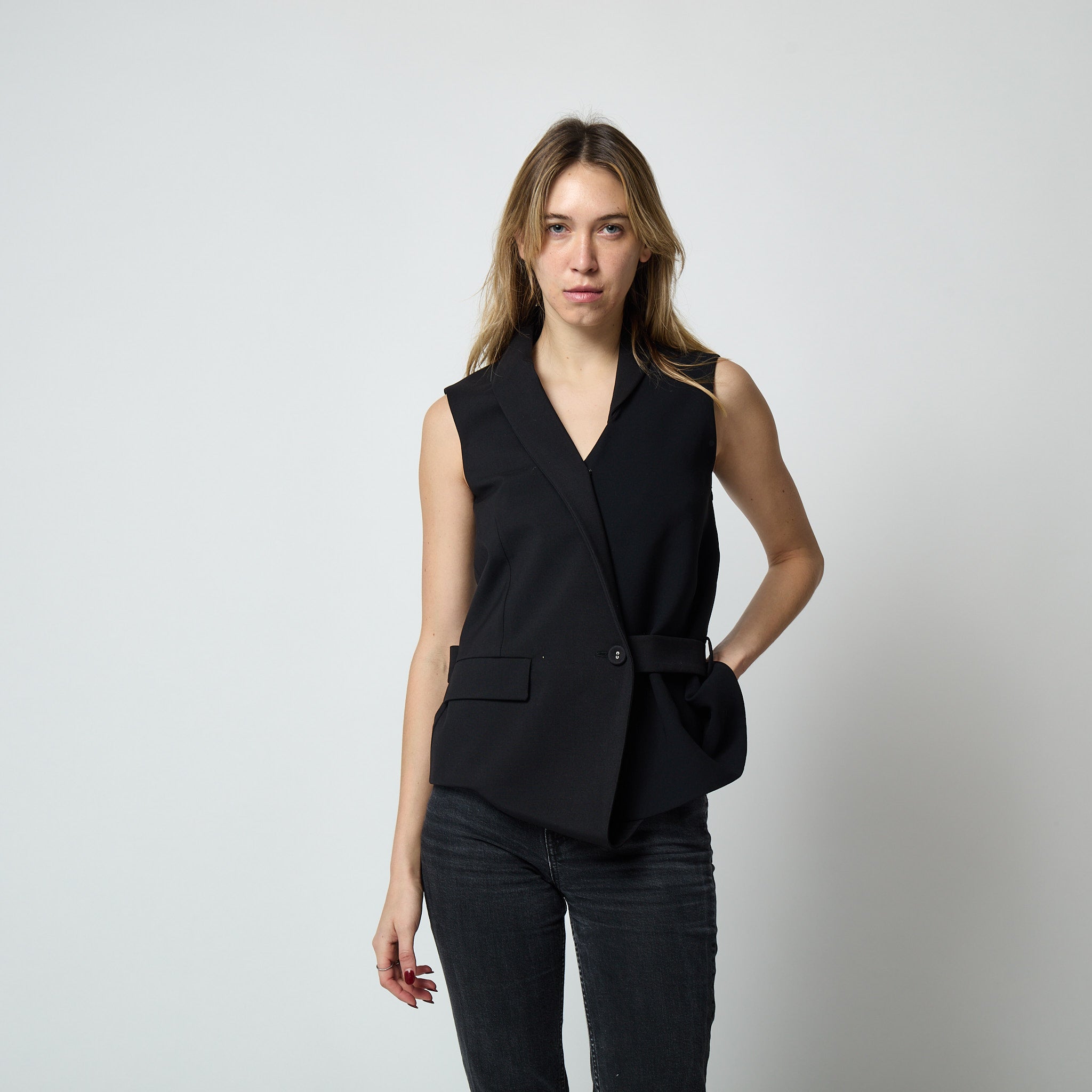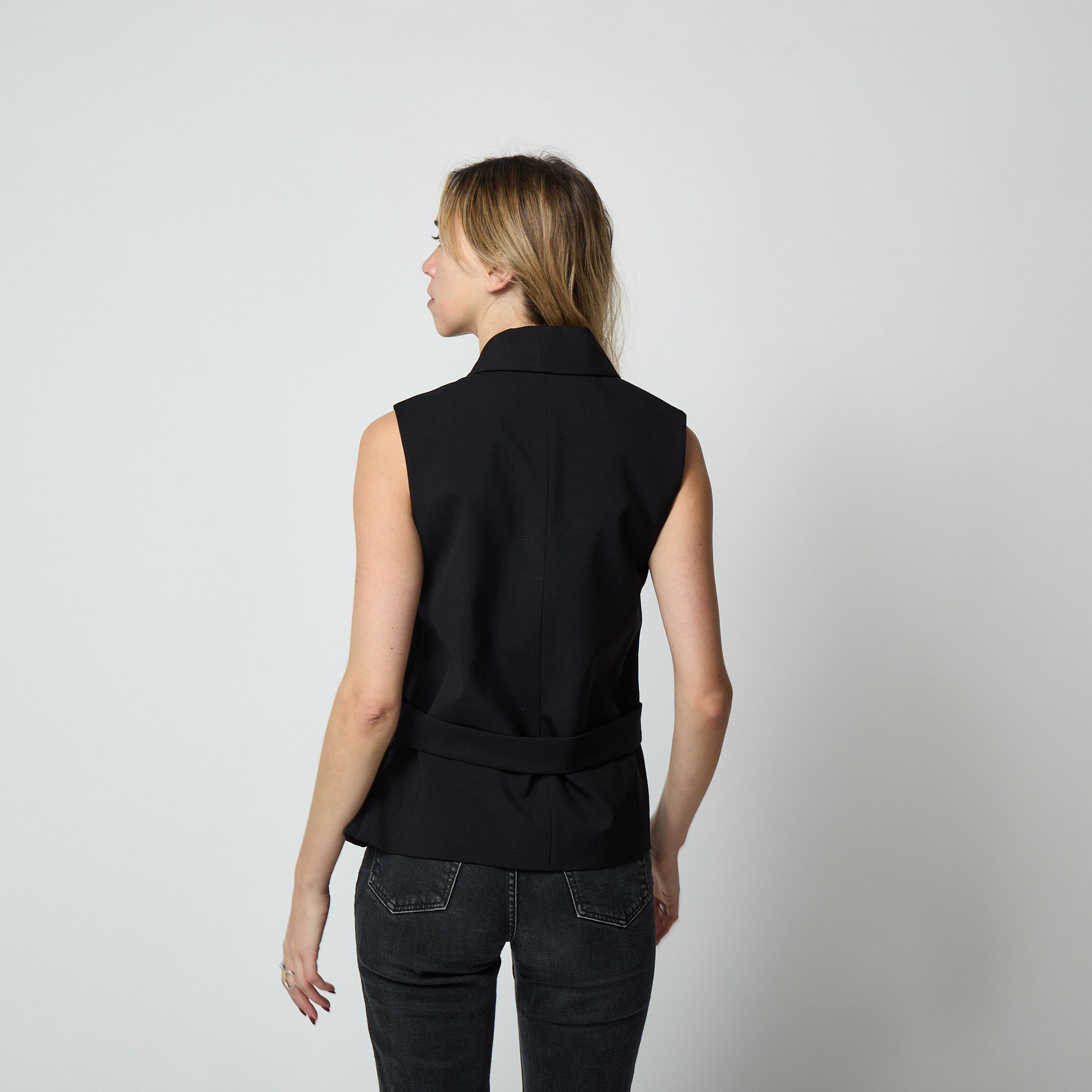 This chic black waistcoat was designed by Balenciaga in 2014 when Alexander Wang was Creative Director. Wang brought an edgy aesthetic to the brand, infusing traditional elegance with a modern urban twist and his tenure saw the introduction of new designs and collaborations expanding Balenciaga’s reach to a younger demographic.