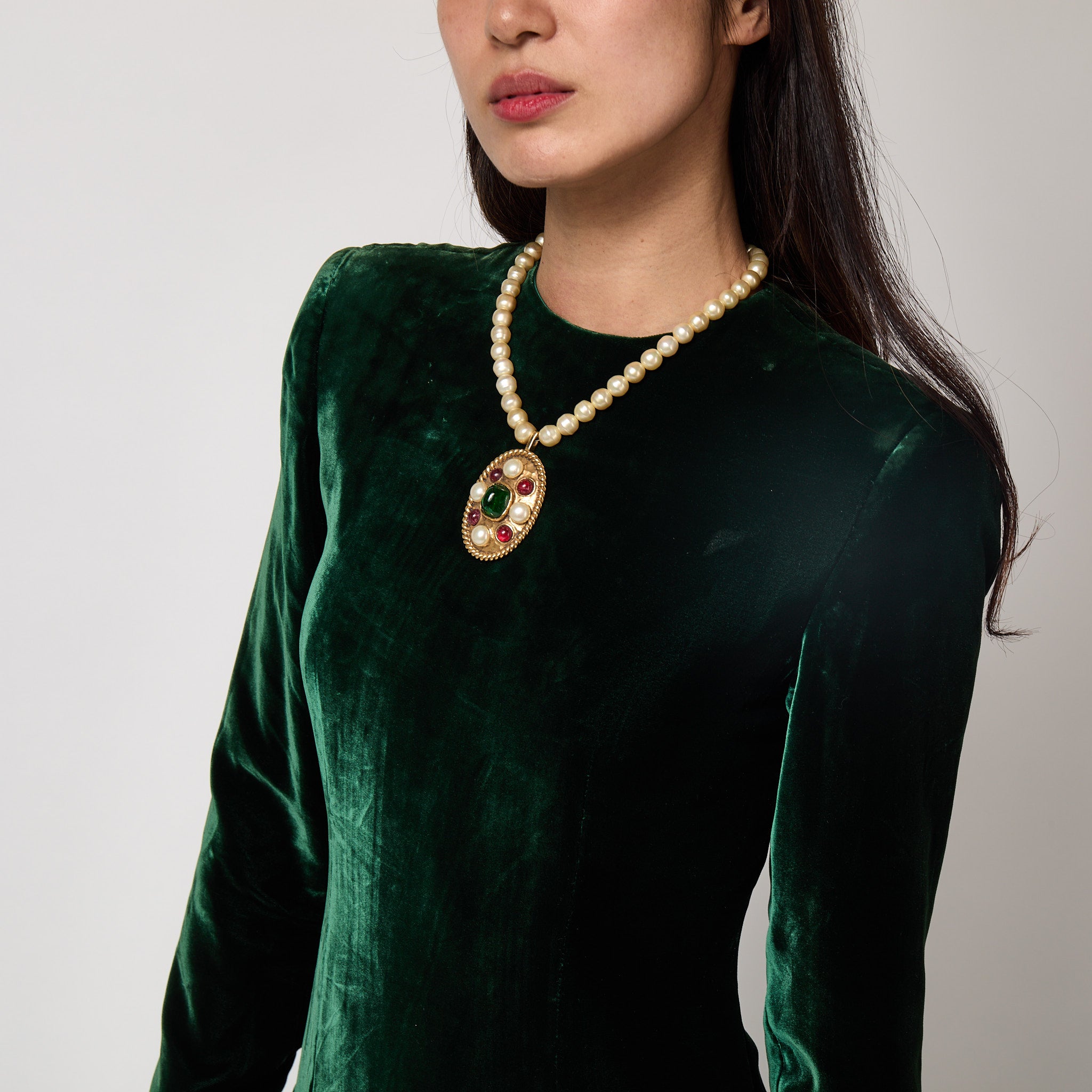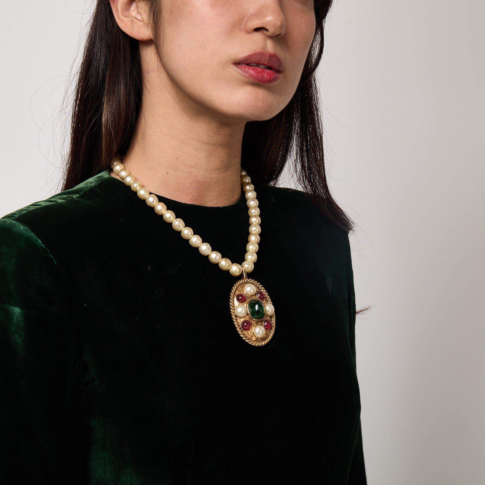 Hanging from a string of large creamy pearls, this chunky, 24ct gold-plated oval pendant has a hammered, organic texture to its surface and is detailed with four circles of gold-plated metal, each containing a hand-poured glossy cherry red glass cabochon. There are four pearls that sit in between these red gems and they all circle a large central emerald green glass cabochon. The edge of the pendant is detailed with a twisting, rope-like motif. The pendant is stamped on the back with the Chanel brand name, the word “depose” and the number “3106”. This incredible piece fastens at the back of the neck with a circular box clasp detailed with a large, 3D double-C insignia.