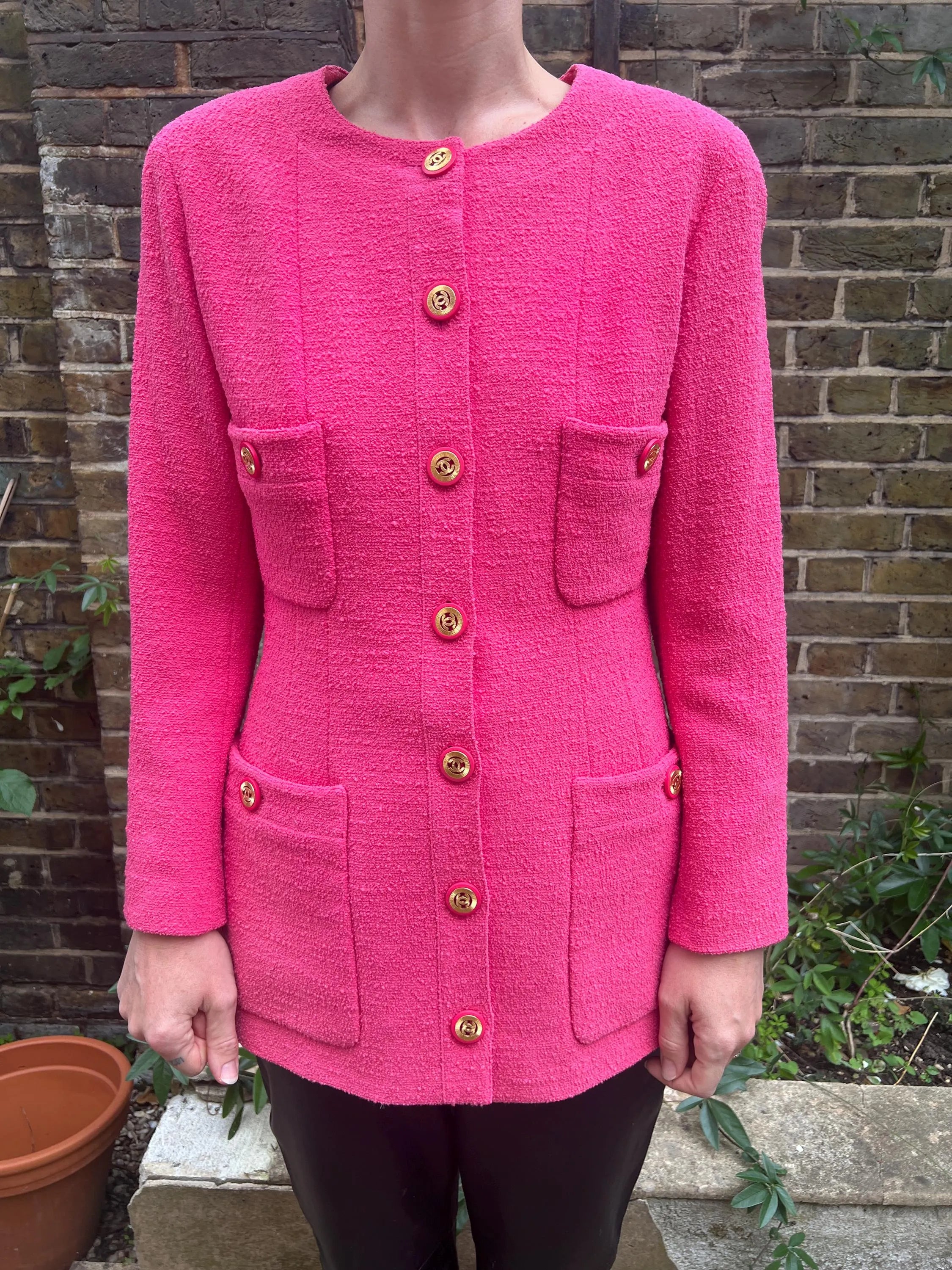 The jacket is tailored from the house’s signature bouclé wool, a luxurious, textured fabric which holds its shape very well. The collarless neck is elegant and the front fastens with seven high-octane logo buttons; textured gold-tone metal forms the brand’s double-C insignia and a surrounding circle, all encased by a circle of hot pink plastic. It has four patch pockets, each fastened with one of the logo buttons. The jacket is tailored to a highly flattering, elongated shape which follows the curves of the body. The cuffs have slits which are finished with three coordinating buttons. The jacket is fully lined in matching bubble-gum pink silk, woven with the brand’s logo.