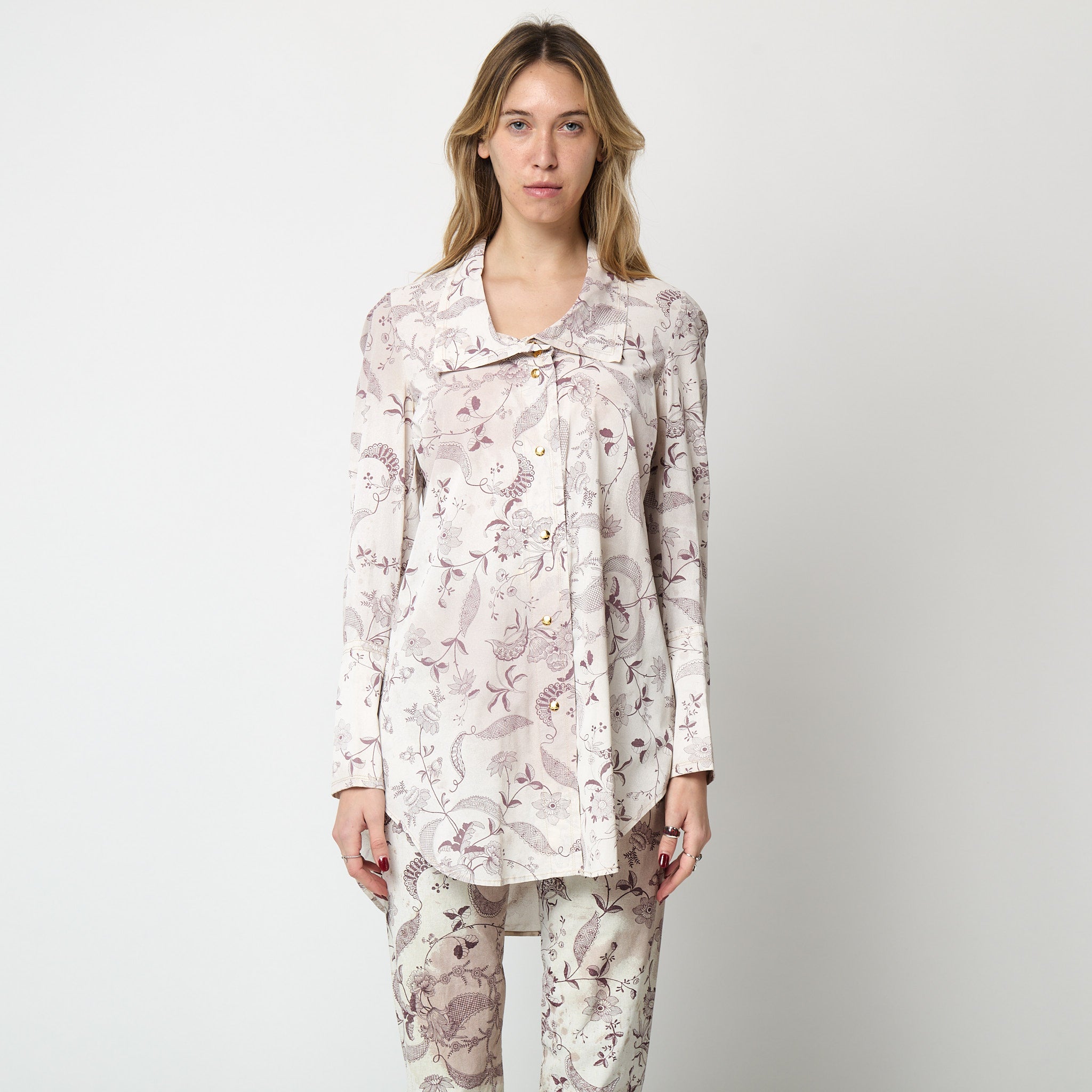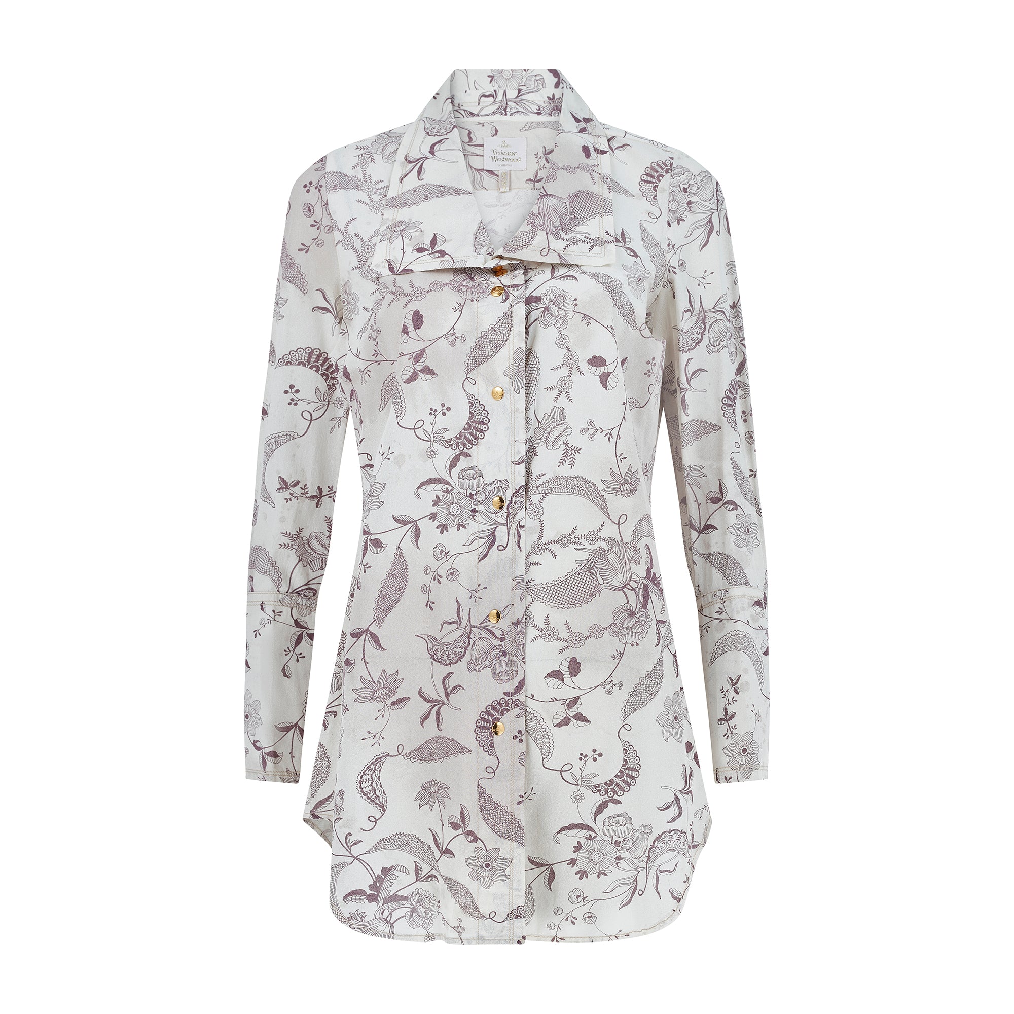 This semi-sheer silk shirt is cut to an extra-long length and a relaxed fit. It has wide single lapels and a lowered scoop-style neckline. It has elongated cuffs and closes down the front with gold buttons engraved with Vivienne Westwood’s instantly-recognisable orb logo. All of the stitching is in pale pink cotton and the shirt is unlined.