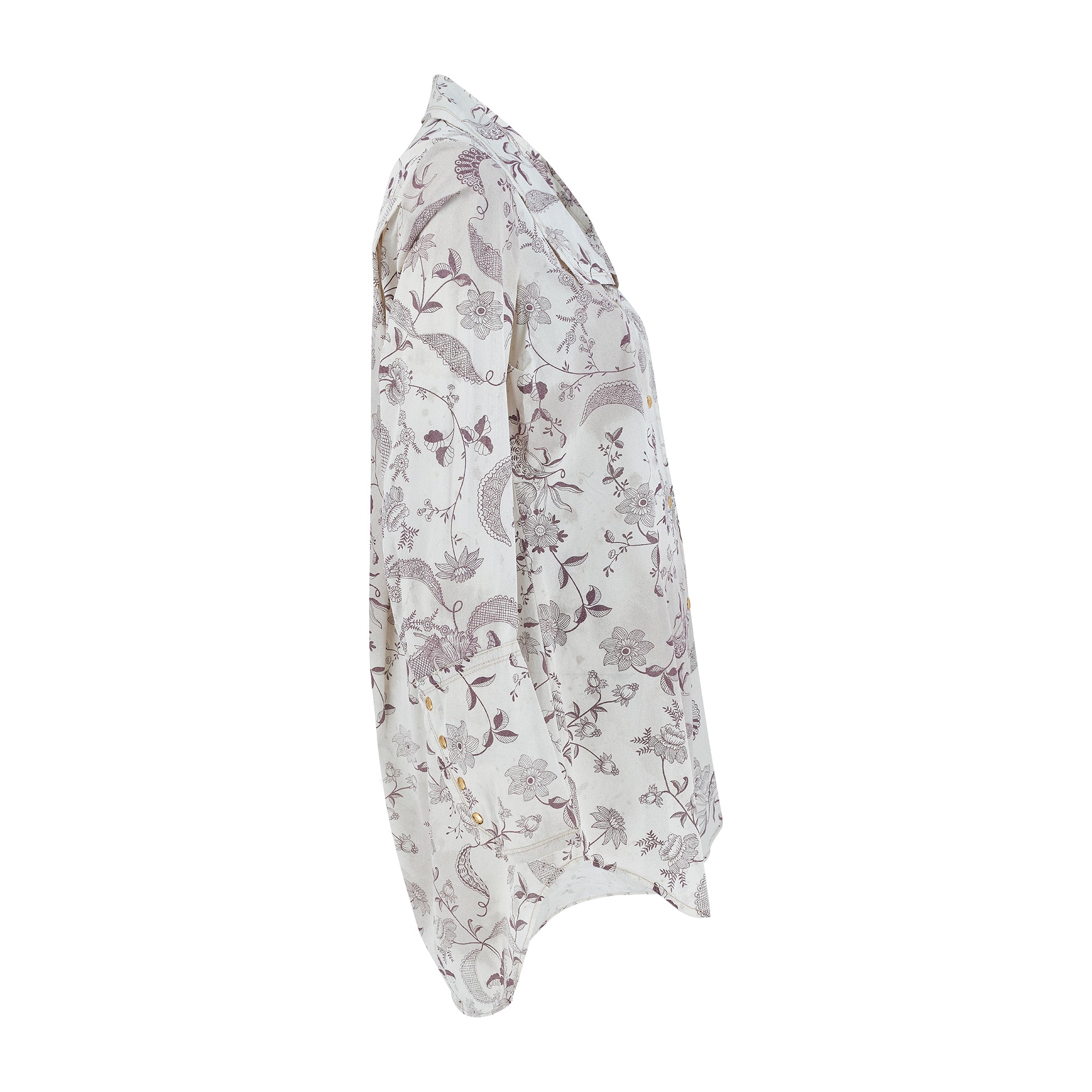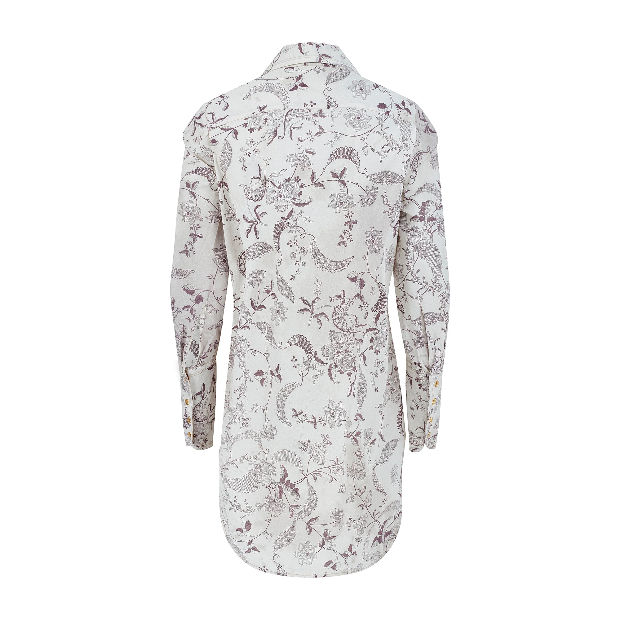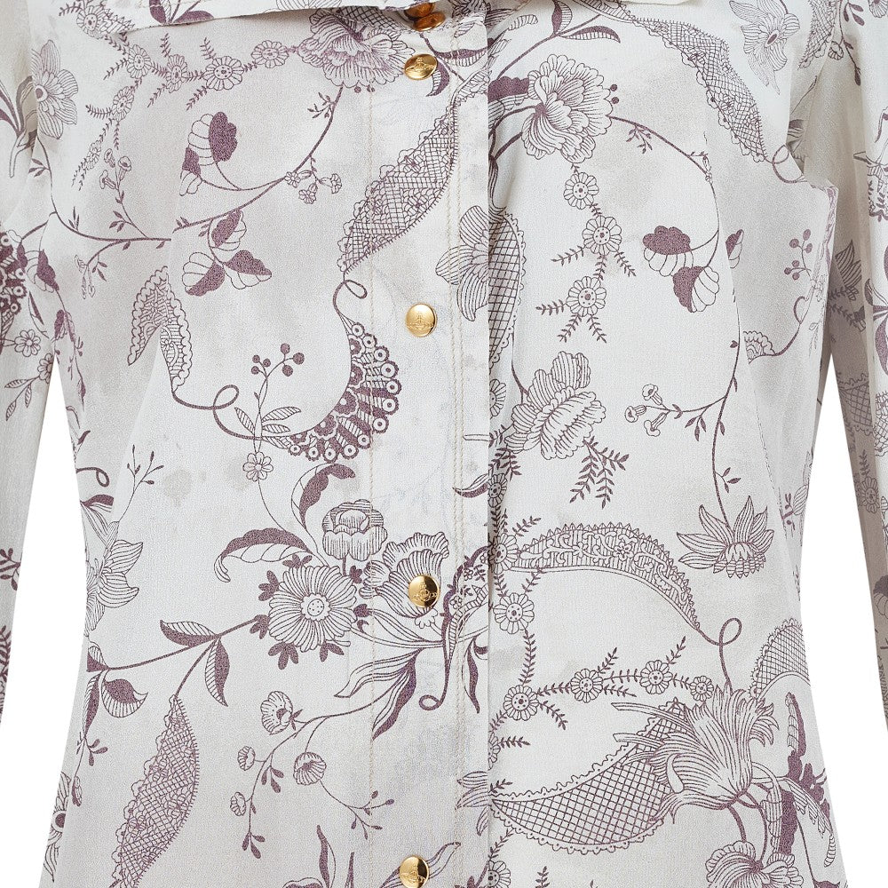 This shirt is an iconic piece of Vivienne Westwood trophy vintage and would be a great addition to the archive of any collector of this label. Made in Italy, it is tailored from coated silk with a stiff, waterproof effect and a canvas-like texture. The print is taken from an Elizabethan wallpaper design. Rendered in a deep aubergine purple, it shows winding, interlaced vines and fantastical florals. Faded burgundy stains smatter the pale ecru background of the cloth, as though the wearer has spilled glass-upon-glass of red wine whilst dancing.