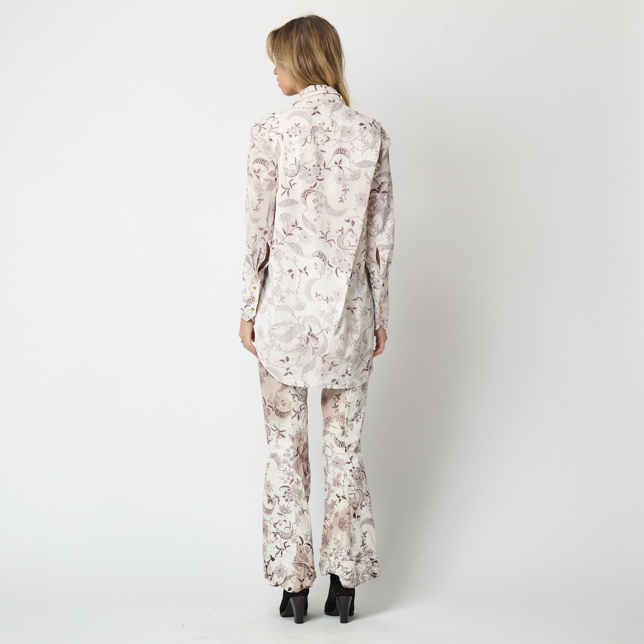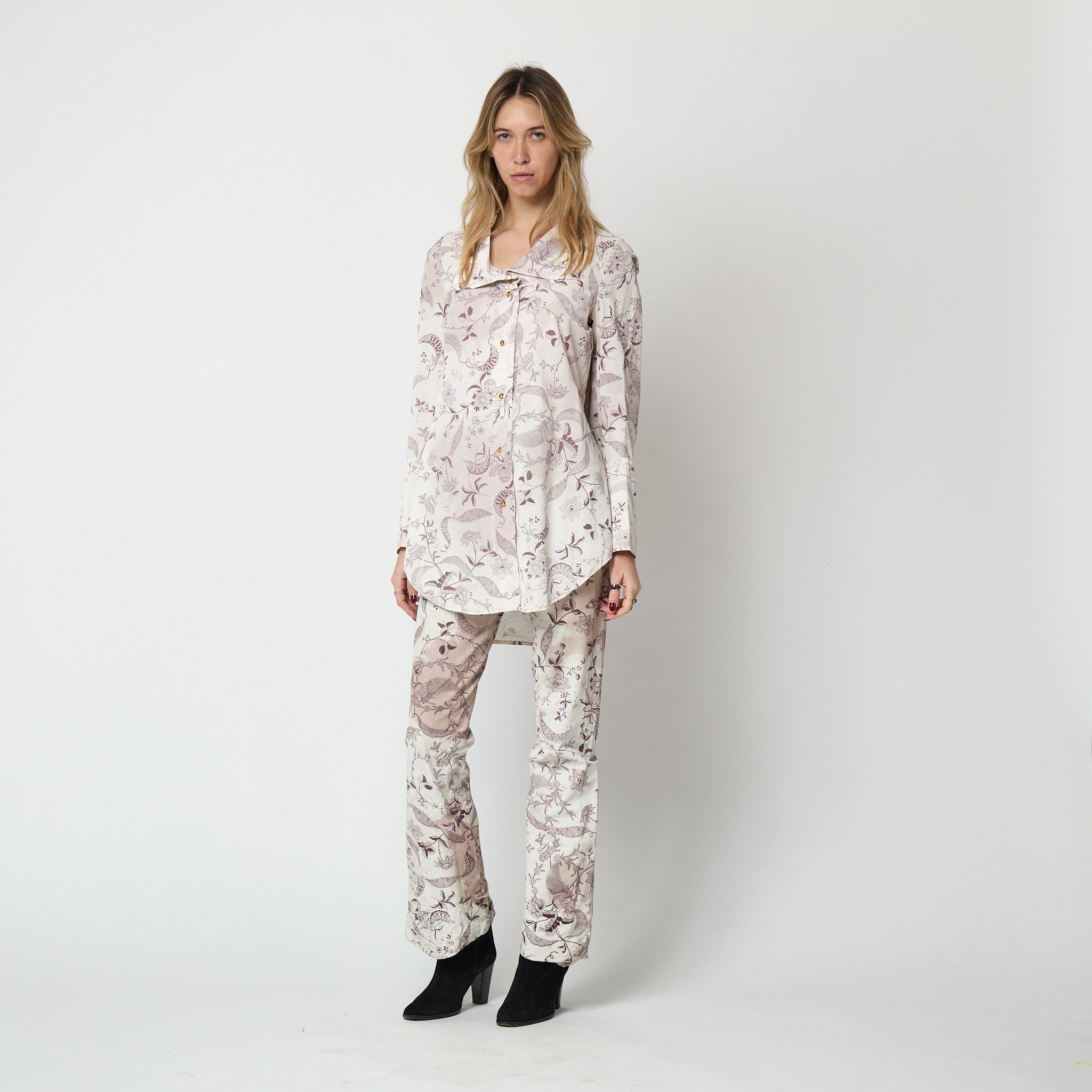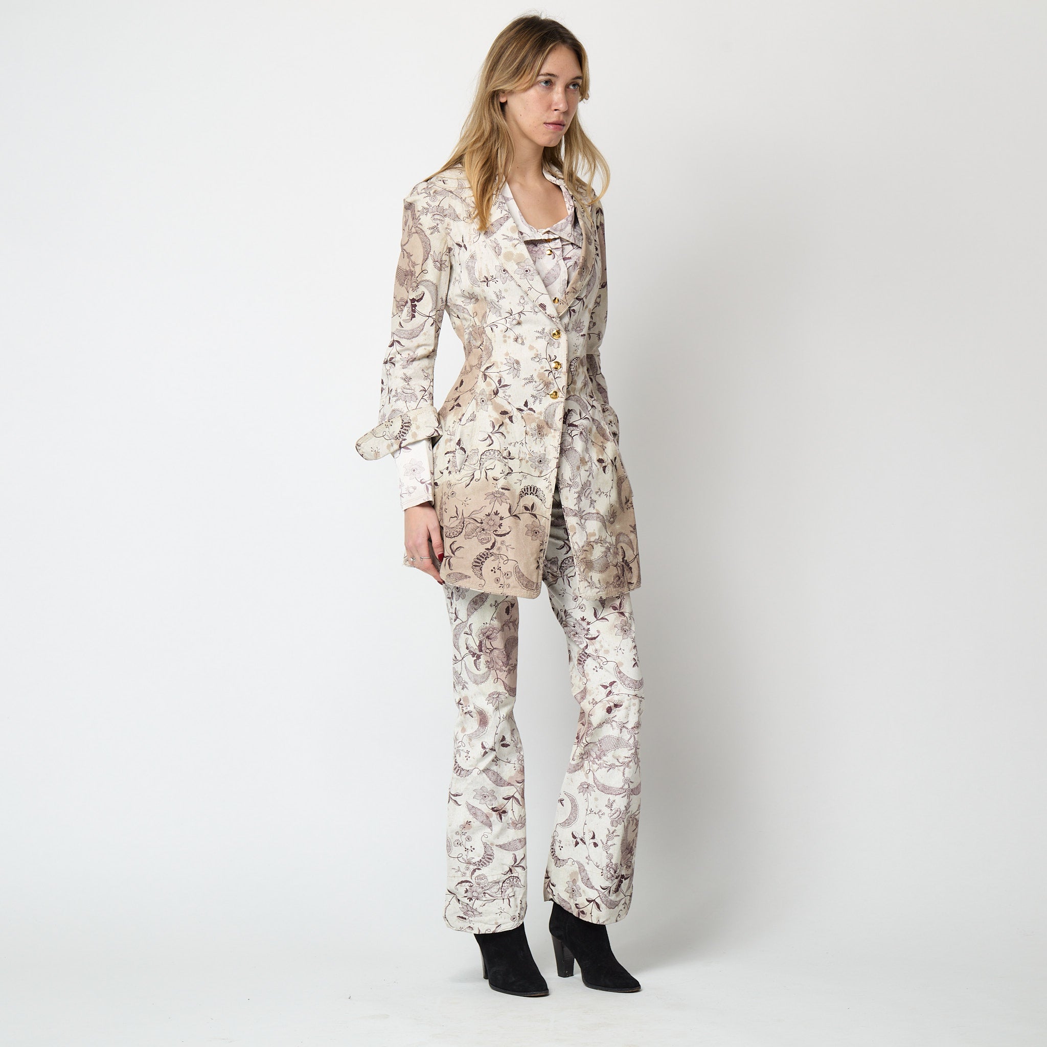 This rare coated-silk shirt was designed as part of Vivienne Westwood’s 2000 show “Summertime”. A jacket and trouser suit in the same print walked as the final look of the show (an ensemble that Circa also has available for sale). The last Vivienne Westwood collection of the 20th century was marked by a bacchanalian celebration. Rife with symbolism representing Bacchus, the Roman god of agriculture, wine and fertility, signs of revelry abounded throughout the runway show. Floral prints and damp-hued fabrics were sabotaged with grass stains and red wine spillage.