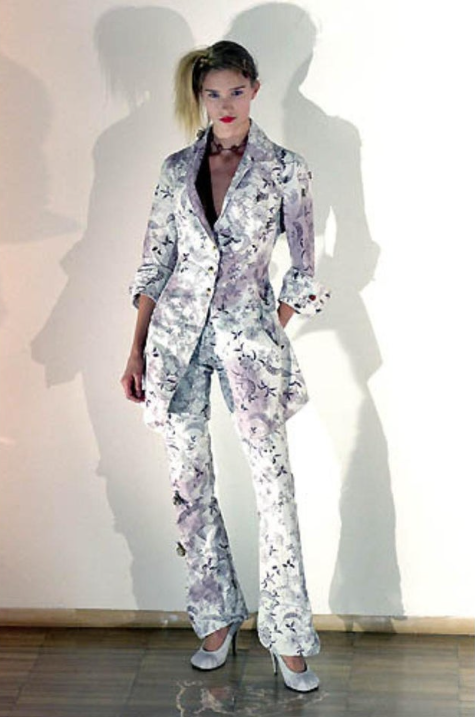 In excellent vintage condition with no flaws of any note. The composition is 100% silk and the shirt is labelled a size UK 14 but vintage Westwood clothing runs small by today's standards. The fabric has no stretch. Our model is a UK 6, US 2 and 5ft 9in. (183 cm). We also have the jacket and trousers ensemble available for sale (as seen on the runway). Please enquire if you would like to purchase the three-piece set.
