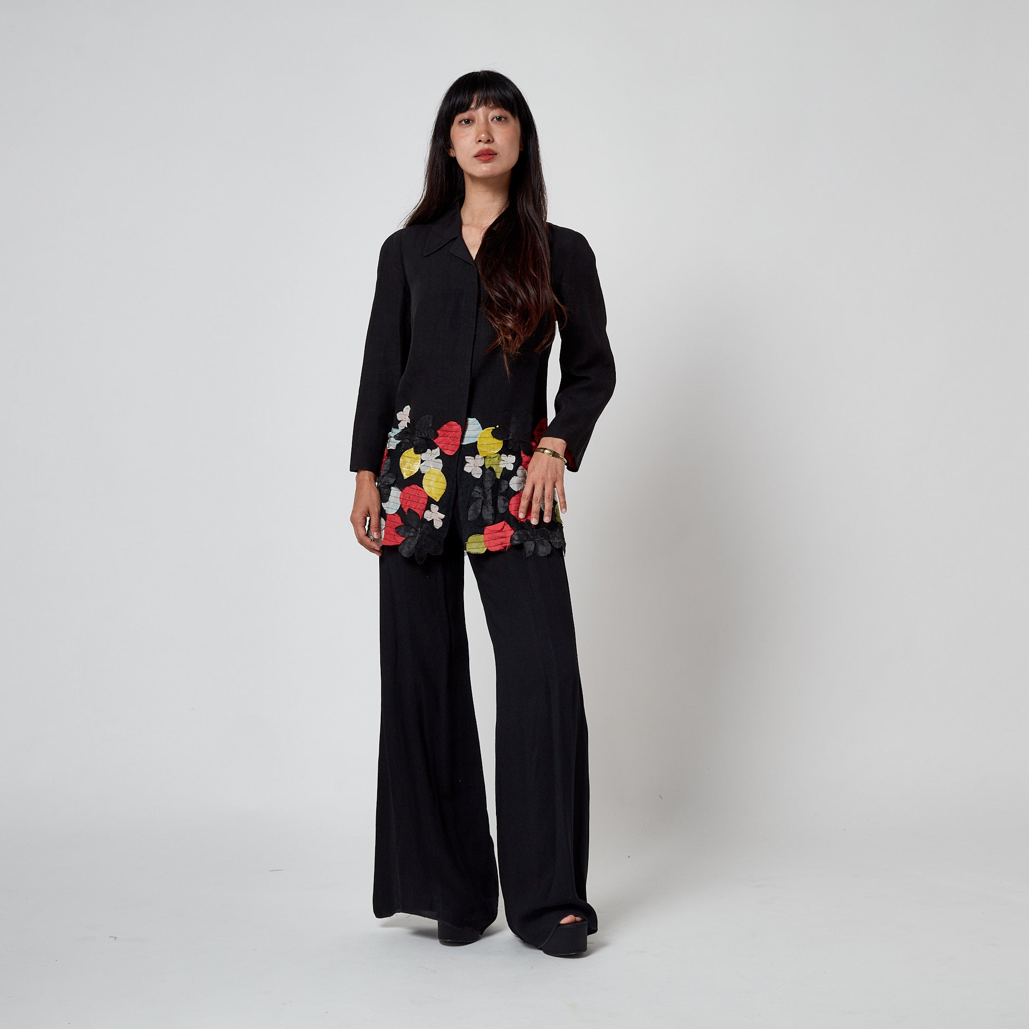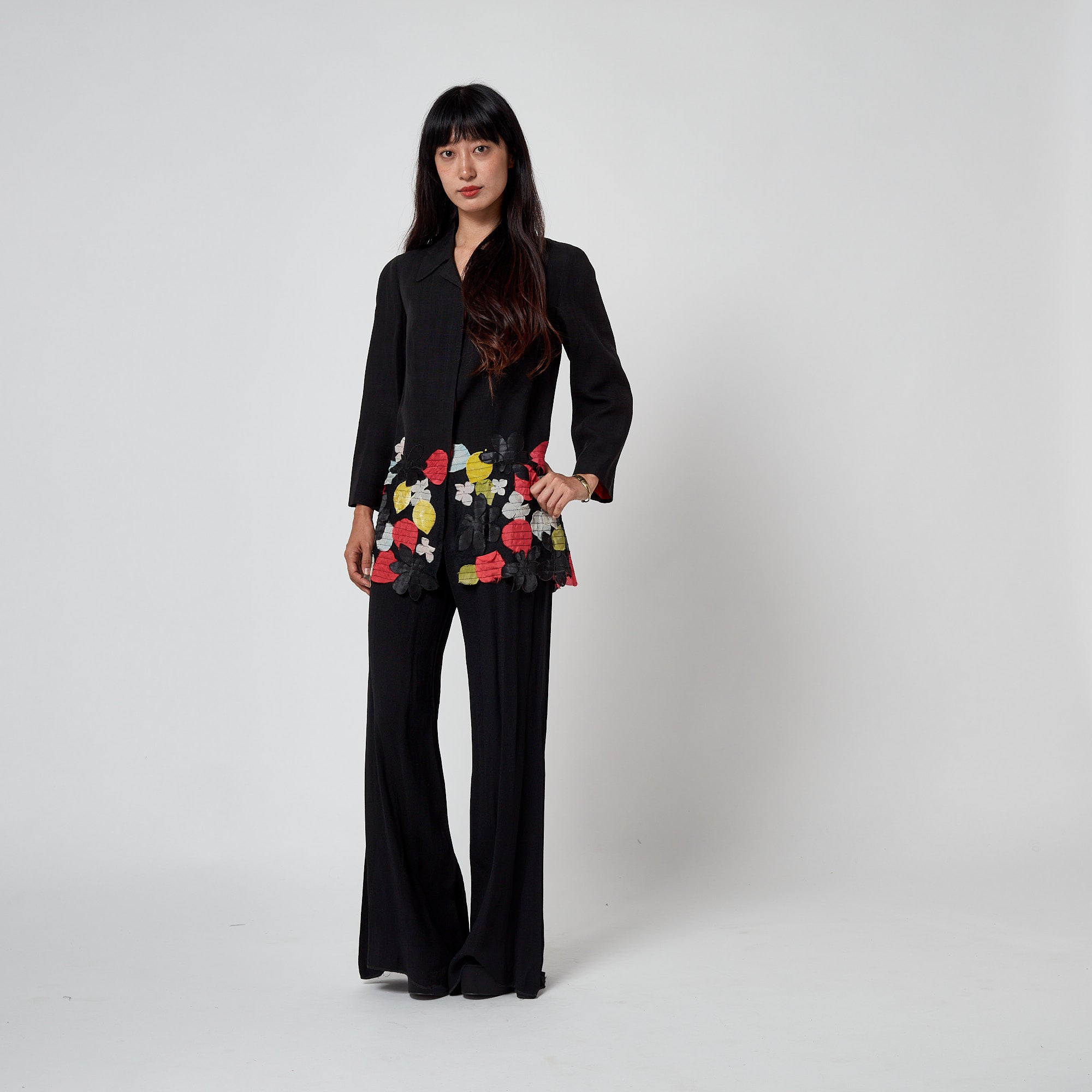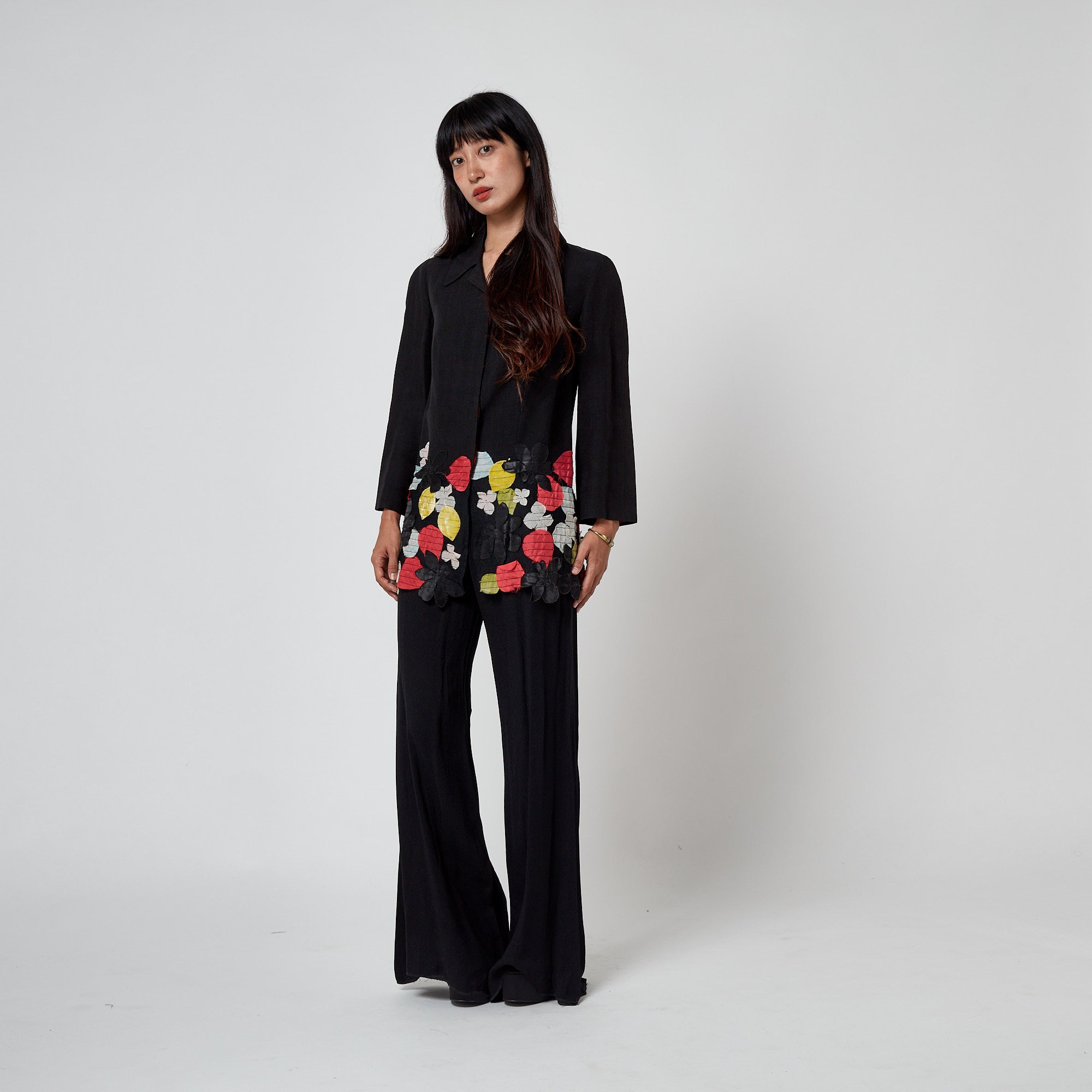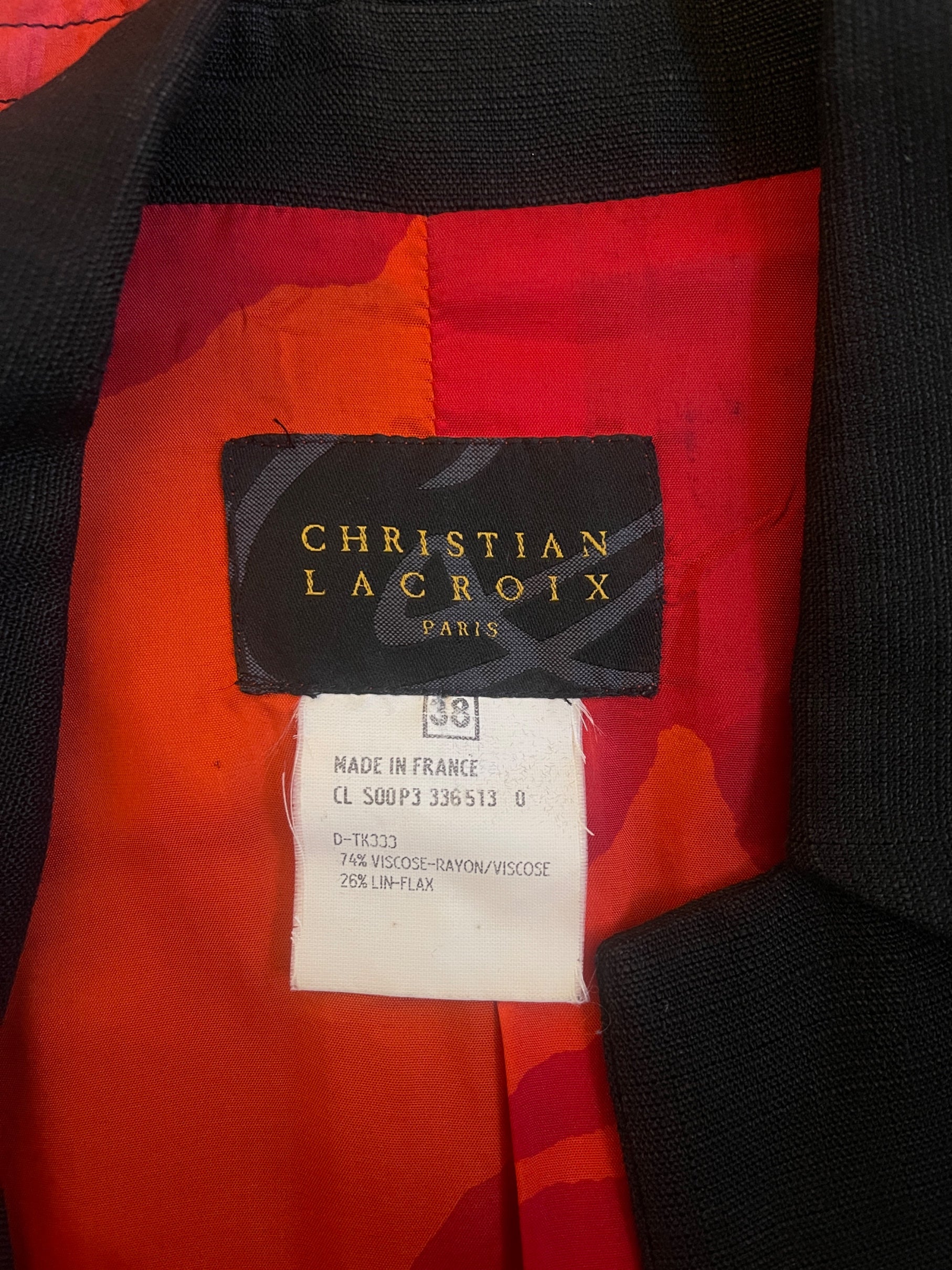 This embellished jacket was designed by Christian Lacroix for his mainline collection at the start of the millennium - circa 2000. It is tailored from black flax-linen which is soft and textured, to a boxy, elongated silhouette. Designed with a pointed collar and a concealed button placket; the buttons fasten into an inner facing lined in vivid red and tangerine silk, matching the full interior lining. Buttons are faux mother-of-pearl printed in black, leaving small polka-dot windows where the natural iridescence shows through. The lower third of the jacket is constructed from black mesh and richly embellished with appliqué flowers and petals in silk chiffon, velvet, and satin. The colour palette of these petals includes red, pale blue, yellow, green, black, and white - an expressive, signature Lacroix palette.
