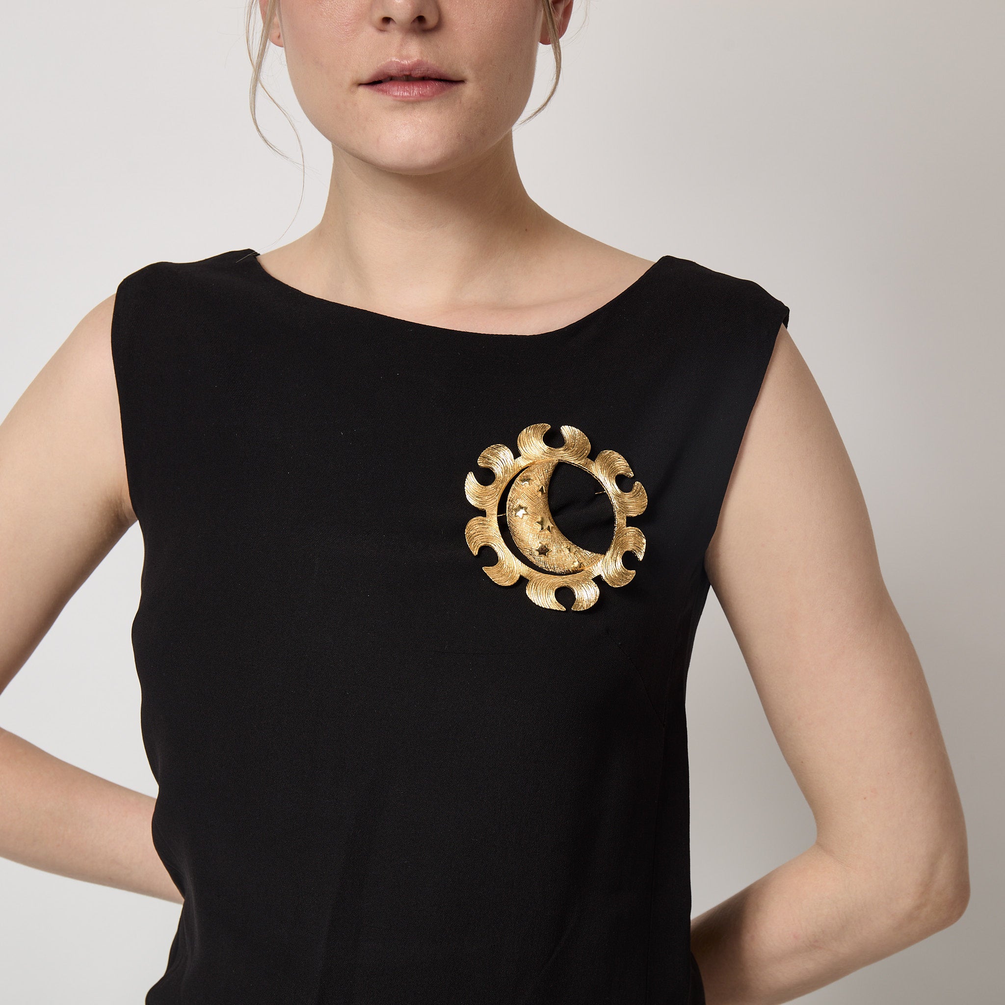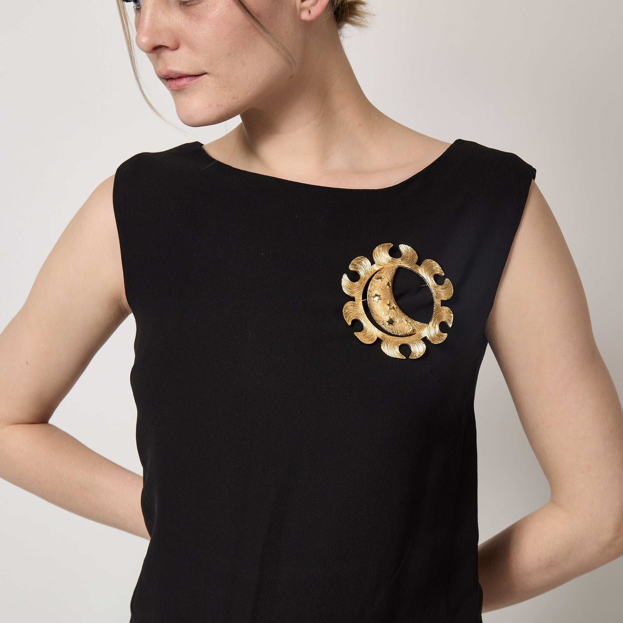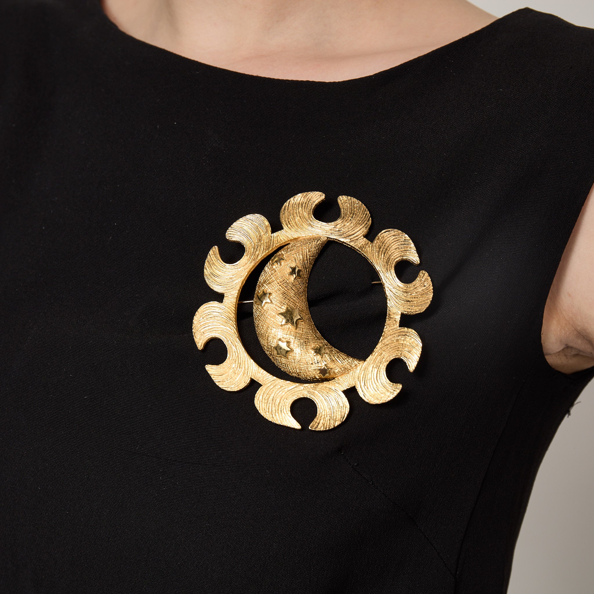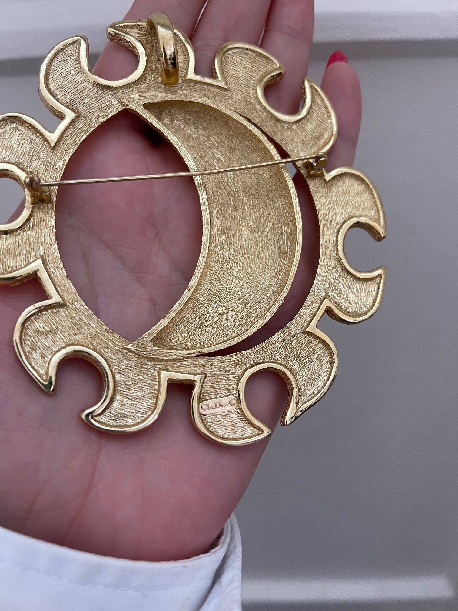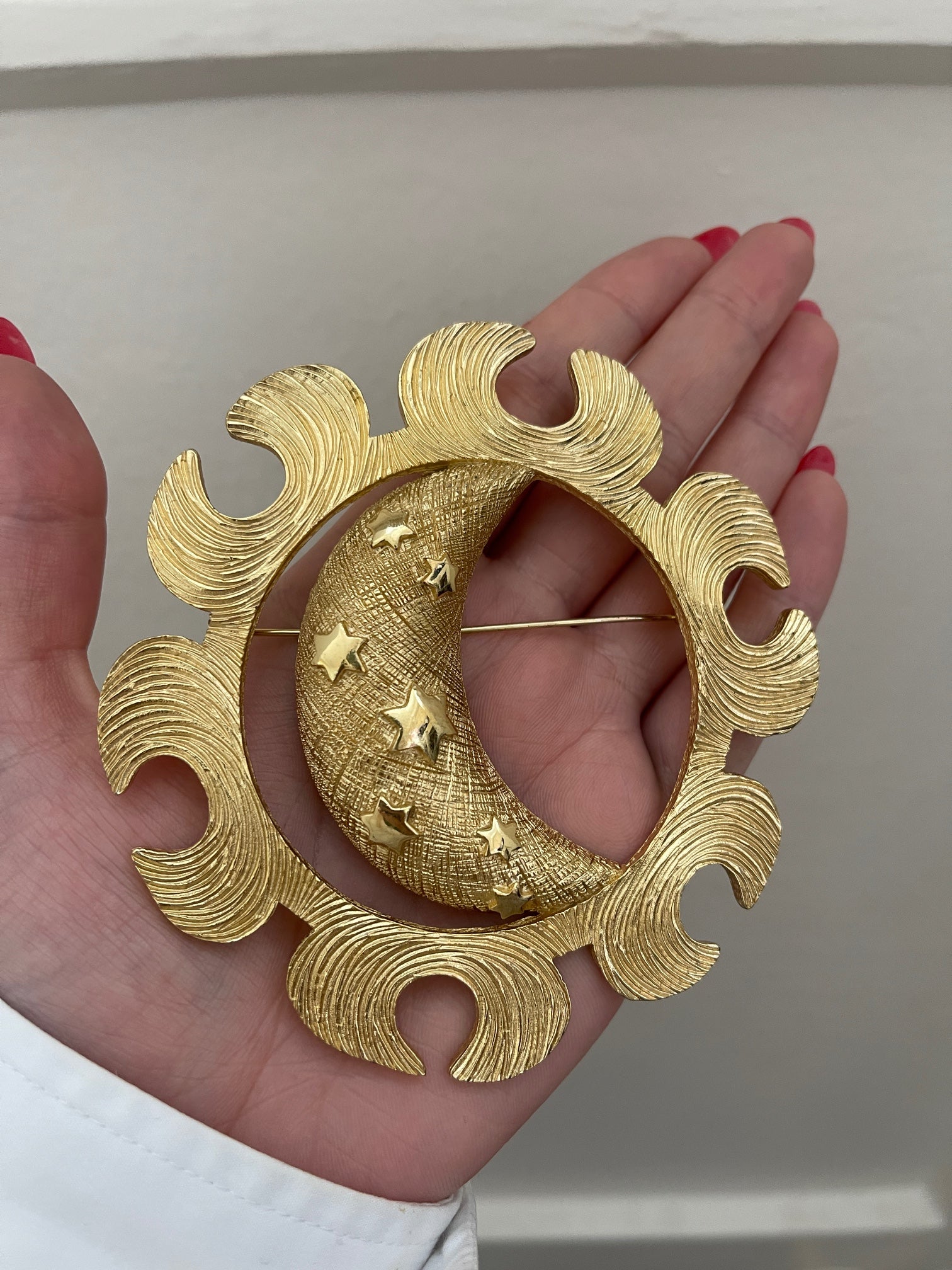 Drawing on celestial motifs, it forms a large crescent moon surrounded by a circular stylised sun. The moon has a textured criss-cross surface detailed with debossed stars. The sun has organic, curved lines swirling across its surface. The back features a long clasp which is secured with a C-clasp. There is a stamp on the rear of the brooch that reads “Chr. Dior”. This brooch is in excellent vintage condition with no flaws and no wear to the gold anywhere.