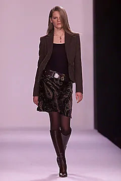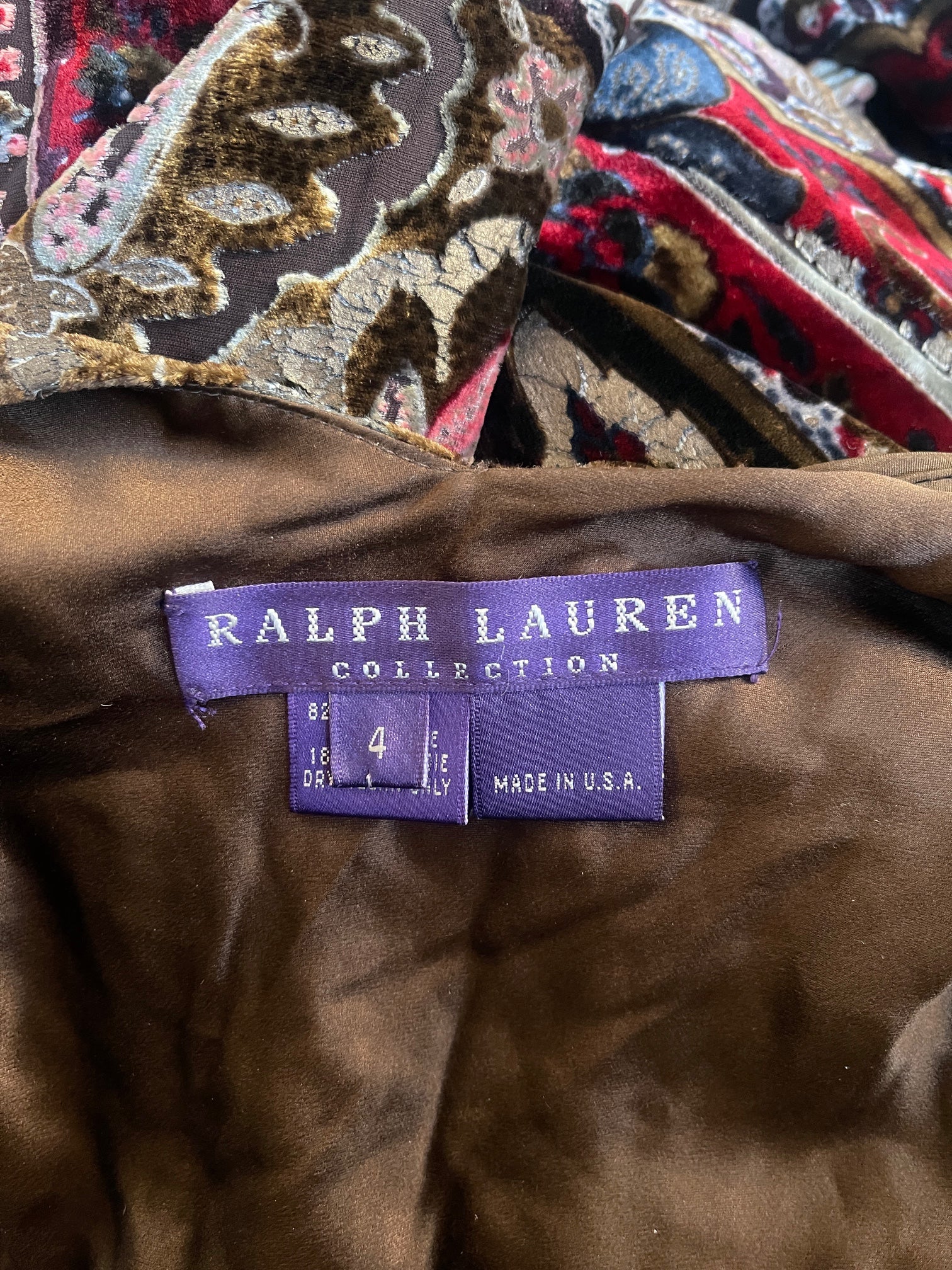 This beautiful gown was designed for Ralph Lauren’s Fall 2001 Collection - the House's most luxurious runway line with its sumptuous purple label. On the runway the brand showed a maxi skirt and mini-skirt in the same print which Vogue called lavish in its review. The dress is tailored from a silk-mix velvet printed with paisley in rich hues of chocolate brown, crimson red, steel blue, rose pink and grey. It is cut to a simple slip style that is so of this late ’90s/early ’00s era, with a low back, V-neckline and rolled brown satin straps that cross at the top of the back. Lined throughout with a silky chocolate brown satin, and pulls on over the head so has no fastenings. The dress has a train which adds to the sensuous, free flowing tailoring. The bottom of the skirt has a brown satin finger loop to allow the wearer to lift the gown off the floor.