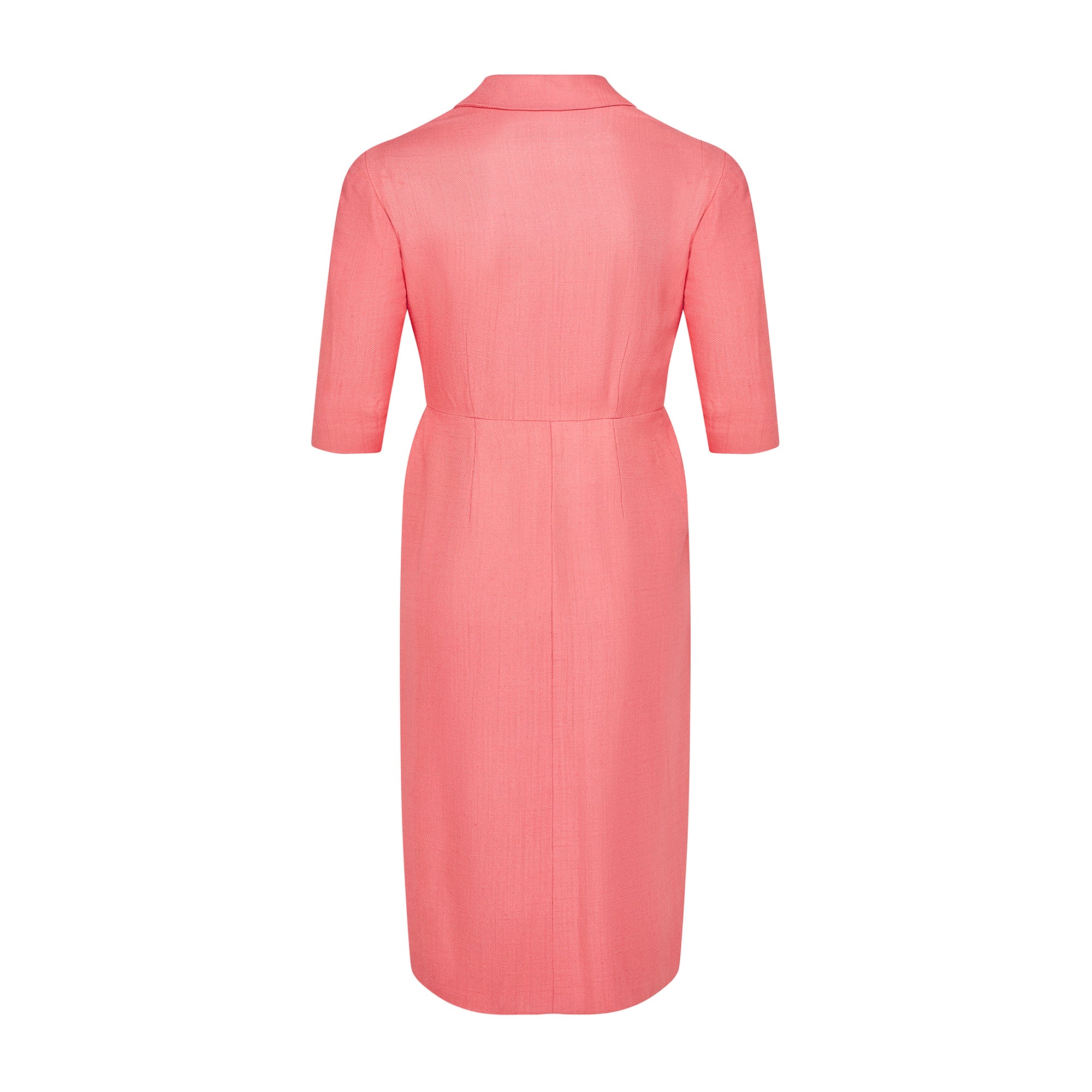 This pretty candy-pink linen dress is tailored to a laid-back day-dress style. It has an open-collar and button down front, secured with a large tonal pink plastic button and hidden hook-and-eye clasps. The sleeves are slightly cropped - perfect for showing off jewellery on the wrist. The skirt is softly pleated and falls to calf length. It is adorned with two large tonal buttons and attached to the top of the dress with hidden hook-and-eye clasps and a hidden zip. The skirt is partially lined with white crepe.