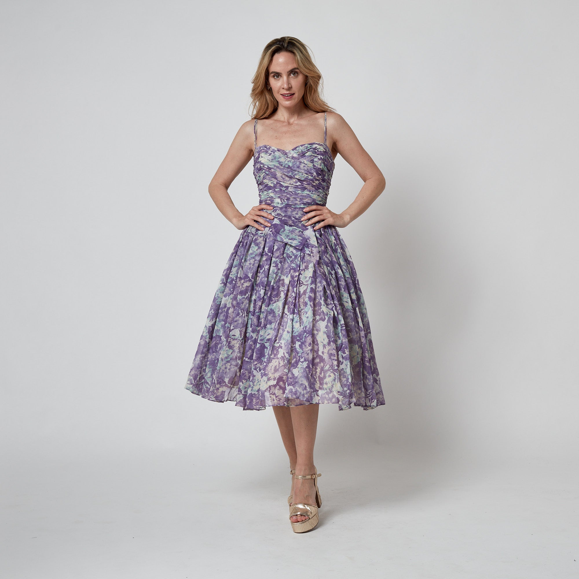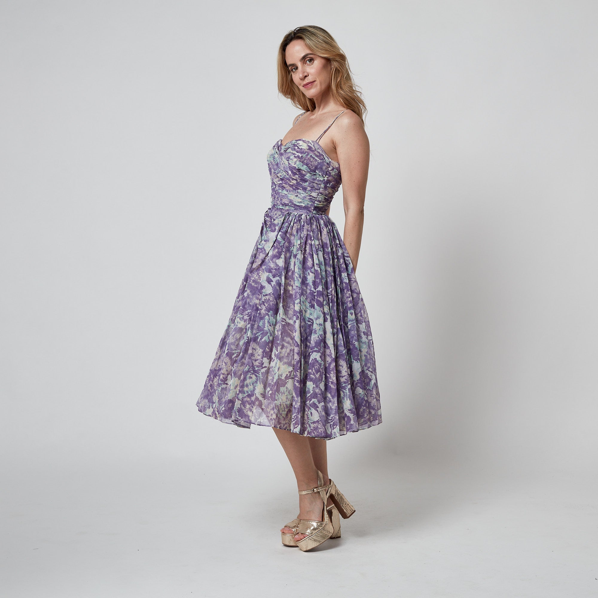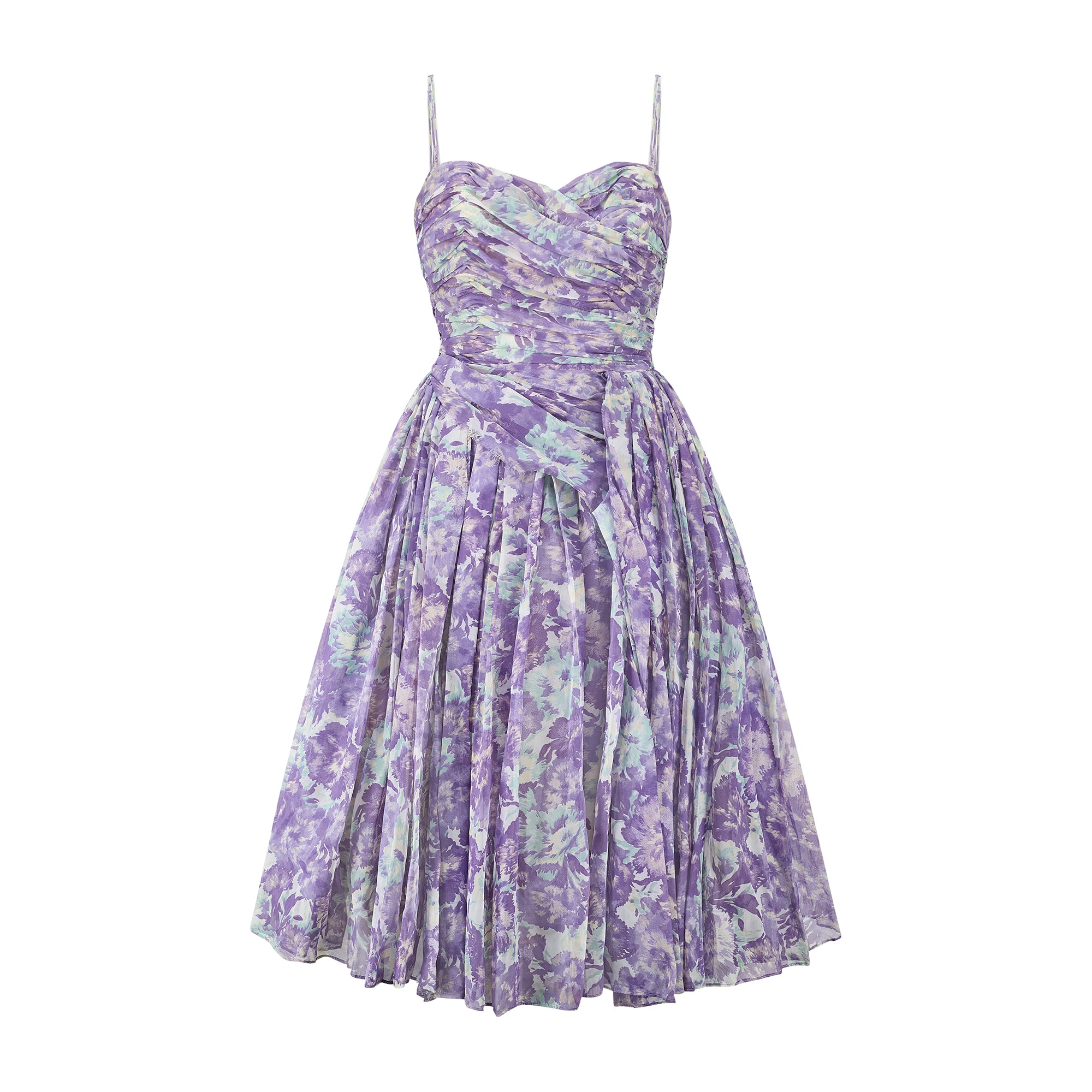 An exceptional late 1950s dress tailored from a lightweight manmade organza fabric. Printed all-over with a pretty floral pattern in a muted palette of lilac and turquoise hues. The silhouette is classic 1950s: the ruched organza top has a sweetheart neckline and is held aloft by four tiny spaghetti straps in coordinating organza, the waist is cinched with boning and the skirt is full. The skirt is lined with a thick, stiff muslin and white tulle to add volume. The organza that is layered over it is tucked and pinned to form a sash across the front of the dress. It fastens at the centre back with a hidden white zip and hook-and-eye; fully lined with cream satin.