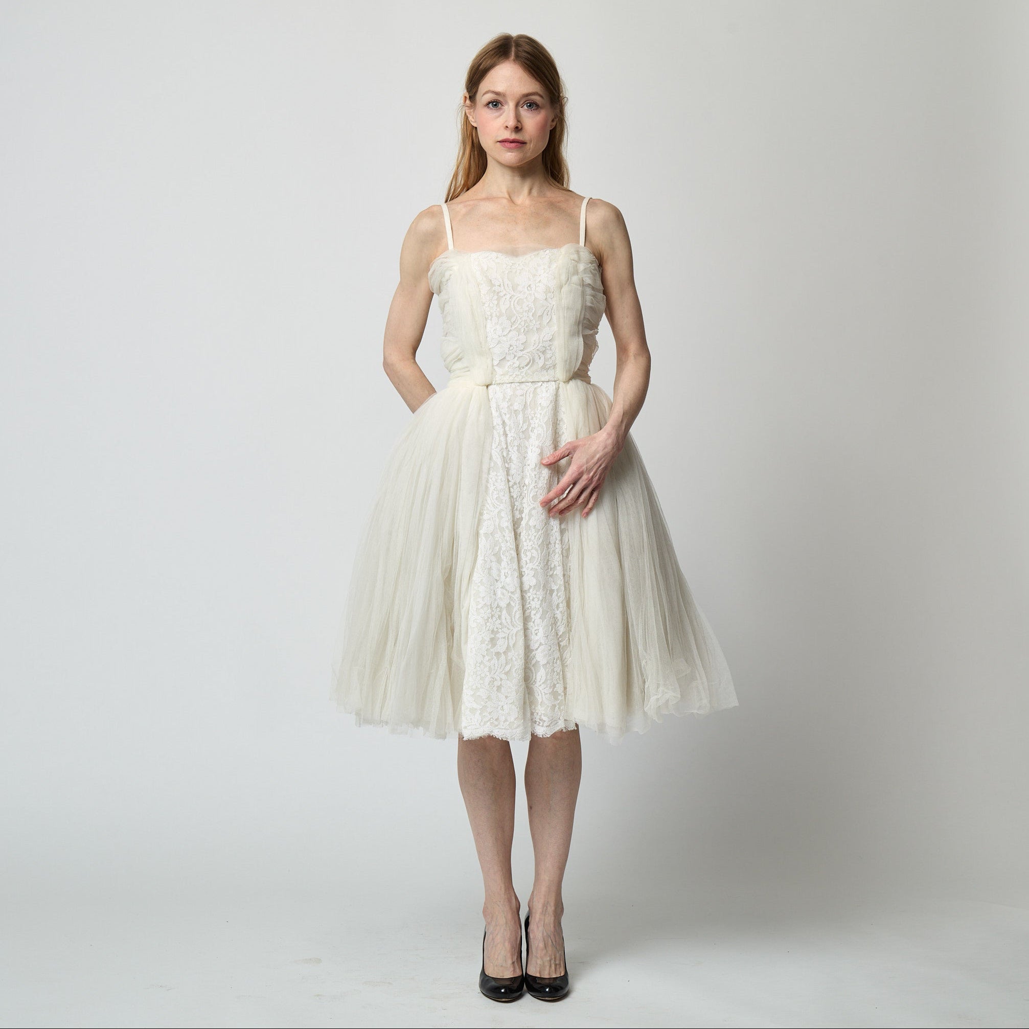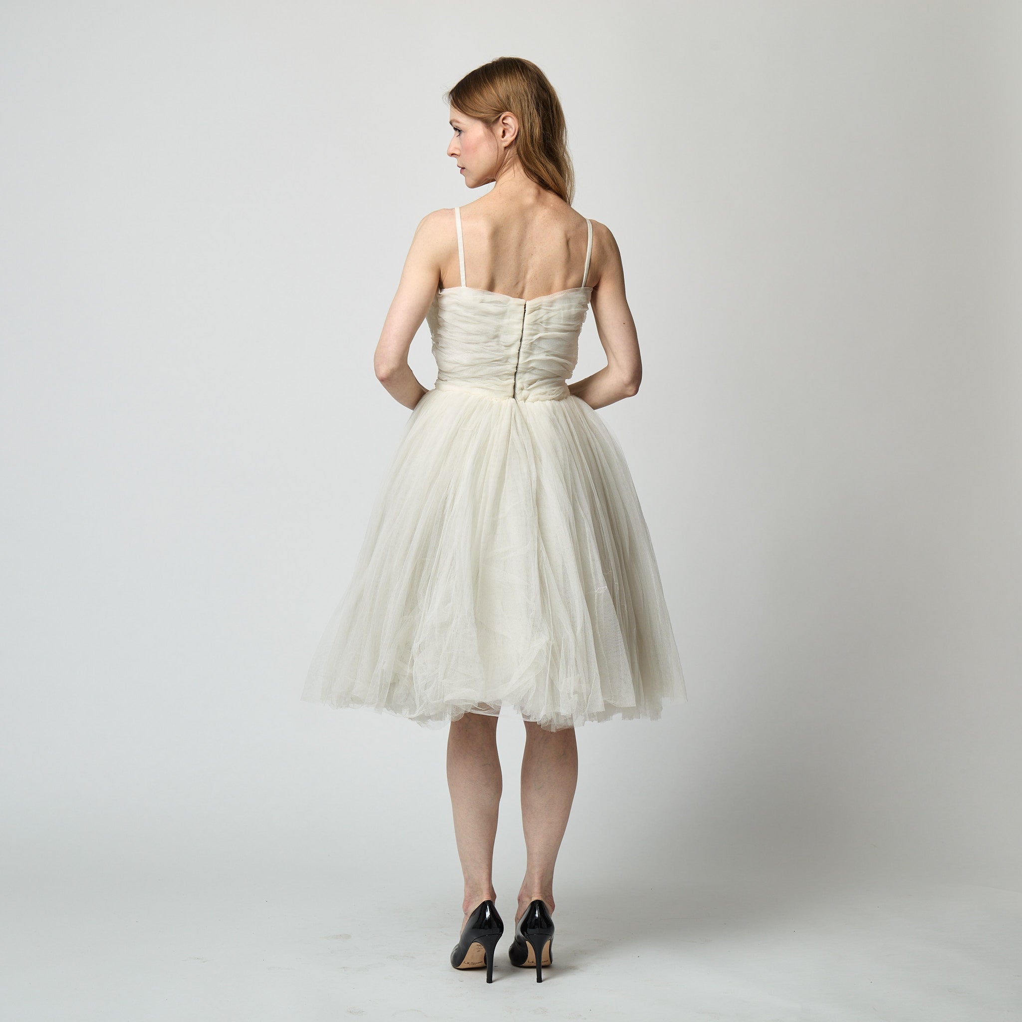 An exquisite example of 1950s bridalwear and made in Italy using alta moda (haute couture) craftsmanship. Reflecting the decade’s romantic ideal of femininity, this charming mid 1950s wedding dress is crafted from layers of stiffened white tulle, creating a voluminous, ballerina-like silhouette. The dress falls just below the knee and follows the classic 1950s line of a fitted bodice, nipped-in waist, and full skirt. The sweetheart neckline is overlaid with a sheer tulle panel for modesty and is held by delicate spaghetti straps. The bodice is beautifully ruched and pleated down the sides, giving a textured, airy finish, while the centre front is adorned with a vertical lace panel that continues through the skirt. The skirt itself is composed of a remarkable eight layers of tulle, a cotton organza underskirt and lastly, a white synthetic petticoat for comfort and structure. The dress fastens at the centre back with a tonal zip and hook-and-eye. The original label reads “Spagnol Venezia”.