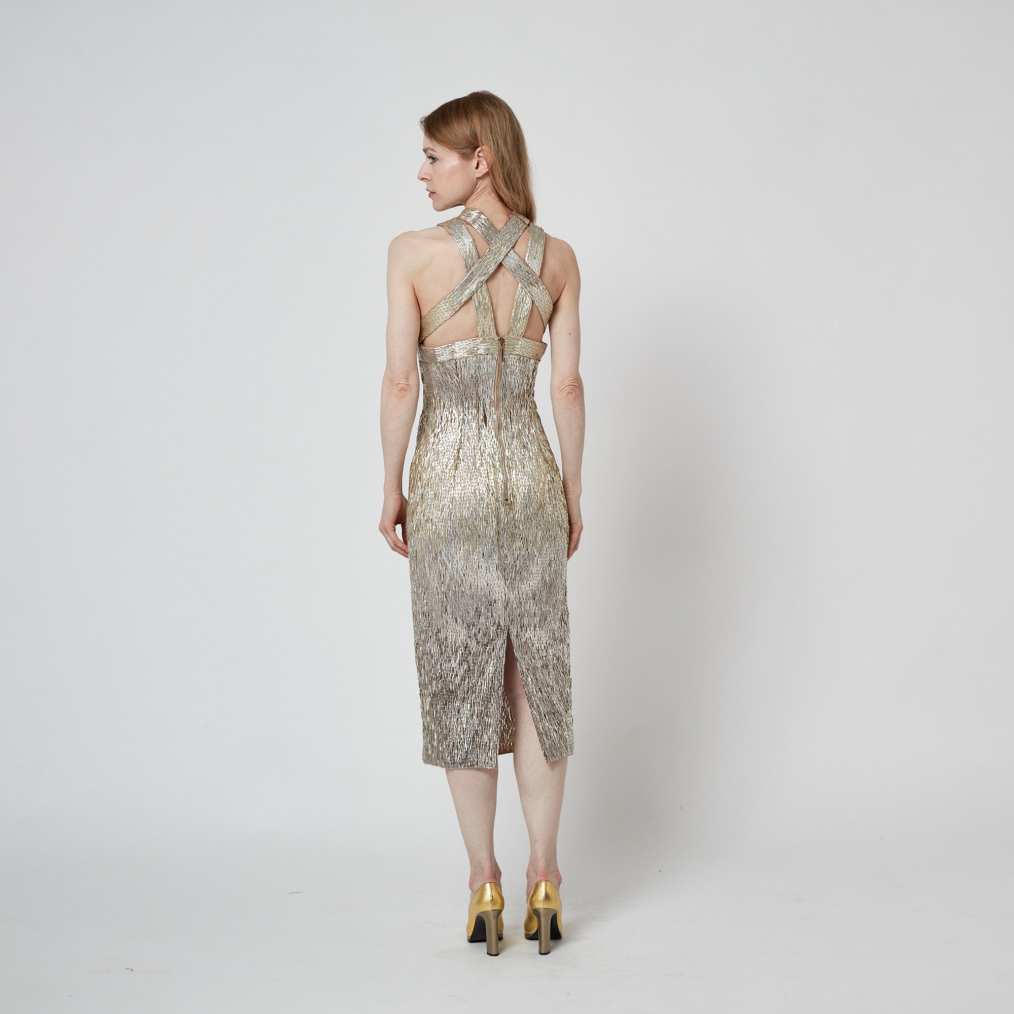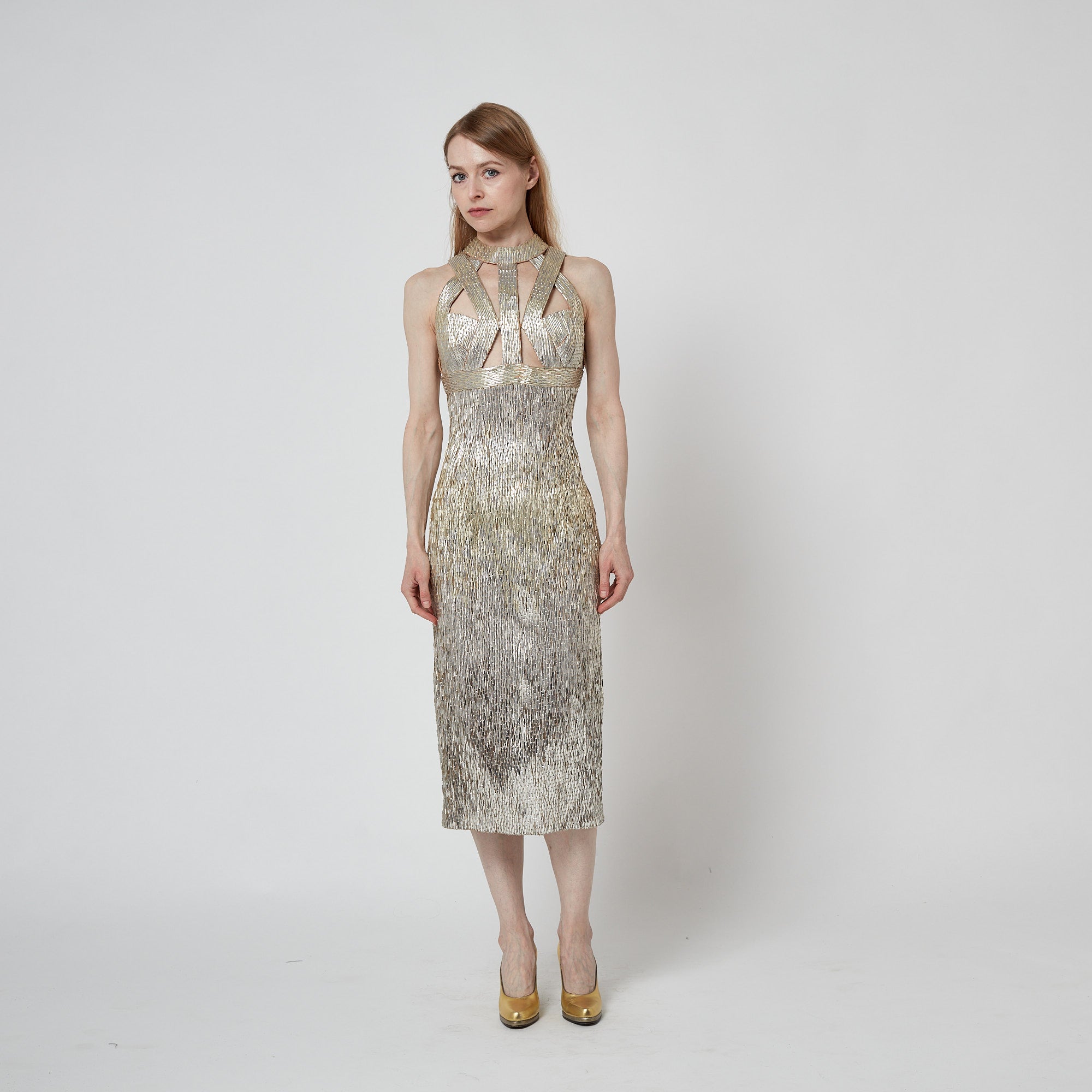 Walking the runway as look 31/57, this dress was a glittering disco-ball in a collection that was monochrome in the majority. Tailored from a fine mesh in a pale nude hue, it has a body-con silhouette with an intricately crafted cage top. The dress is elaborately sequinned all-over with large rectangular paillettes in a champagne hue that look silver or gold depending on how the light hits. Up close, the embellishment is incredibly detailed. The paillettes are all individually stitched at each end with a tonal thread onto the mesh. At the rear, the cage top gives way to two chunky embellished straps which meet in the middle of the back. The strap which forms a choker at the neck crosses the back straps and is secured under the arm with hook-and-eye clasps. The dress is unlined. It fastens at the centre of the back with an exposed gold-tone zip and chunky gold-tone zip-pull.