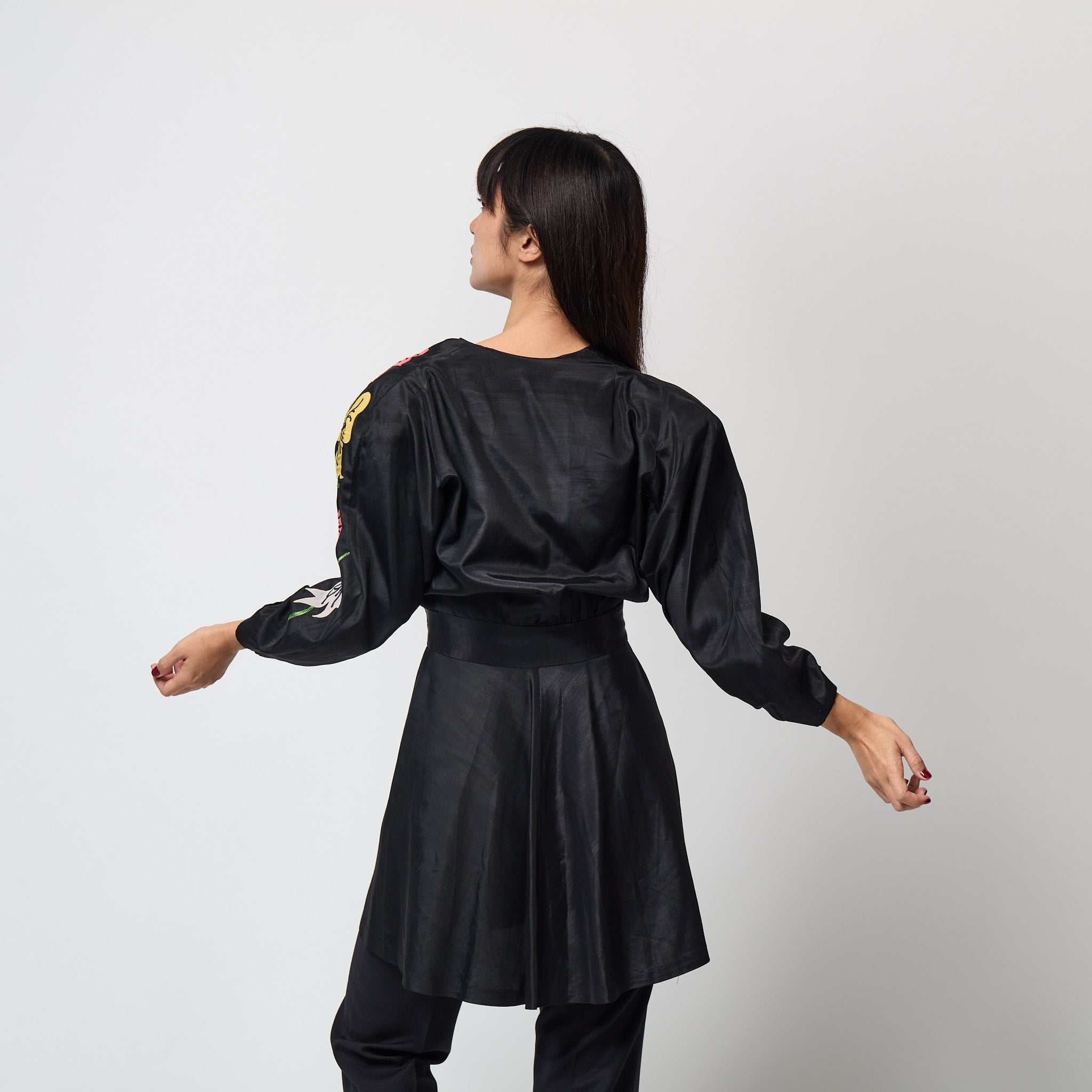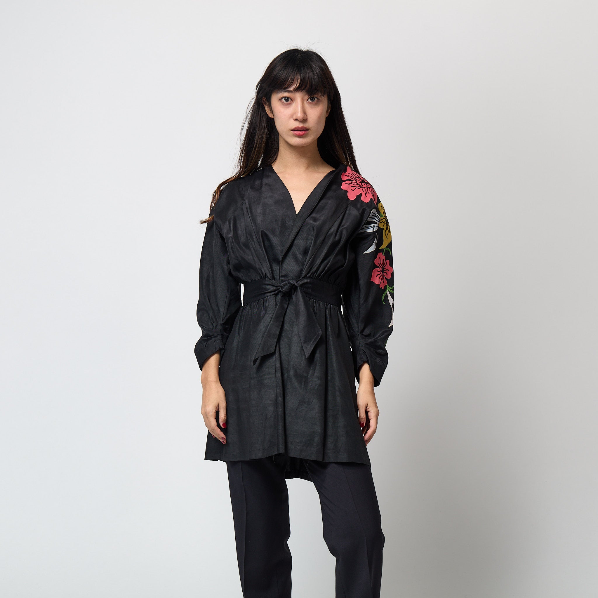 This original late 1940s kimono style jacket is tailored from a rich black, man-made grosgrain fabric which has a lovely texture and sheen. Imbued with a sense of fun, the flared cut swirls around the wearer. The left sleeve is adorned with bold appliqué flowers and foliage in coral pink, yellow and pale grey, finished with vibrant green embroidered vines. It is cut with a wrap-around silhouette which ties at the front, allowing for a flexible fit. We love it worn with black wide-leg trousers or with bare legs if you dare as it is a longer fit.