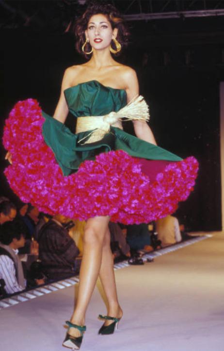 Guy Laroche (1921–1989) was a Parisian couturier celebrated for refined, wearable glamour. He launched his fashion house in 1957, helping to define modern French ready-to-wear in the 1960s and 1970s while maintaining couture-level craftsmanship. These earrings were worn by a model on the runway for Laroche's Spring 1992 haute couture collection. Crafted from gold-plated metal woven to a mesh formation, they form a large leaf shape. The sculptural leaves are shaped to sit with the stalk over the ear, then curling theatrically down to chin length and back behind the ear. There is a clip-on clasp on the back.