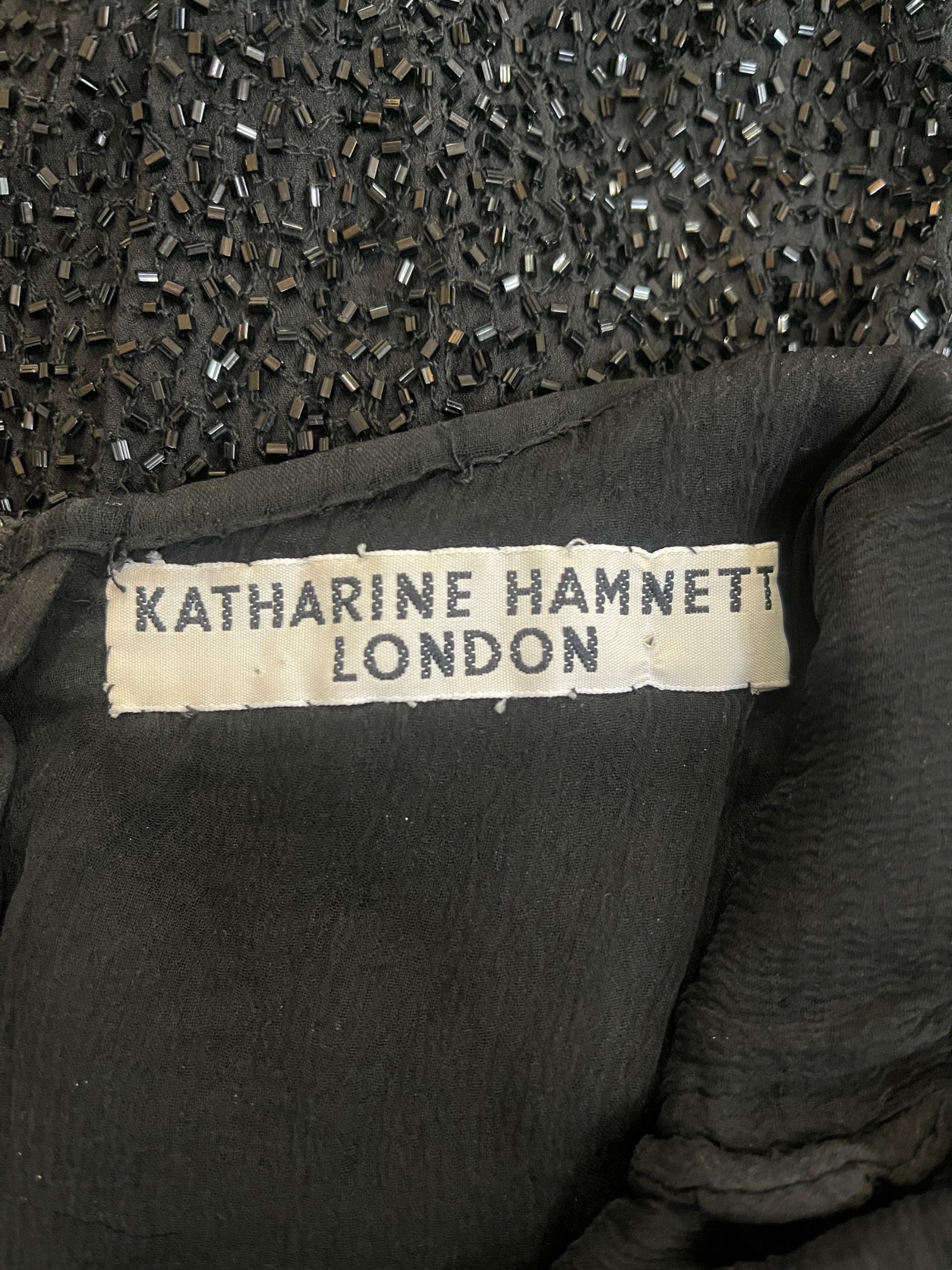 This 1990s beaded slip dress was designed by iconic British brand Katharine Hamnett. The designer, Katharine E. Hamnett, founded her namesake label in 1979 and was a founding design member of the British Fashion Council when it began in 1984. This charismatic floor-length gown is smothered in zig-zagging black bugle beads which catch the light as the wearer moves. Triple rows of these beads trim the hems and travel up over the spaghetti straps. It is tailored to a cami-top shape with a curve-skimming silhouette and has a rounded neckline which is mirrored at the rear. It fastens at the back with a tonal zip and hook-and-eye clasp. Lined with a very fine sheer black silk chiffon.