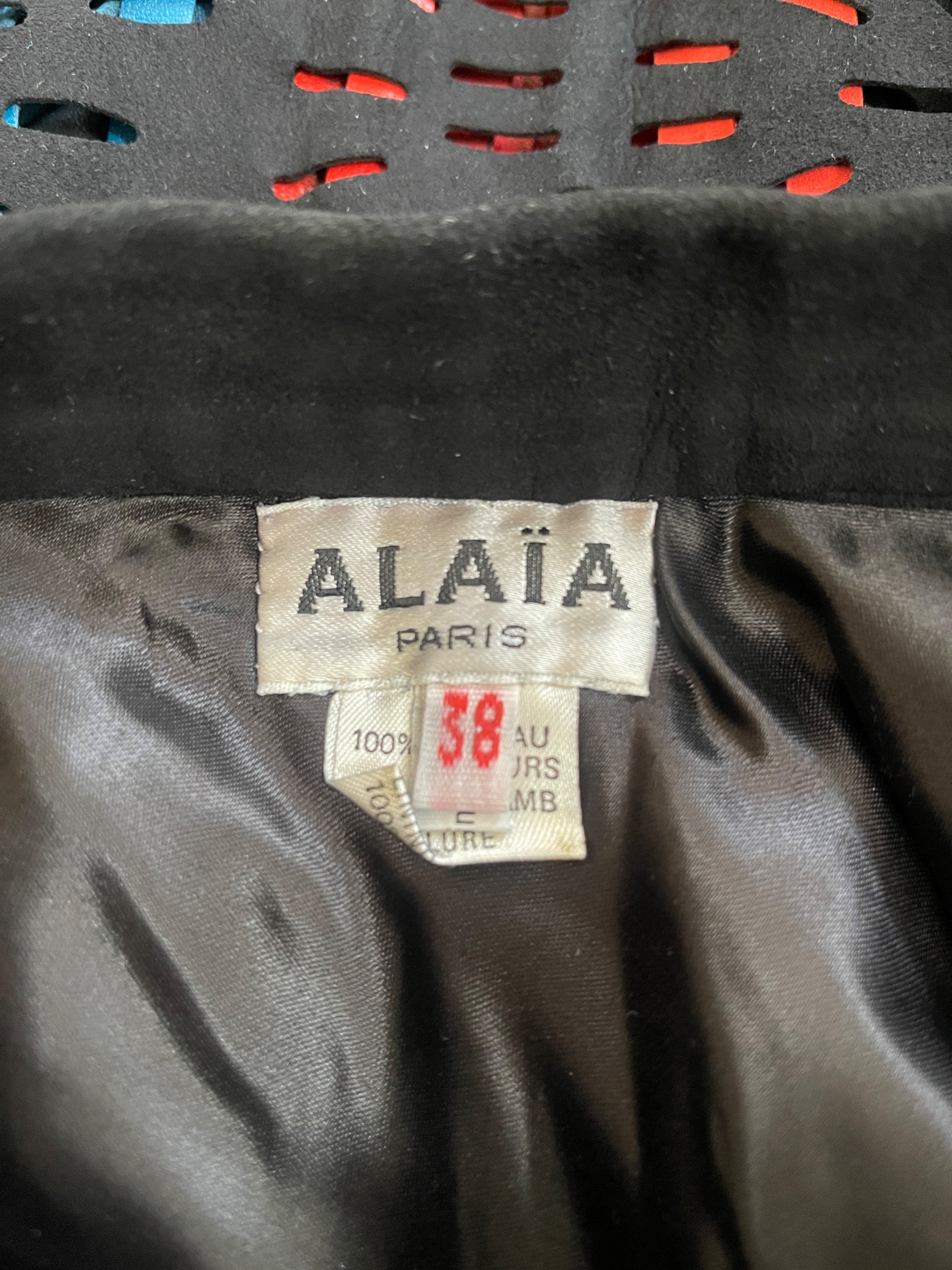 This documented mini skirt was designed by Azzedine Alaïa as part of his Spring 1994 collection. Two dresses showcasing the same perforated leather fabric and colour palette walked the runway and are currently held by the Foundation Azzedine Alaia. Model Beverly Peele attended the 1994 CFDA Awards in New York with Azzendine Alaïa and wore the maxi-version of this skirt.