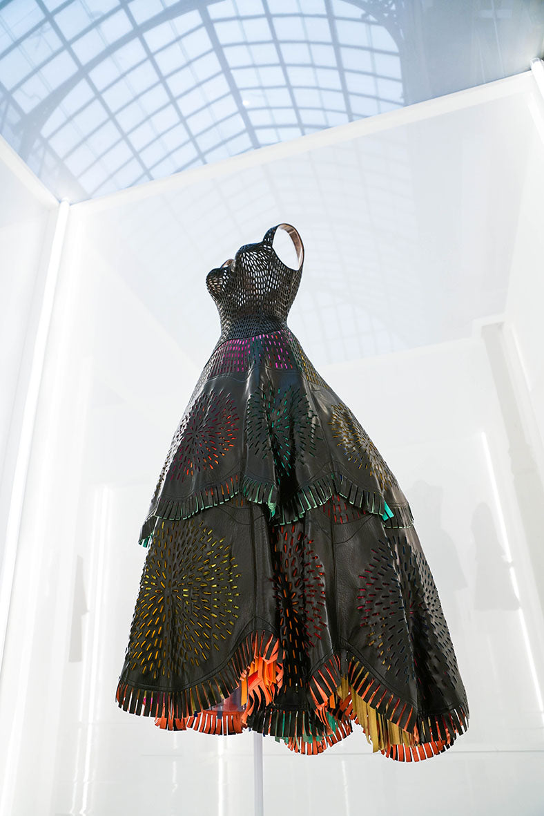 Tailored from black suede, it has a high-waist cut and is tailored to a mini skater style. The skirt has a thick waistband which is perforated along the bottom hem, revealing the red suede lining. It is detailed with cut-out holes which form large snowflake like shapes around the hem; the shapes echoed by the scallop hemline. Through these, the detail of the inside can be glimpsed: here, strips of leather in vibrant red, apple green and petrol blue form a layer of fringe that can be seen as the wearer walks. The skirt is lined with black satin. It fastens on the left hip with a hidden tonal black zip and black plastic button. Made in France, this piece is a true archival treasure and worthy of museum acquisition.