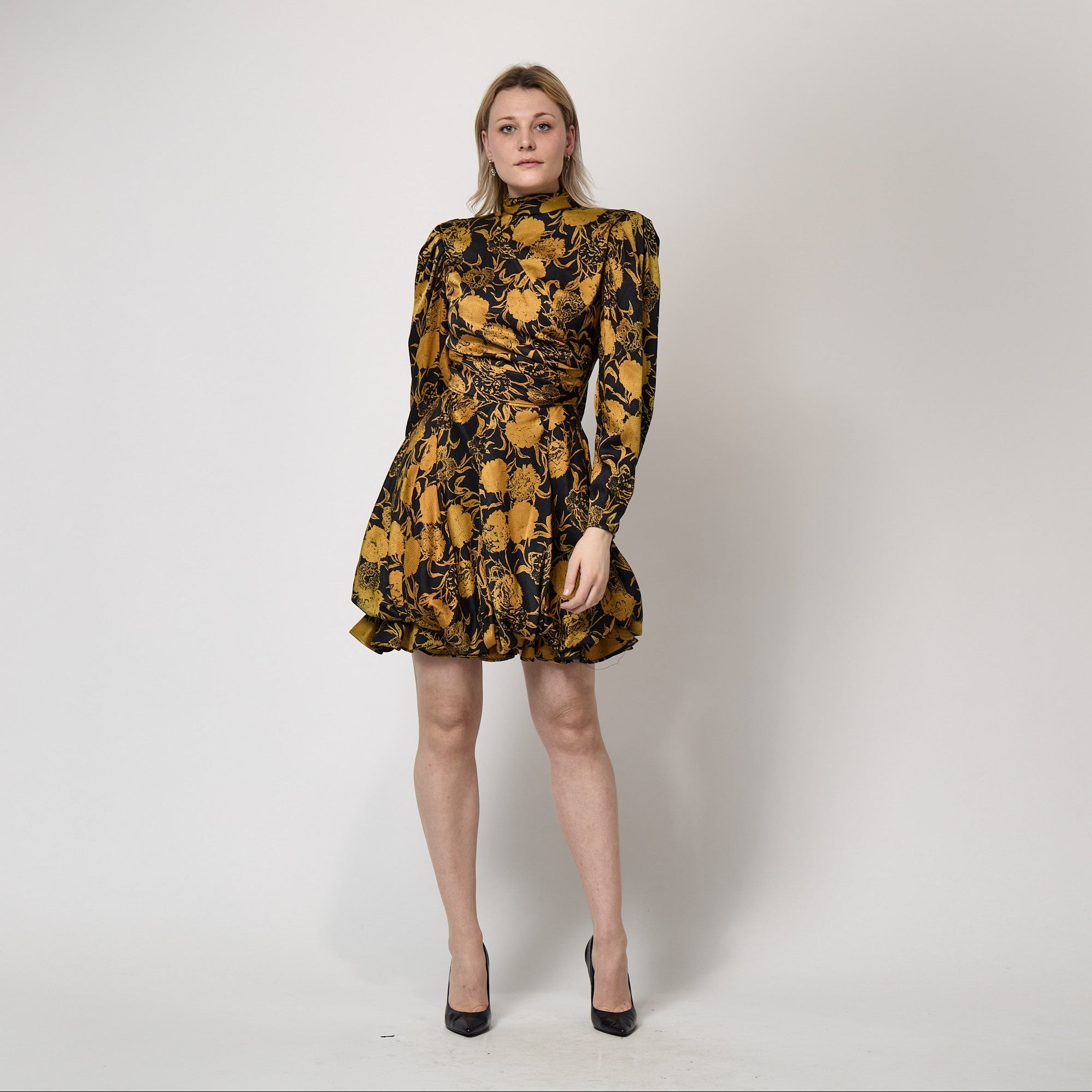 The dress showcases a classic 1980s silhouette in a now very modern and appealing way. Tailored from black silk patterned boldly all-over with painterly gold florals, the cloth is draped flatteringly across the waist. The skirt is cut to a weighty puffball style which dances around the legs as the wearer moves. The sleeves are voluminous at the shoulders and fall to a narrower wrist. There is a scarf at the neck that can be worn in an adaptable manner. It fastens at the back of the neck with a hidden black zip. The dress is fully lined in sheer black crepe.