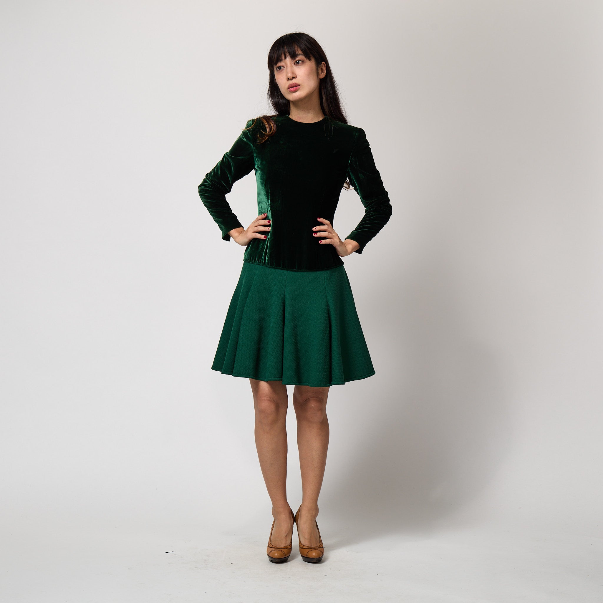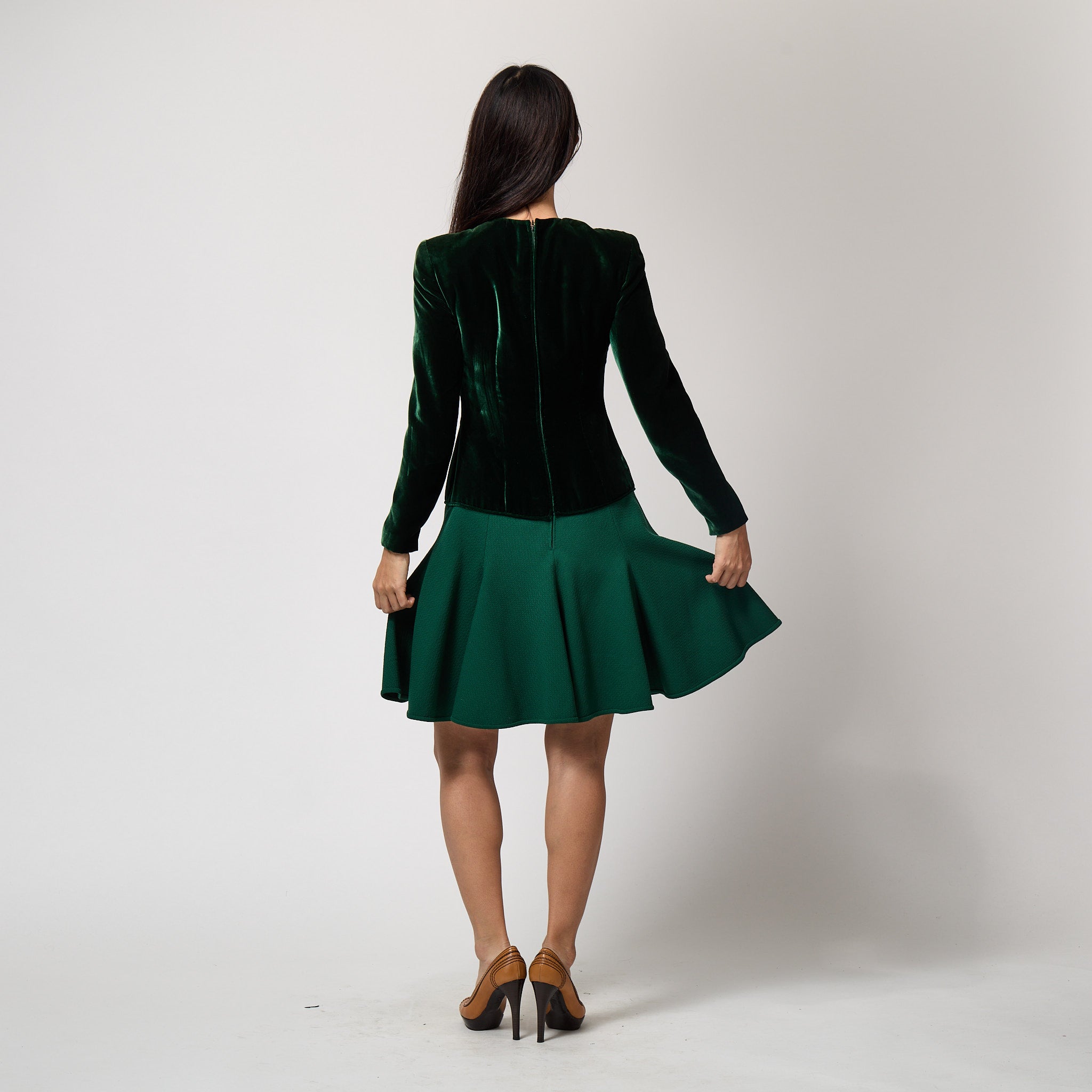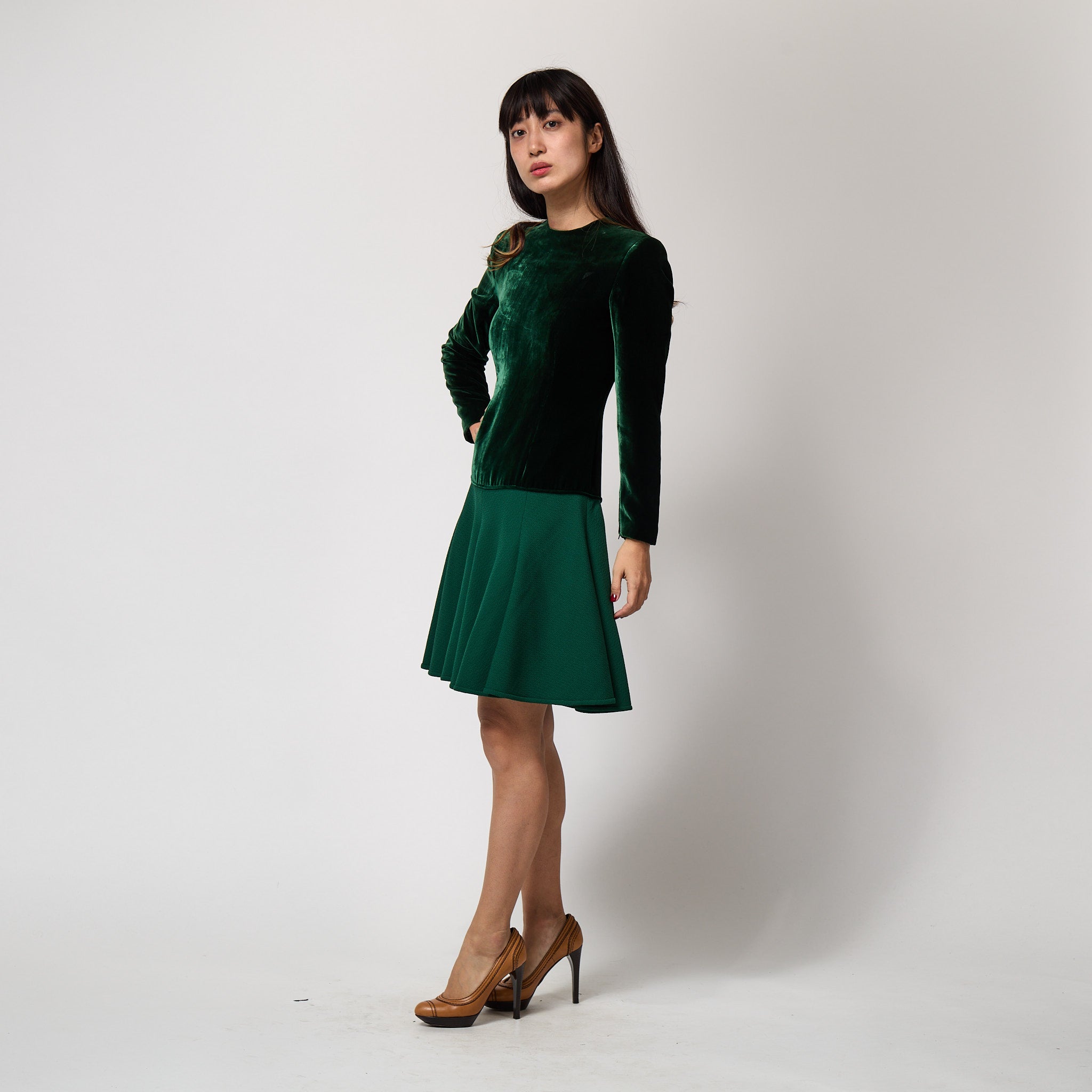 The dress, which is about knee length, is entirely hand stitched and a combination of rich emerald green silk velvet and matte green wool. The top half is the velvet which has a slight shimmer and features long, elegantly slim sleeves with zip-up cuffs (to allow for the slim shape). It has a drop-waist cut from under which the wool skirt flares out. The skirt is playful and cut to a skater style which kicks out around the wearer as they walk. in keeping with the era's tastes, there are removeable silk shoulder pads. The torso and sleeves are fully lined in emerald silk. It fastens at the back with a hidden tonal zip and hook-and-eye clasp. The label reads “Valentino Couture”.