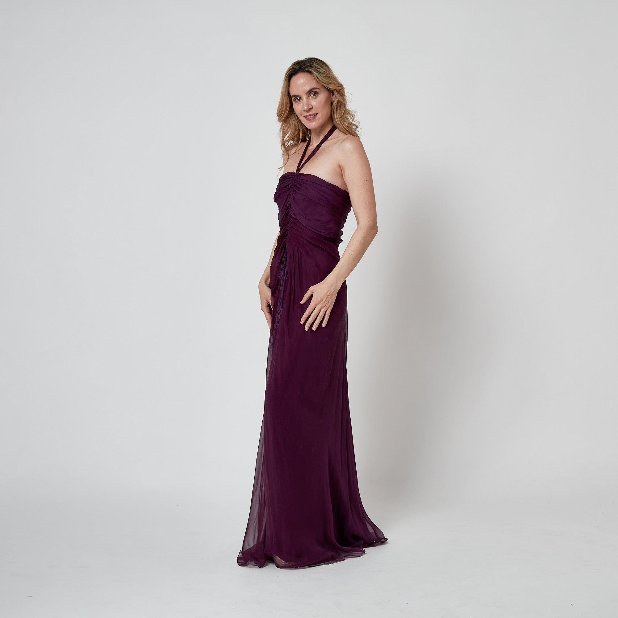 2010s Alberta Ferretti Aubergine Silk Chiffon and Lace Halterneck Dress