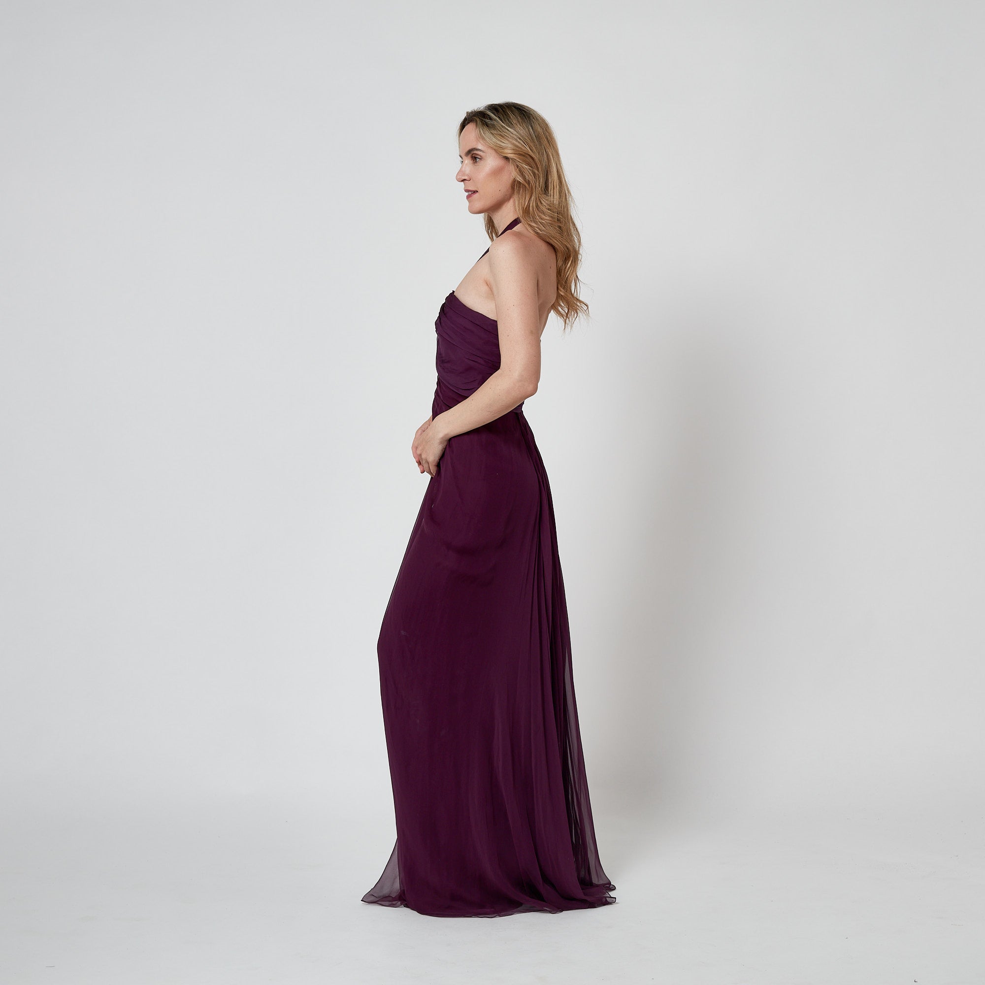 Alberta Ferretti is an Italian designer celebrated for her ethereal, romantic aesthetic, defined by flowing silhouettes, delicate fabrics, and a sense of femininity. This elegant evening gown is tailored from lightweight silk-chiffon in a beautiful, rich aubergine shade. It has a halter-neck top with thick straps crafted from sheer silk-chiffon with rolled edges. Inside, the dress is corseted around the torso providing support and structure. The dress has a gathered bust, with a layer of fabric - gathered and pinned elegantly - falling from here and cascading down around the body. This fabric layer parts at the front, with the side of each panel prettily trimmed with tonal purple lace for a subtle touch of texture and dimension. Underneath sits a column shaped skirt tailored from the same silk-chiffon. The dress is lined with tonal purple silk-satin. It fastens at the centre of the back with a hidden tonal zip.