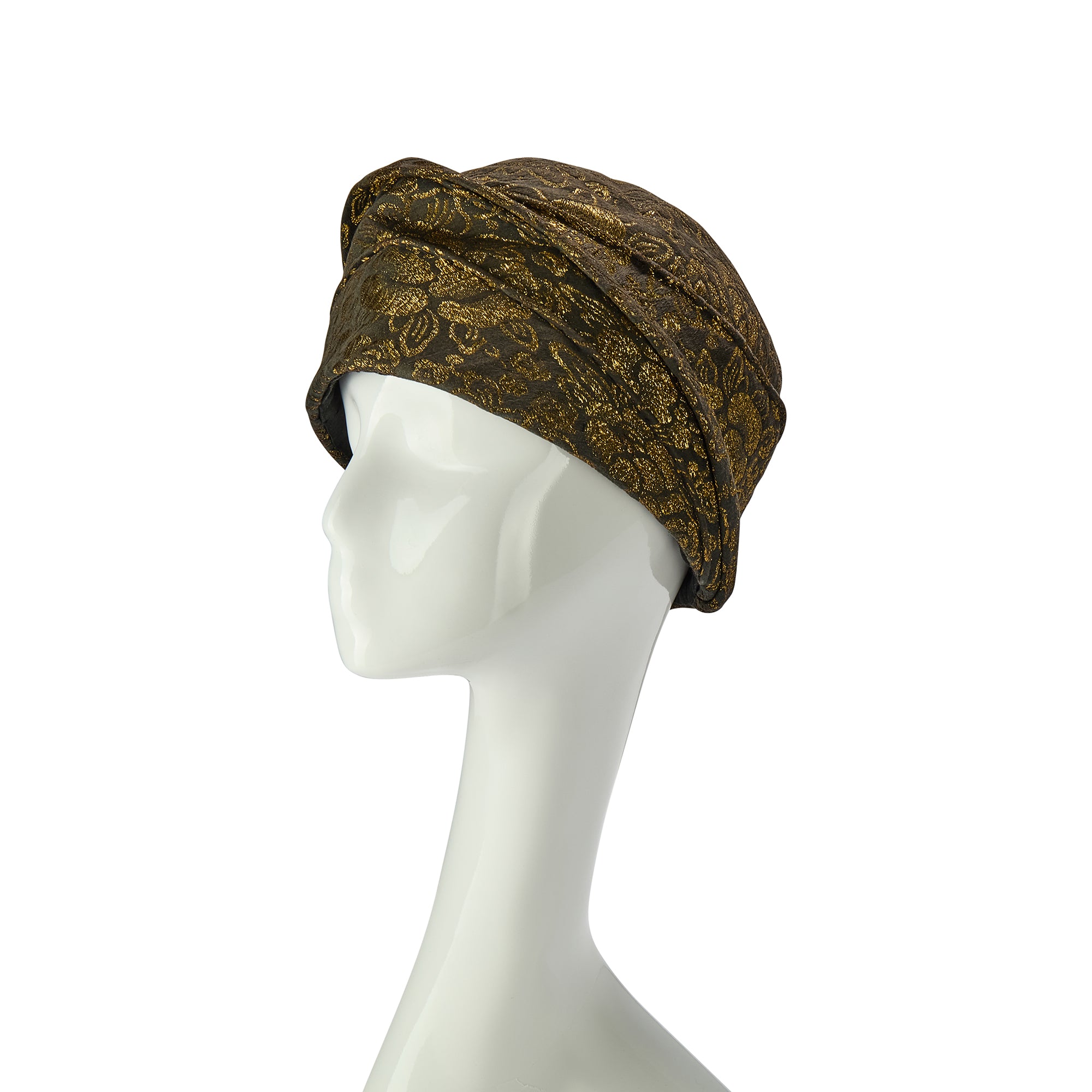 This highly collectable hat was designed in the 1920s and is tailored to a classic cloche shape. An expensive and well made couture piece, it is crafted from a charcoal lamé detailed with gold metallic thread. This shimmering thread forms floral motifs across the entire outer surface. Designed to look as though it wraps around the head, it is tailored with swathes of fabric which circle the solid form of the hat and create a theatrical peak at the front. The inside of the hat is lined with inky black shot-silk which makes it a comfortable wear.