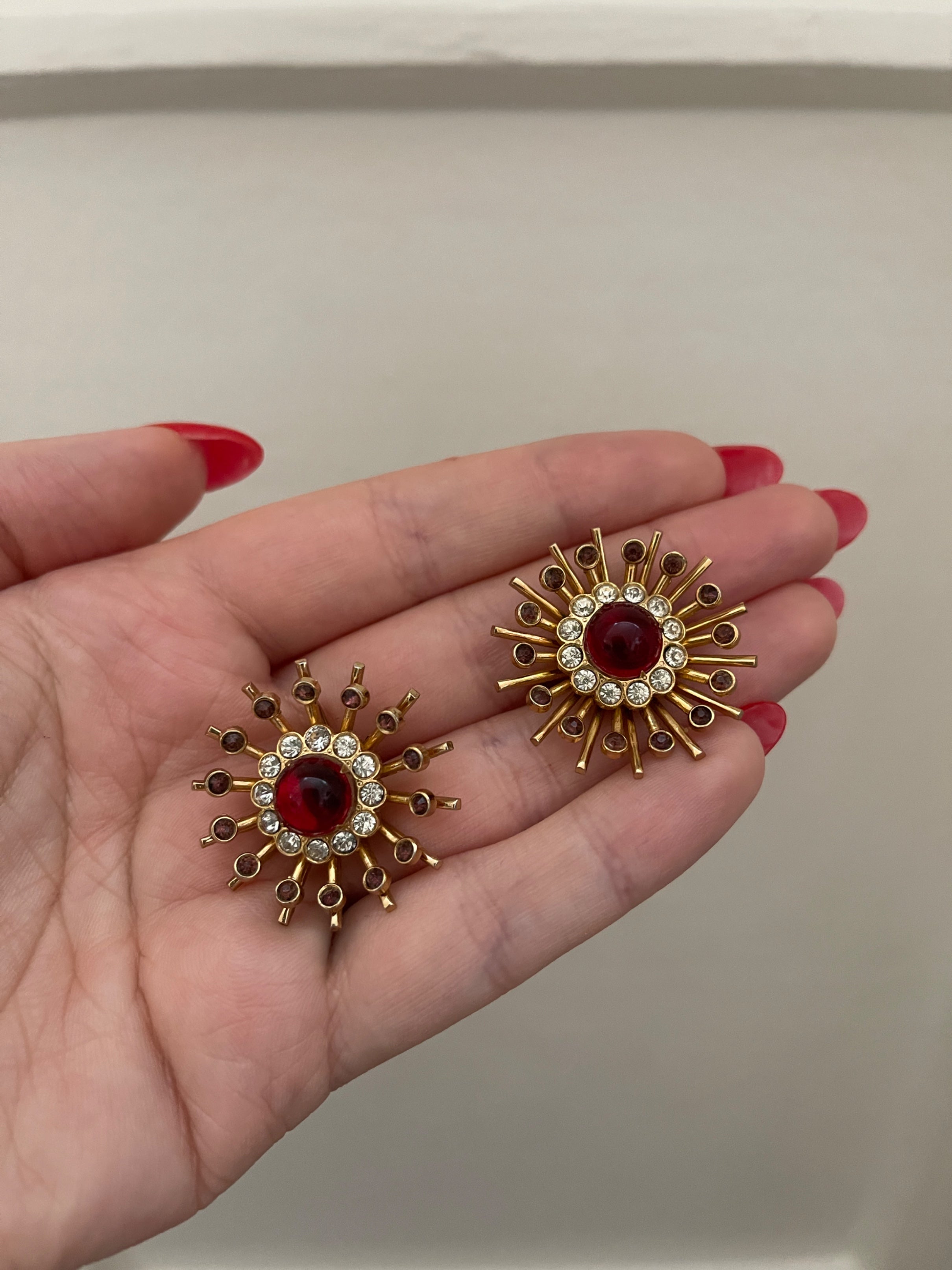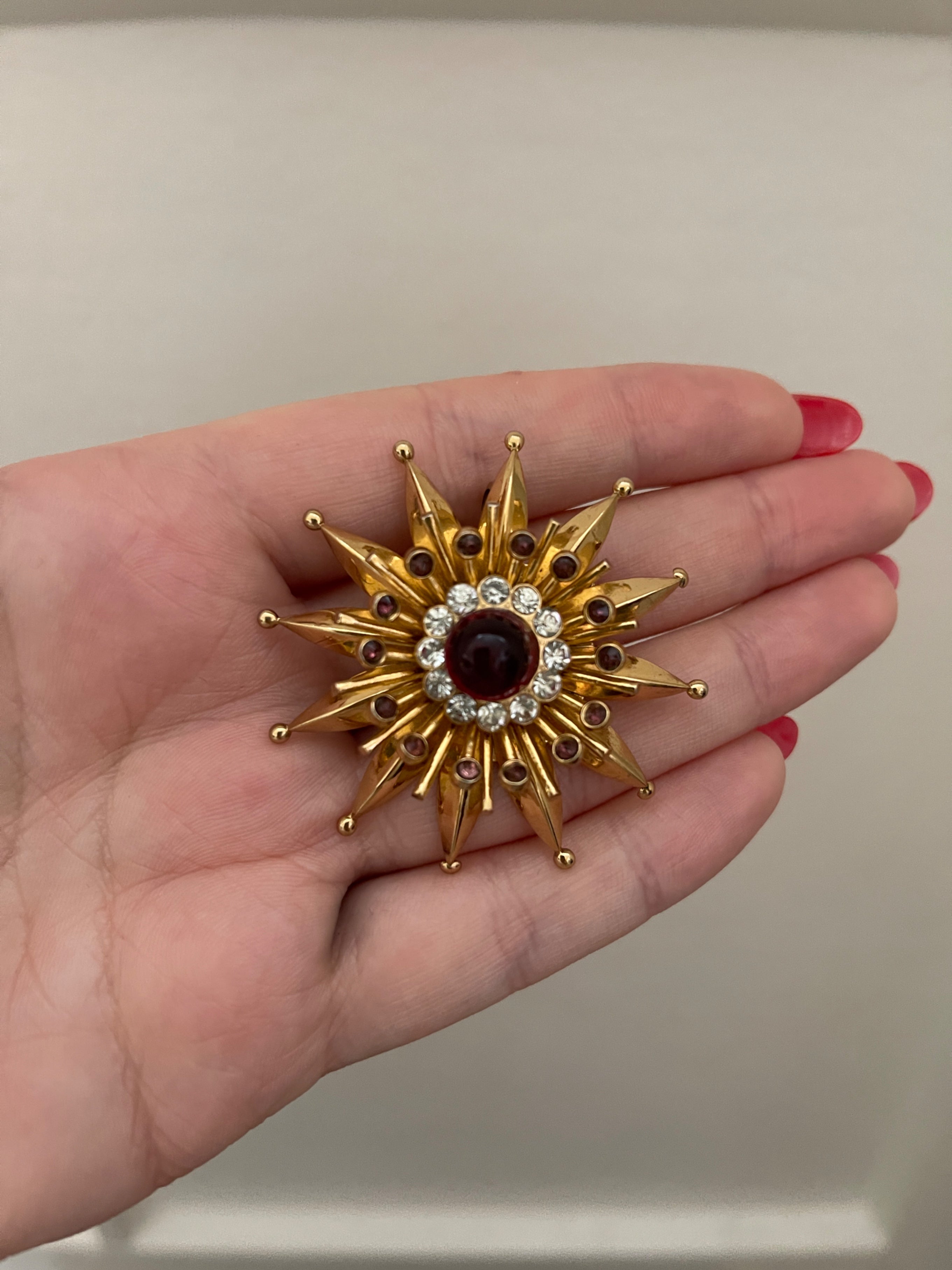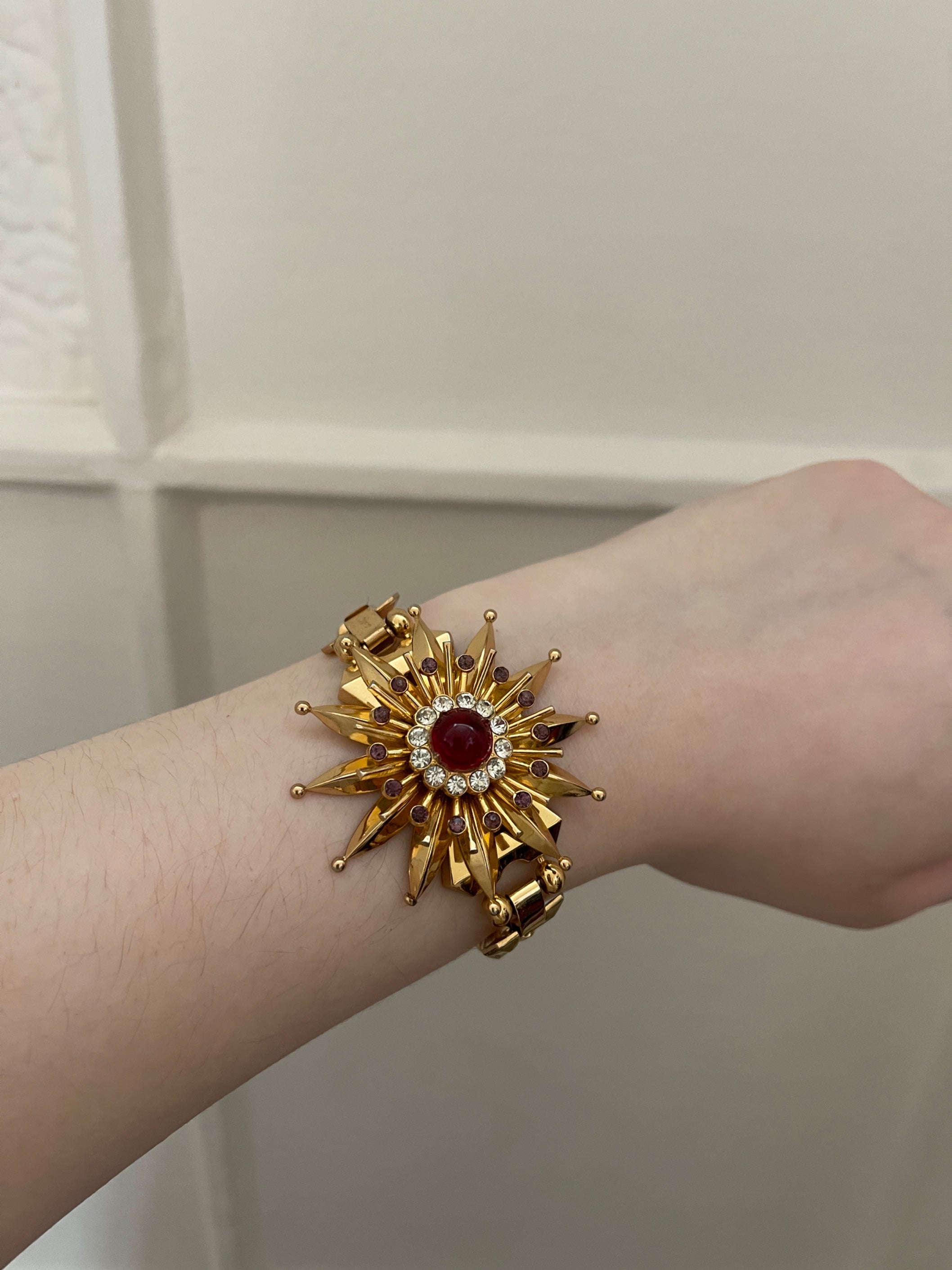 Each piece of the jewellery set features an incredibly detailed, 3D effect yellow gold-toned metal flower adorned with deep ruby or garnet-like stones and rhinestones. The brooch has a C-clasp on the back whilst the earrings have screw-backs. The bracelet centrepiece is sat on two box link chains, attached with elaborate clasps. It fastens with a box clasp that is engraved on the rear with “Coro” together with the back of the centrepiece. The brooch and earrings are not signed.