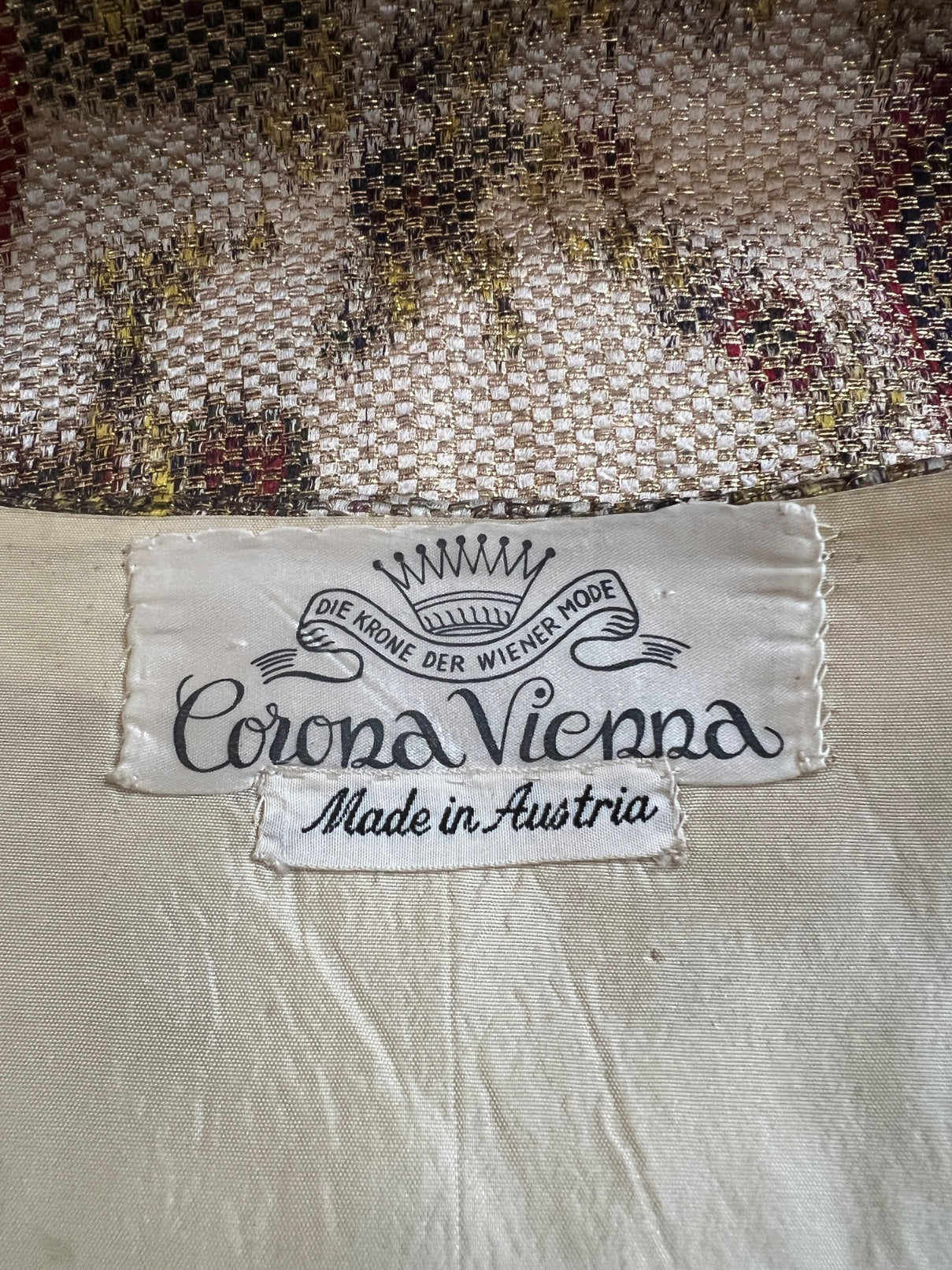 This 1950s midi dress was crafted in Austria by Corona Vienna. The silk lame fabric is of a very high quality; decadent gold lame is interwoven with a glossy silk-satin. Up close, the creamy gold silk is detailed and woven with strands in rich hues of navy, russet, forest green and yellow. Step further back and these colours form an elegant, blown-up paisley pattern. The dress is tailored to a flattering, traditionally lady-like silhouette with small cap-sleeves. The neckline is low and draped with a cross-over front and the skirt is softly pleated at the front of the waistband. The dress is lined in cream acetate at the top whilst the skirt section is unlined.