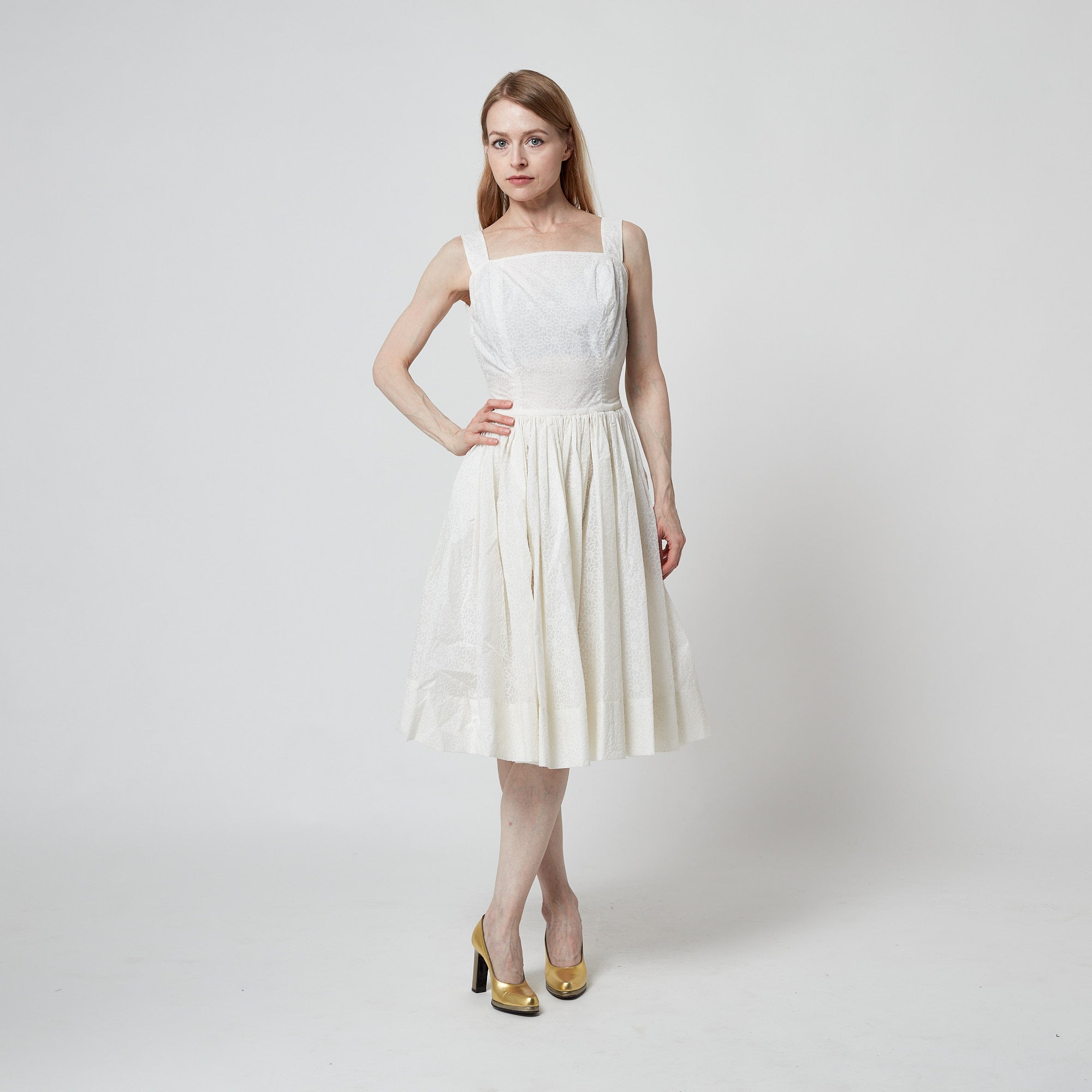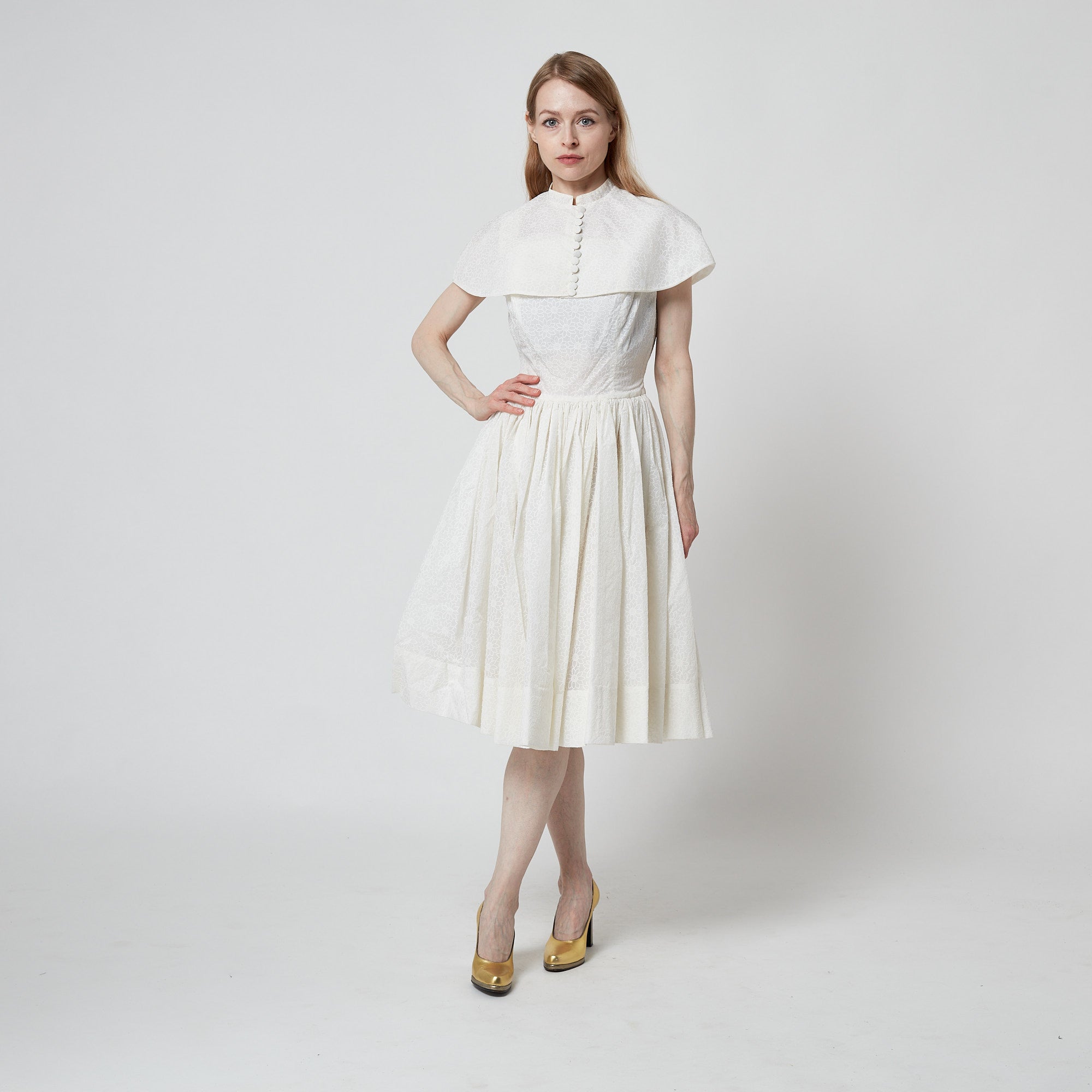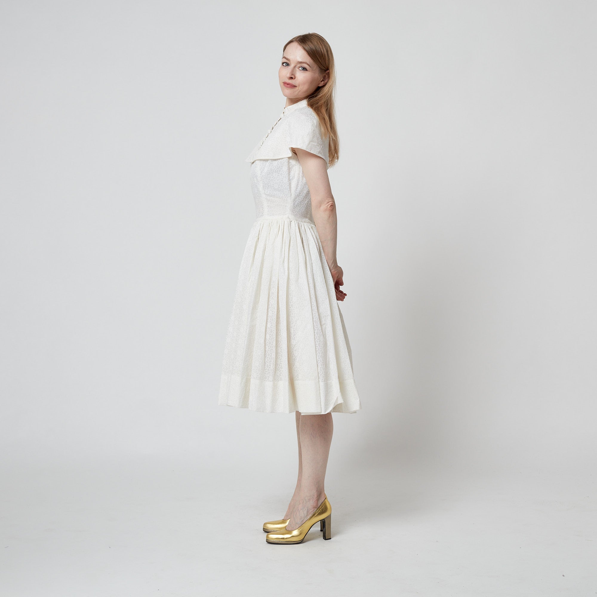 This charming white nylon flocked dress is cut with a classic 1950s silhouette. It has a fitted bodice, nipped-in waist, and full skirt. The neckline is cut straight across with wide shoulder straps, and the dress fastens at the back with a tonal white zip. The fabric is delicately textured with a tonal flocked daisy print that appears subtle from a distance but reveals tactile detail up close. The dress is accompanied by a small curved capelet, which can be worn either way around. It features an elegant raised neckline and fastens with fabric loops and covered buttons - each button detailed with a miniature version of the flocked daisy motif. The bodice is lined in smooth white synthetic fabric, while the skirt is left unlined for a light, airy drape.