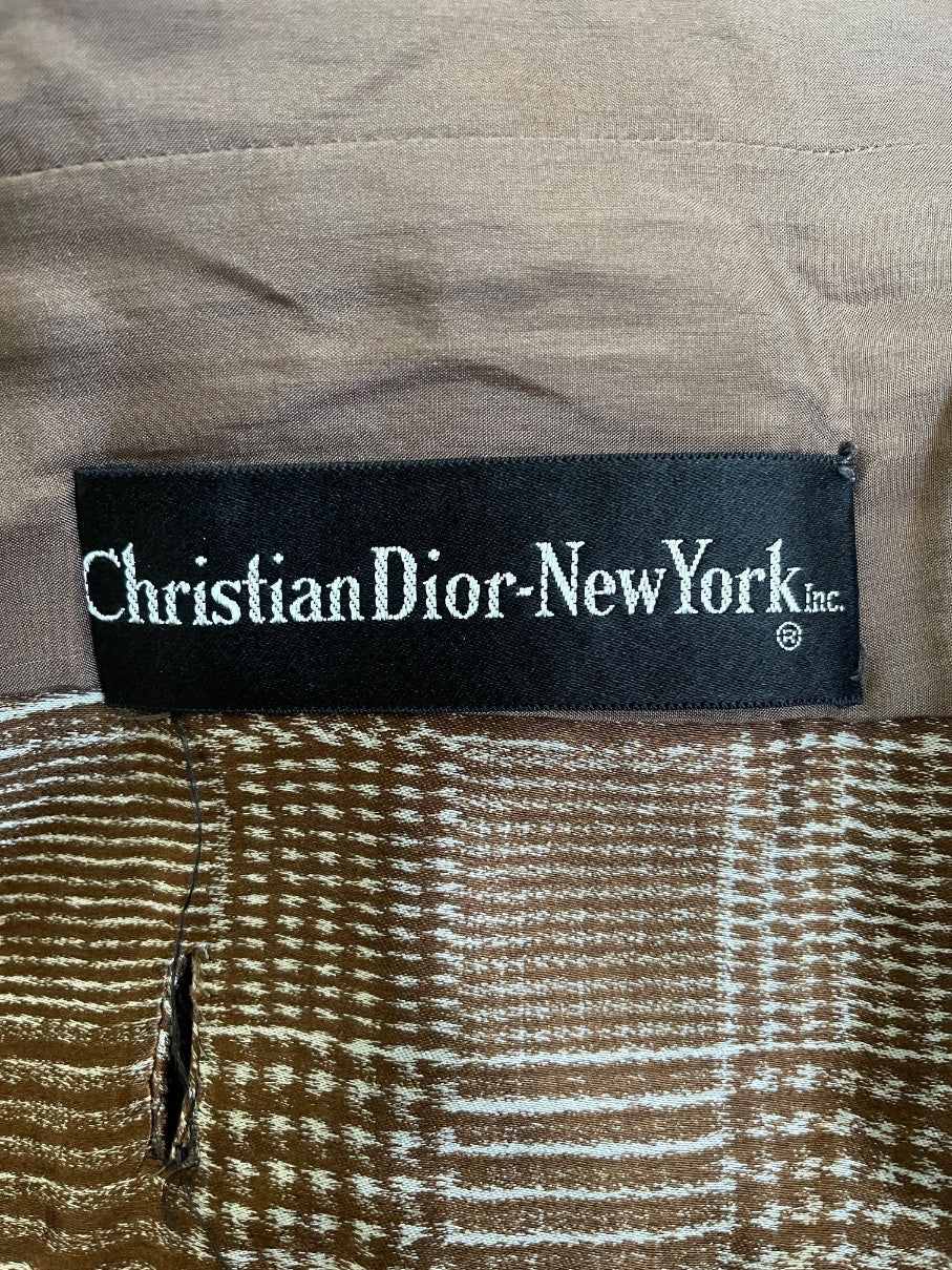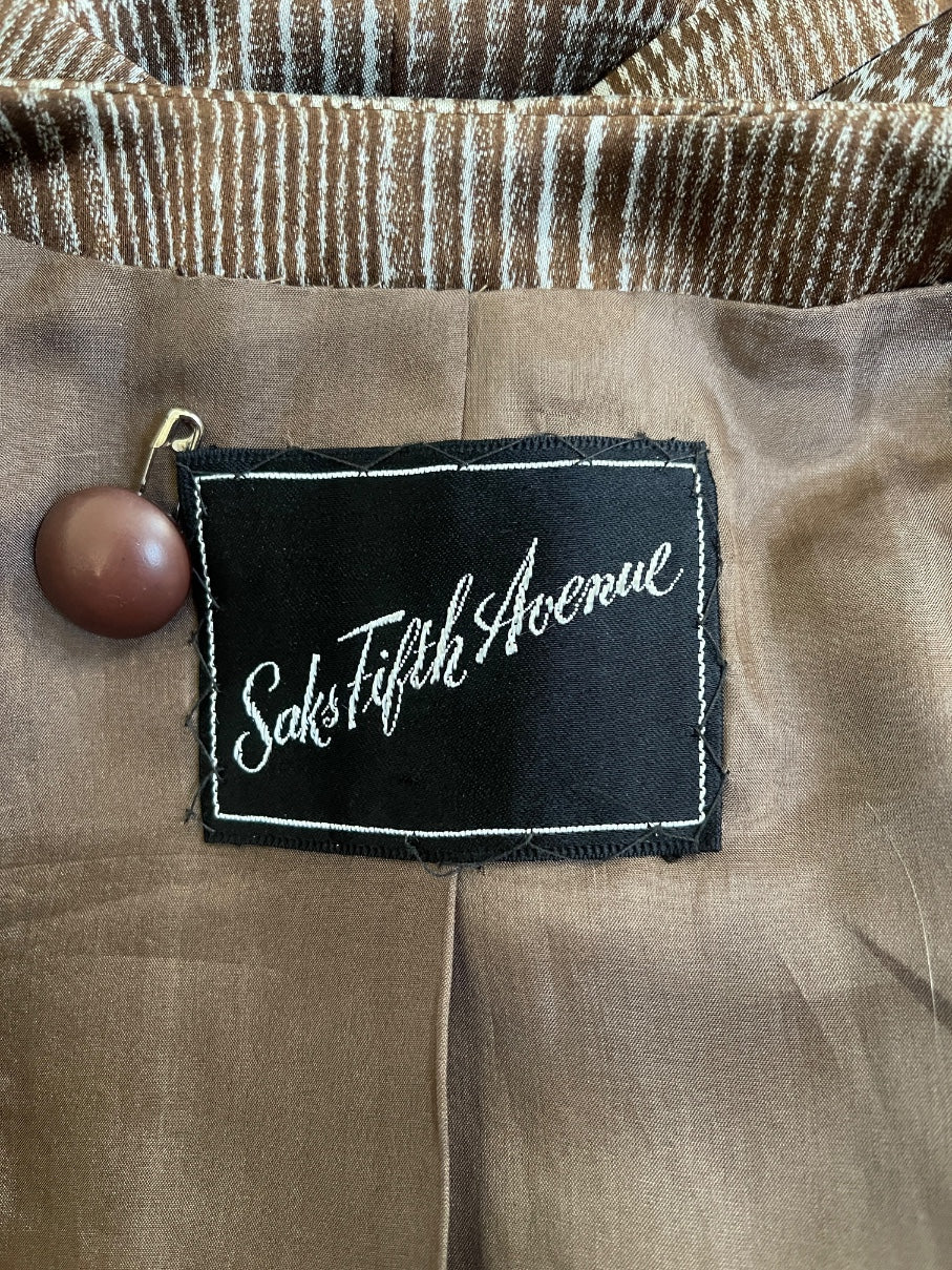 This elegant early 1960s dress suit was designed by Christian Dior and sold in legendary Manhattan department store Saks Fifth Avenue. Tailored from chocolate brown and off-white silk satin, the fabric is printed with a printed Prince of Wales check that is luxuriously smooth. The jacket is cut to a boxy, double-breasted fit with a collarless neckline. There are six circular cut plastic buttons on the front. The dress is sleeveless and tailored to a classic shift silhouette. It has a rounded neckline and is detailed with two little square panels of coordinating cloth below the bust. It fastens at the back of the neck with a hidden brown zip. The jacket and dress are lined in taupe silk satin throughout. The jacket contains both Saks and Christian Dior labels.