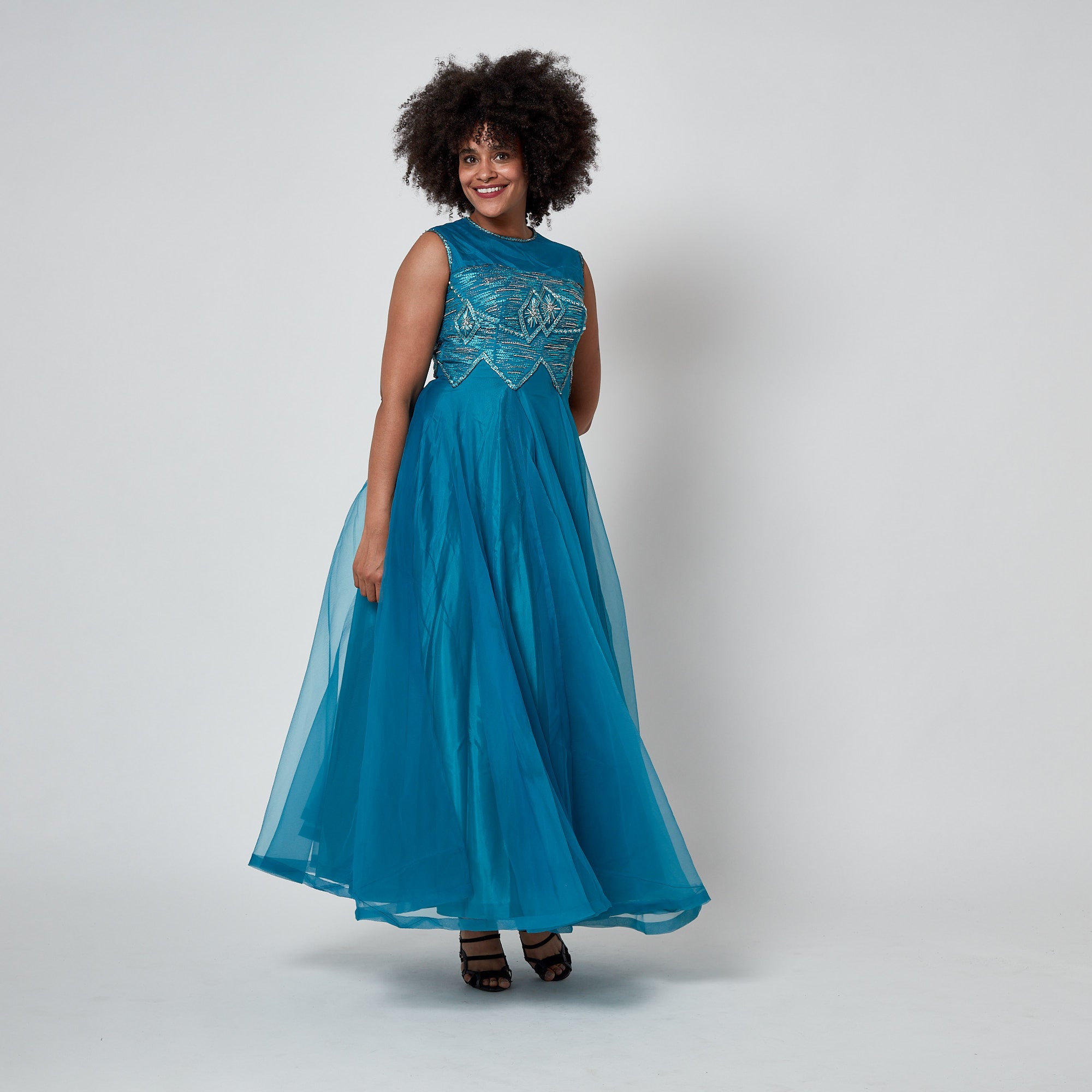 Vibrant 1960s French couture turquoise silk-satin evening dress. Created from turquoise silk-satin, it has a sheer organza overlay, creating a luminous layered effect. The sleeveless design features a rounded neckline and an empire-line cut, falling into a sweeping full skirt that moves fluidly around the ankles. The neckline and armholes are delicately edged with turquoise stitching and tiny silver round and bugle beads. Across the bust and back, intricate hand embroidery and beadwork form a wide decorative band; an abstract, painterly arrangement of horizontal turquoise and metallic silver stitching interspersed with rows of round and bugle beads. Scattered diamond motifs emerge from the pattern, each centred with firework-like bursts of high-shine silver sphere beads and radiating turquoise threads. The lower edge of the beadwork finishes in a zig-zag hem that defines the empire waist and flows into the voluminous skirt. The dress fastens at the back with a tonal zip and hook-and-eye clasp. A beautiful example of 1960s French couture craftsmanship, it is unlabelled.
