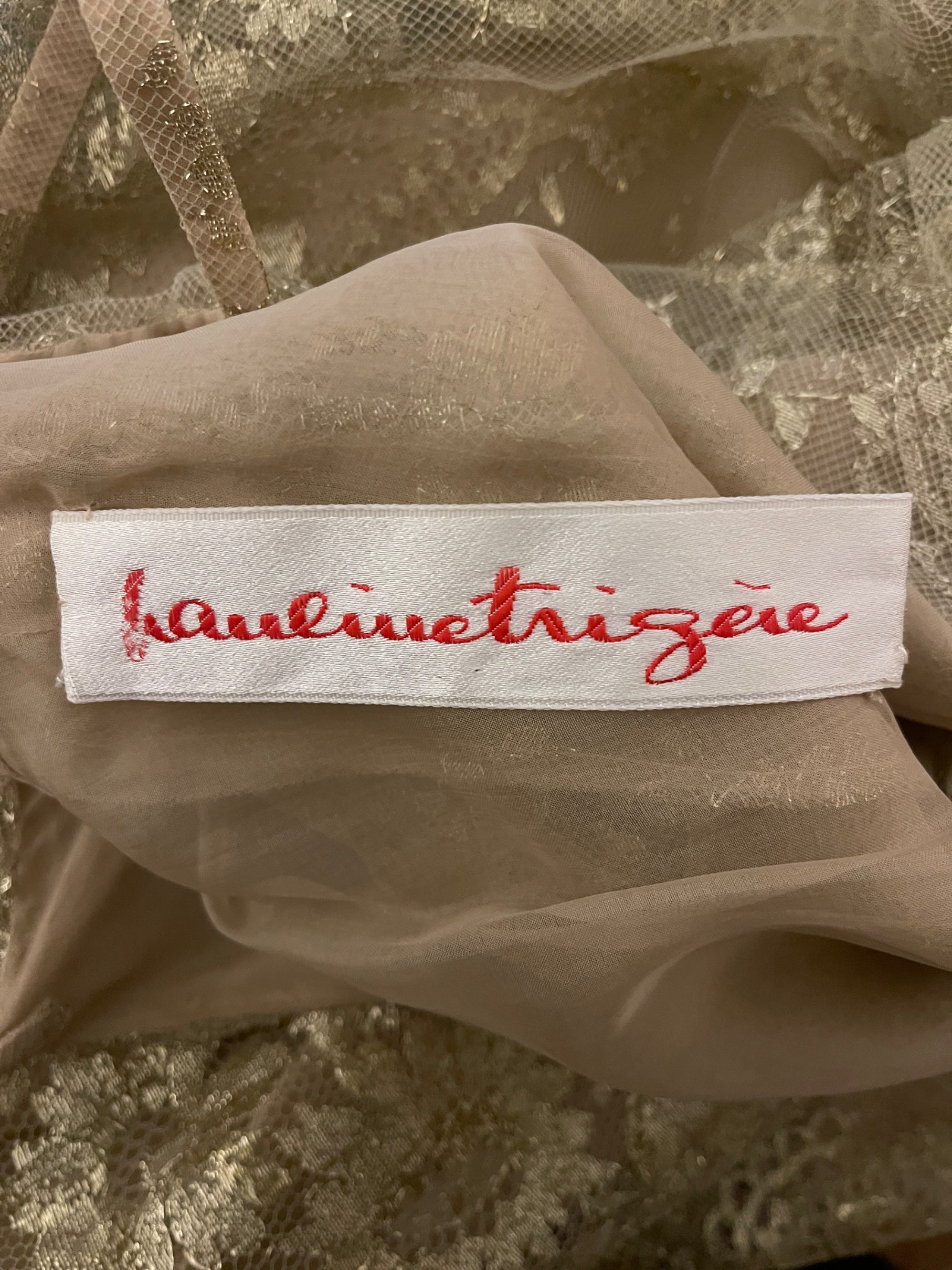 This late 1960s Pauline Trigère demi-couture evening dress is tailored from a mesmerising metallic gold silk lace cloth which glitters as it catches the light. It has a nipped-in waist and full, swirling skirt - perfect for making an entrance at a party or high profile event. The neckline is trimmed with a gold lace ruffle with a scallop hem. It has delicate spaghetti straps crafted from gold lace and lined with nude cloth. The bottom hem is cut to a playful scallop to echo the neckline. Lined with nude silk organza throughout and the label reads “Pauline Trigère” in vermillion font against white cloth.