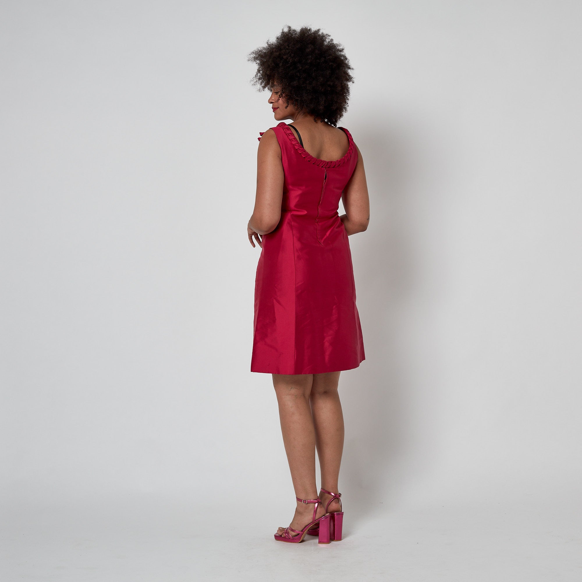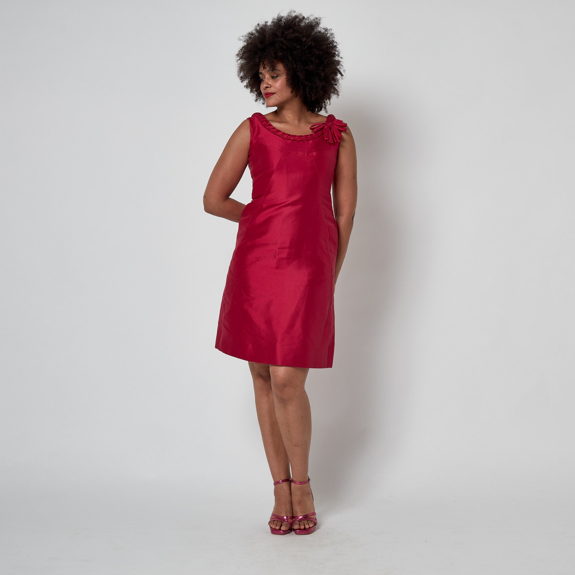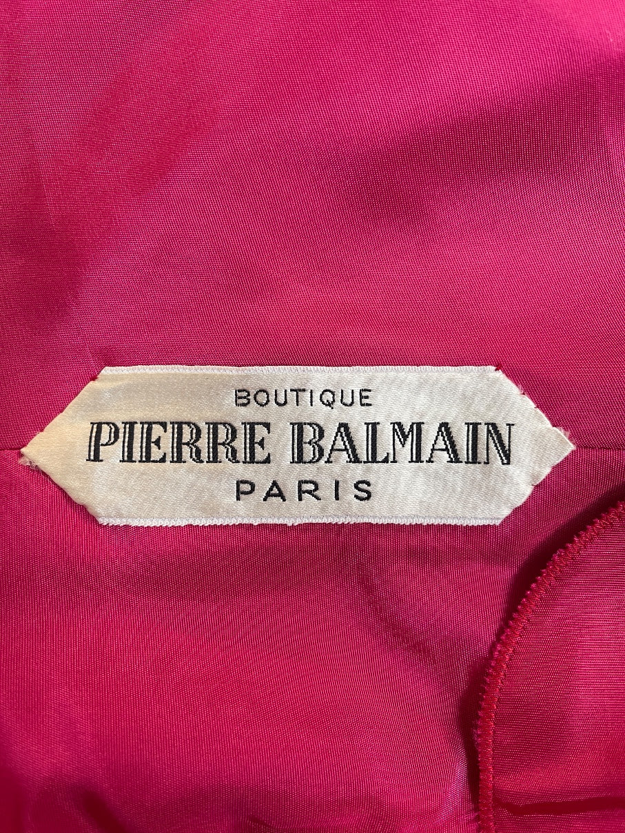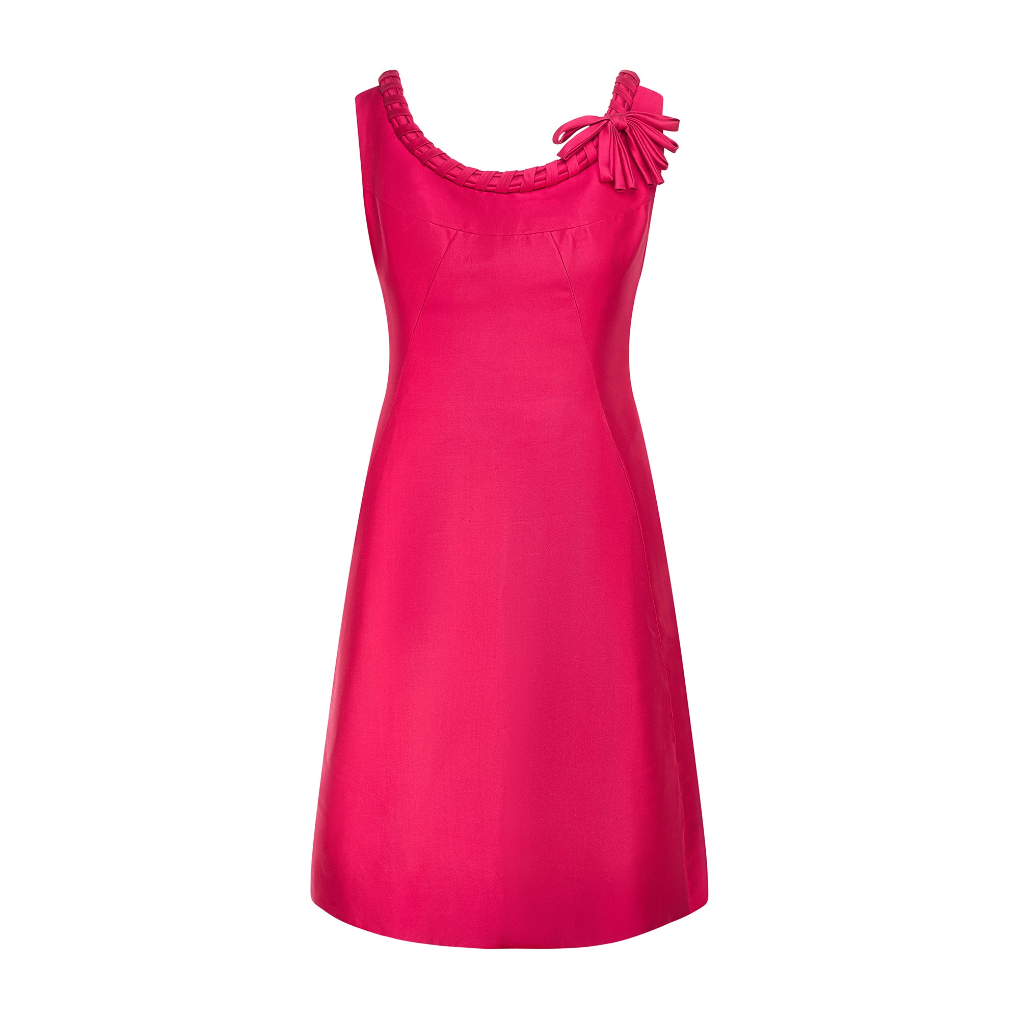 Made in France, this dress is tailored from a thick, smooth silk in a vivacious raspberry pink hue. The silhouette is cocooning, cut to an hourglass shape it curves in at the waist and out at the skirt. Pierre Balmain’s eye for detail really sets this piece apart. The elegant, elaborate neckline is curved and wide. It is detailed with bands of pink silk, woven together, and christened at the left hand side with a floppy bow crafted from multiple strands of pink silk. The dress is lined with raspberry silk for a comfortable, luxurious wear. It fastens at the back with a hidden tonal pink zip and hook-and-eye.