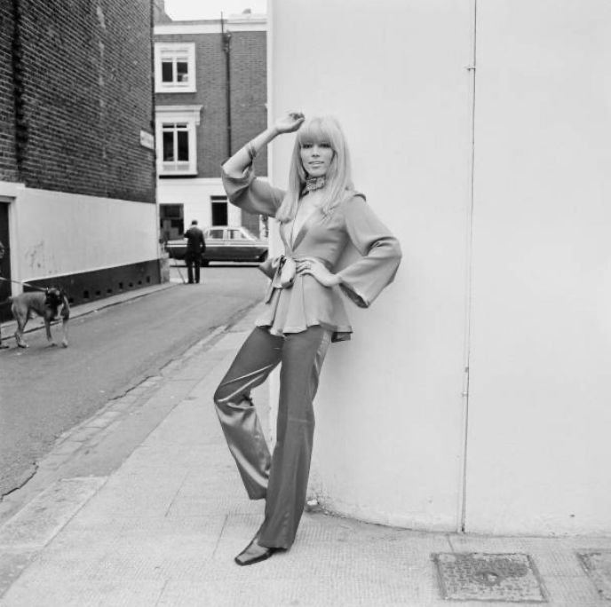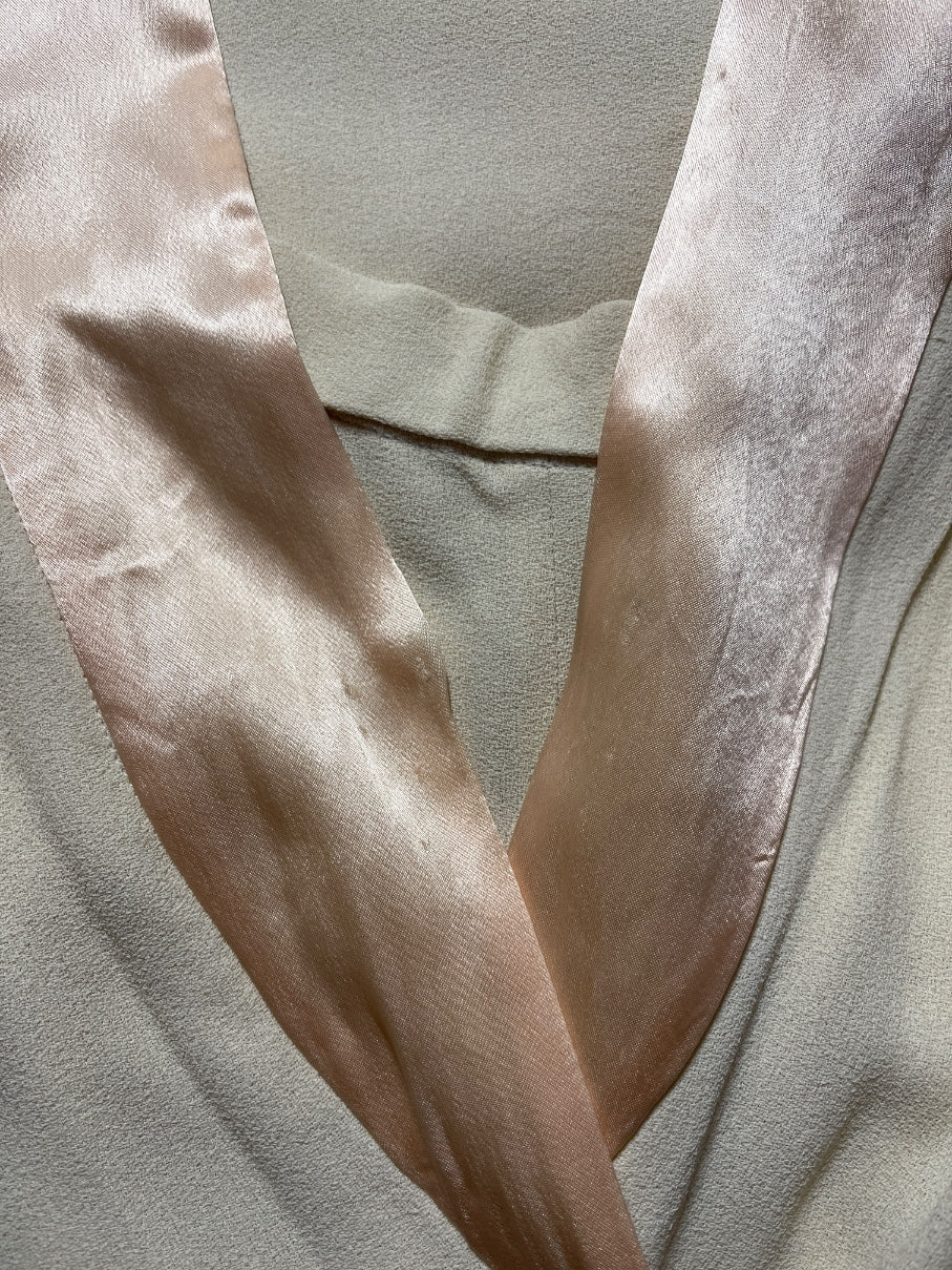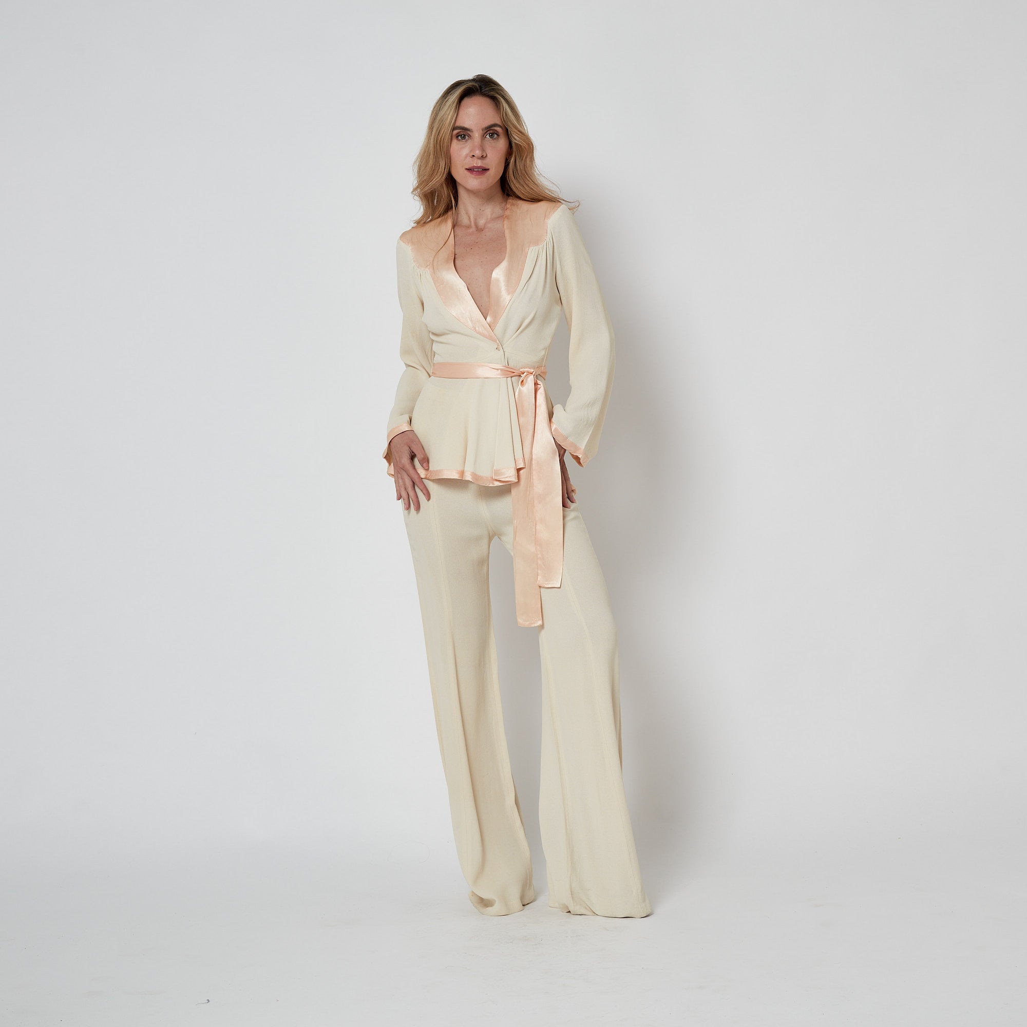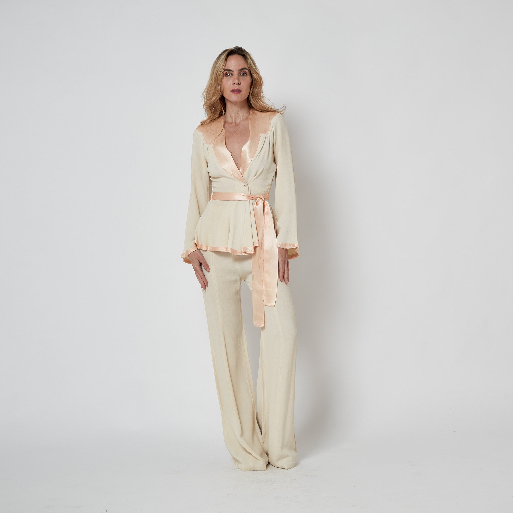 The suit is fashioned from cream moss crepe, a crinkly, tactile fabric with a moss-like texture known for its flexibility when draped. It was a signature cloth of the label. The jacket is tailored to a V-neck, button-down style, where it closes with pink satin-covered buttons. A detachable wide pink satin belt finishes the waist. The neckline is detailed with pale pink satin with a pretty scallop hemline. The trousers have a very high waist cut and a wide silhouette that flares out towards the floor. They are fastened at the back with a hidden tonal zip and hook-and-eye clasp. Both the jacket and trousers are unlined. We have attached archival photos of identical Ossie trouser suits from the same period made from his signature moss crepe.