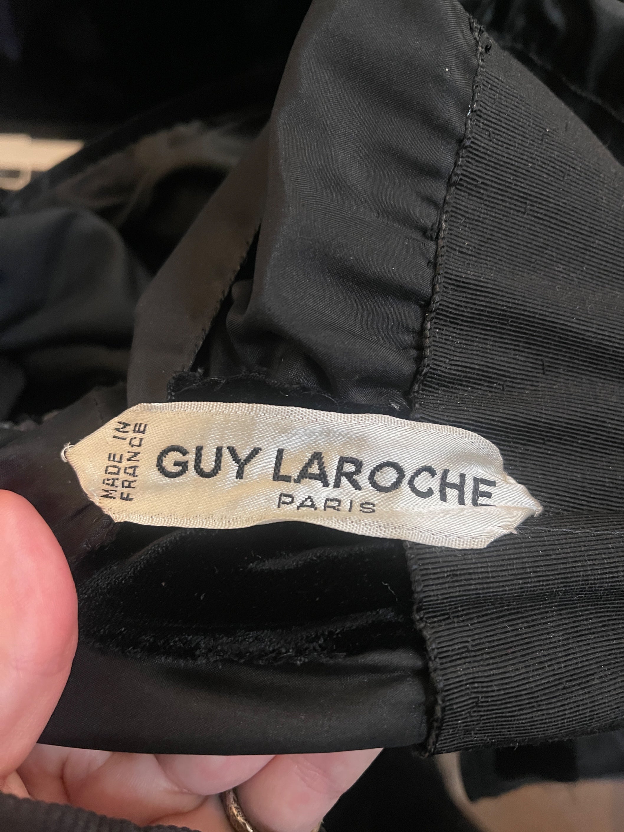 This late 1960s to early 1970s haute couture dress was made by Parisian Guy Laroche. Fashioned from sumptuous black velvet, it has long-sleeves and a maxi-length skirt. The neckline is wide and elegant, revealing the collarbones. The bottom of the skirt and the sleeves are finished with long and plump black velvet tassels that sway as the wearer moves. These tassels are embellished with rhinestones that glitter as they catch the light. The wide waistband of this dress cinches the relaxed column tailoring and it too is dotted with rhinestones of varying sizes. The inside of this gown is lined with matte black silk throughout. It fastens at the back with a hidden tonal zip and hook-and-eye. It is finished with the “Guy Laroche Paris” haute couture label from this period which indicates that it is crafted in the Atelier - there is no machine finishing on it and the work was done by hand.