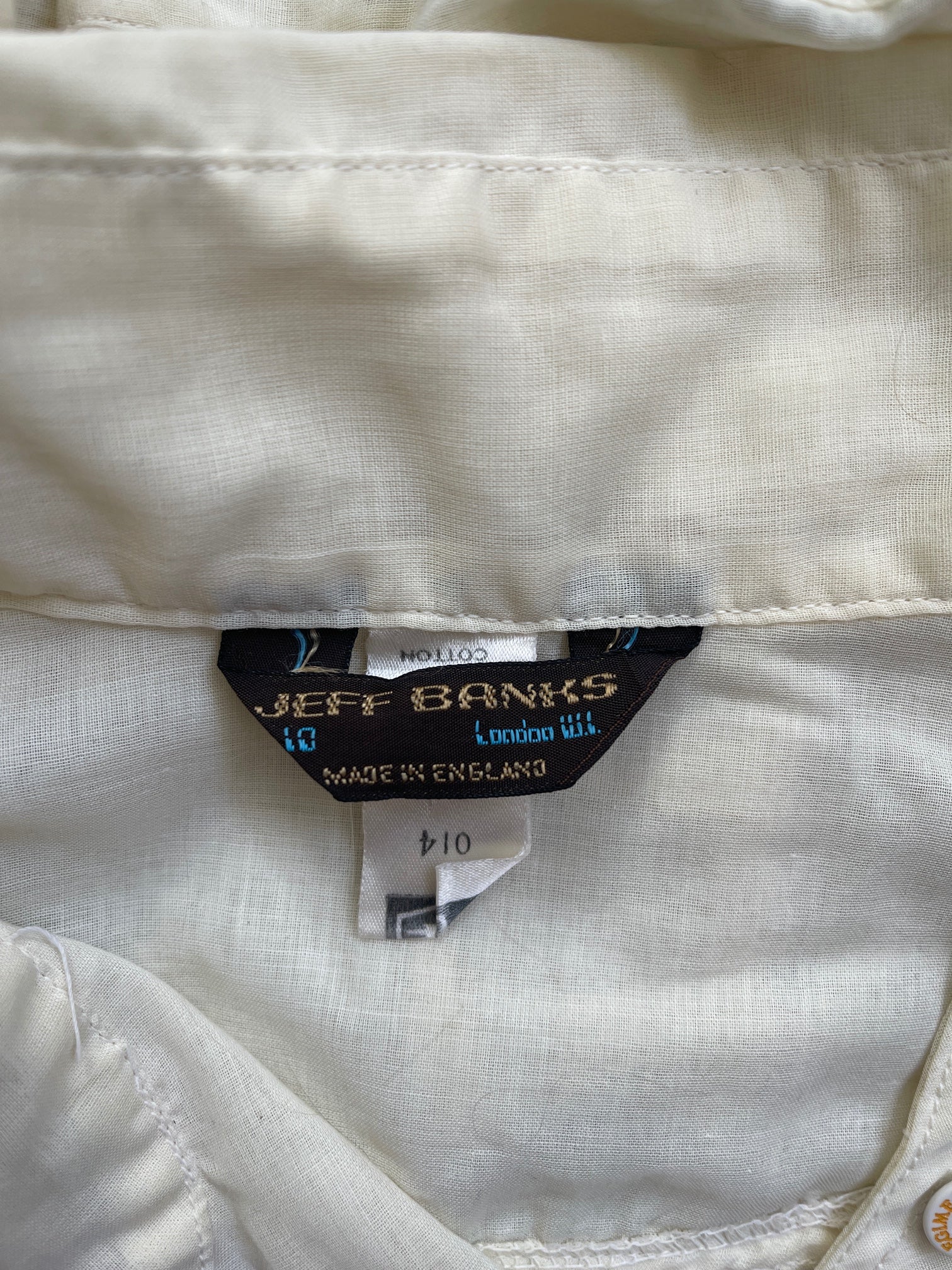 This 1970s voluminous shirt is by celebrated British designer Jeff Banks and is loosely tailored from breezy semi-sheer cotton-dacron in a pale yellow hue. This sporty top has a bibbed, polo-shirt neckline; the wide collar and open neckline secured with four white buttons printed with the words “king regiment 7L” in orange font. The sleeves play to the era’s penchant for bohemian tailoring and are wide and billowing bell-sleeves with an elasticated cuff. The top is cut to a laid-back, slouchy fit and falls to a cropped length that has a panelled bottom hem containing a drawstring in tonal cotton. The top is unlined.