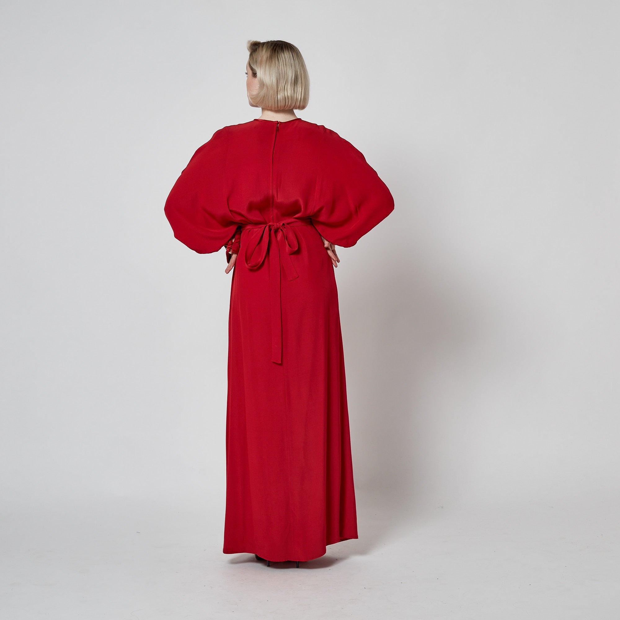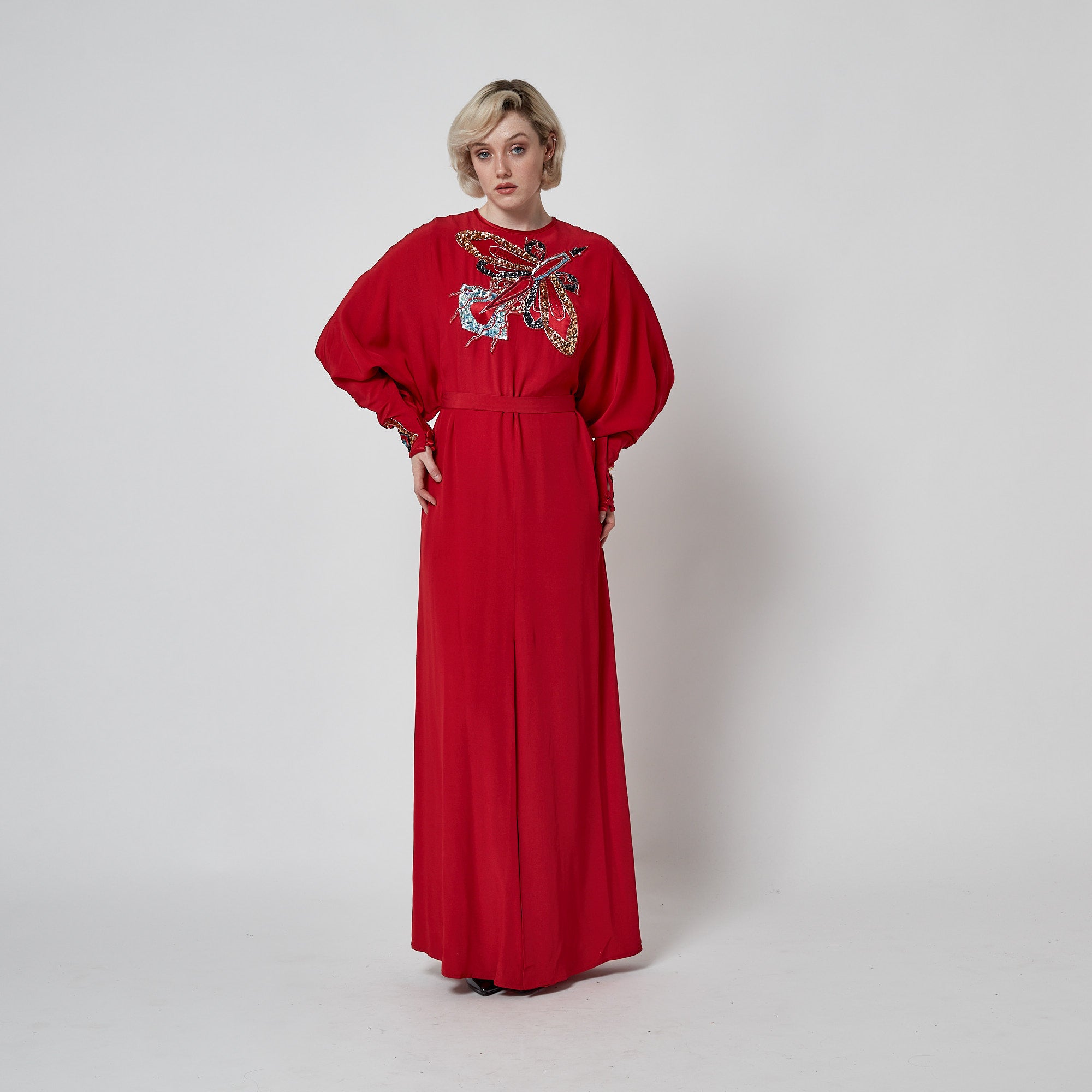 This playful, wonderfully detailed gown was designed by John Bates in the 1970s. Often operating through his Jean Varon label, John Bates produced some of the most forward-looking designs of the 1960s and 1970s, distinguished by graphic lines, imaginative construction, and a distinctly futuristic sensibility. This dress was created under his own name and is generously tailored from heavy red crepe to a flowing, A-line maxi silhouette. The sleeves are long and cut to a theatrical batwing shape with long, slim cuffs covering the forearm. It is unlined and is secured at the back of the neck with a tonal red zip and hook-and-eye clasp. The applique detailing is beautiful; it forms an abstract shape from red silk satin and rainbow-hued sequins across the front of the gown that could be interpreted as a rocket, a moth or a butterfly. The cuffs are embellished with Art Deco forms created from sequins in pale blue, bronze and navy. They close with two red satin-covered buttons and fabric loops. The skirt has a slit at the front. The dress comes with a slim belt crafted from coordinating red crepe.