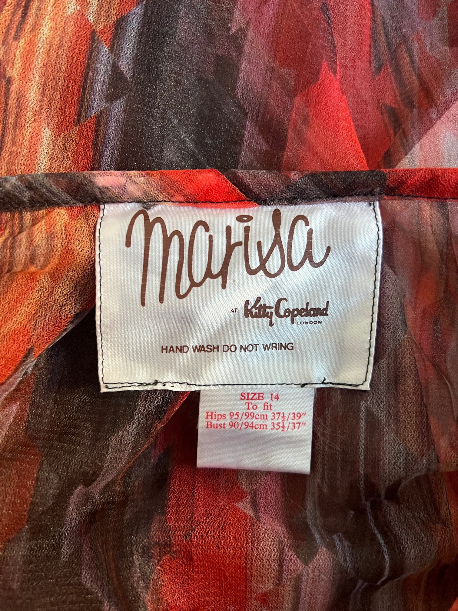 This dramatic and ethereal skirt suit was designed by London label Kitty Copeland for their Marisa line during the 1970s. Crafted in sheer chiffon, the fabric is patterned with softly blurred, painterly stripes that reveal geometric forms up close, rendered in warm tangerine and brown tones. The blouse is light as a feather, with a wide, floating cut through the body, a generous neckline with tie detail, and theatrical bell sleeves finished with elasticated cuffs. The coordinating skirt is high waisted and midi length, softly pleated throughout to enhance the chiffon’s fluidity, and fastens at the back with two hook-and-eyes and a concealed zip. Sheer and unlined, the set is completed by its original matching scarf, which can also be worn as a belt, in the same chiffon cloth.