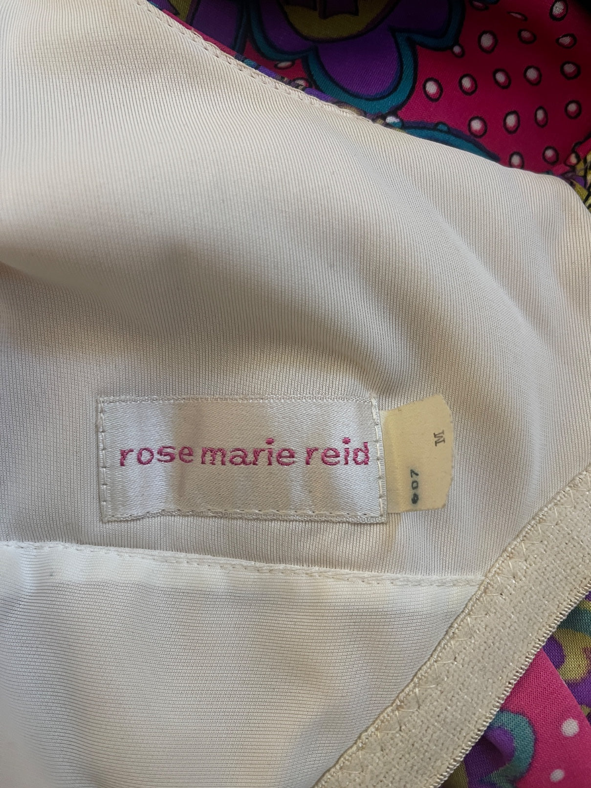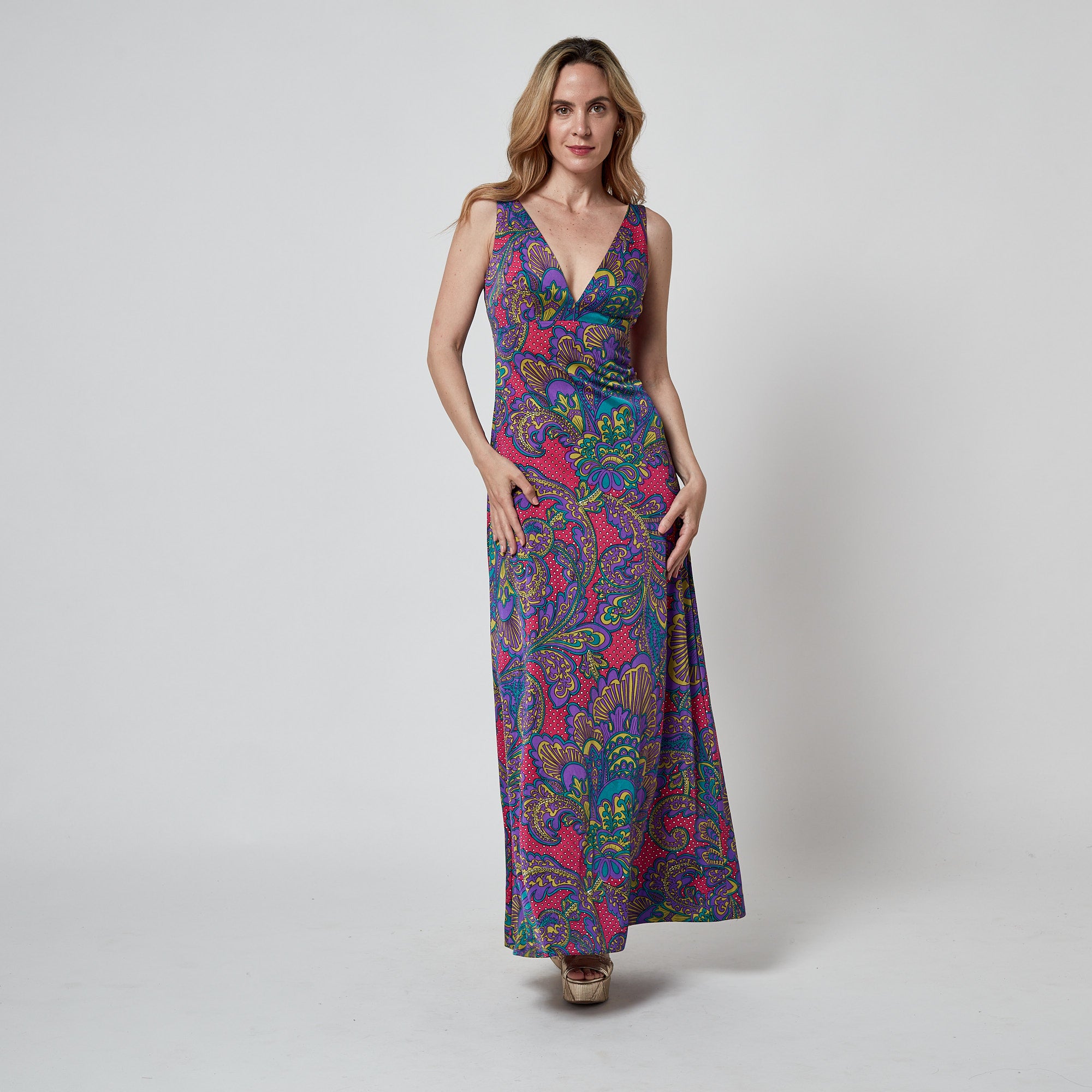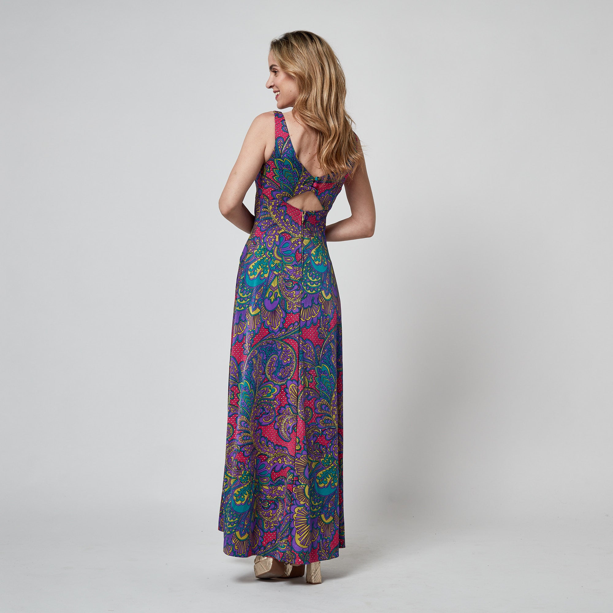 This vivid 1970s sleeveless maxi dress was designed by Rose Marie Reid. A fascinating example of Rose Marie Reid’s later design work, bridging her background in structured mid-century swimwear with the relaxed, fluid forms of 1970s resort wear. It is made from a smooth, cool manmade fabric with a subtle stretch and silky hand, reminiscent of the designer’s signature swimwear materials. The bold paisley print combines crimson, purple, olive, teal, and white in swirling, graphic patterns. The dress features a V-neckline and a keyhole cut-out at the back, fastening above with three fabric-covered buttons and loops. The skirt is tailored to a gentle A-line shape. It is unlined except for a built-in pale beige bust lining, shaped like a soft, elasticated bandeau that closes separately at the back.
