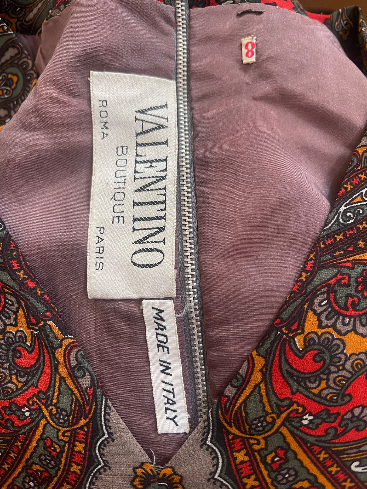 Crafted in Italy, this 1970s Valentino dress was designed by Valentino Garavani himself for his ready to wear line. Reissued by the brand at the beginning of 2025, this is your chance to grab the much rarer original. You'd be in good company as the reissue has been seen on Anna Wintour and is now sold out having retailed for over $11,000. Tailored from smooth silk, it is patterned with the brands “Voyage Imaginaire” print: a blown-up paisley in autumnal hues of burgundy, orange, red, olive green and grey. The A-line cut, with slightly longer back hem, sweeps the floor. There is a décolletage-flashing V-neckline and fluttering silk-chiffon angel sleeves in coordinating print. The skirt has a high slit on each side in the style of a tunic. The dress is lined with mauve silk throughout.