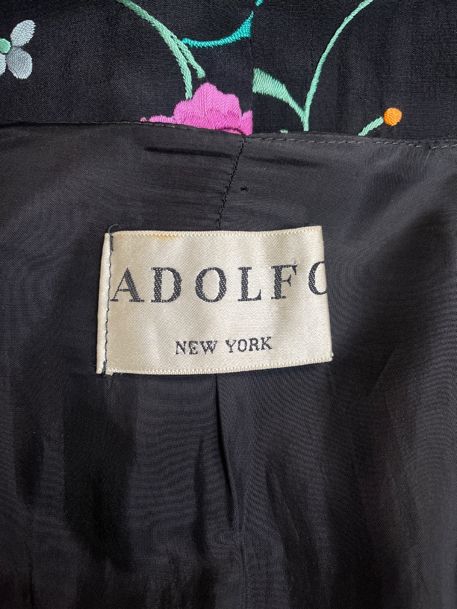 A 1980s or early 1990s dress by Adolfo, a Cuban-born fashion designer who made exceptional clothes which retailed in the best of the best US department stores. Piano shawls were popularised in the early 20th century and influenced by Orientalism and Jazz Age fashion. This dress is made from one of these original period shawls from the late 1920s and is a great example of early textile recycling. Adolfo also loved to work with antique patchwork fabrics. Crafted from black silk to a mini-length with a wrap-around silhouette. It has a V-shaped neckline and cropped sleeves. Hand-knotted fringing elongates these sleeves and the bottom hem of the skirt to dramatic effect. The embroidery work across this dress is still in superb condition and the body is embellished all-over with incredibly detailed rainbow-hued birds, florals and vines. It closes with hidden tonal snap closures and an embroidered tie at the side of the waist, again finished with fringe. The dress is lined in black satin. Internally, it is beautifully made with many hand-sewn finishes.