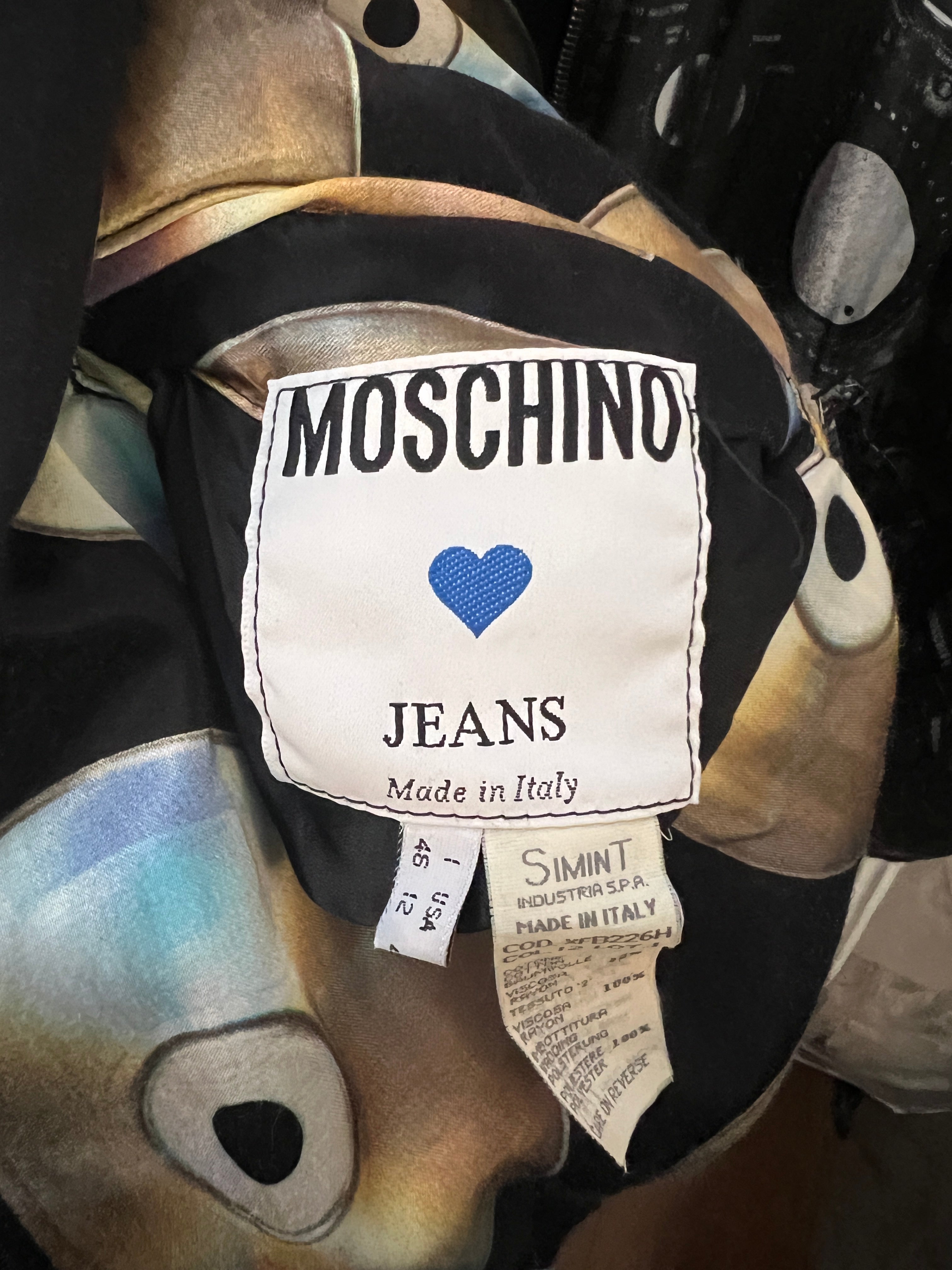 This is a rare, double-sided late 1980s novelty-print padded bomber jacket designed by the founder, Franco Moschino for Moschino Jeans. He established this range for women in 1986, showing his first collection that same year. The line focused on high quality, well constructed garments. This archival jacket is cut to a classic 'bomber' style silhouette with a cocooning cut and ribbed, elasticated cuffs and a curved collar in black. Made from a high quality, smooth cotton-mix satin and - true to Moschino's playful style and taste for the unusual - it is reversible. On one side, the black satin is boldly printed all-over with CDs. On the reverse, is a print showing a Compact Disc Player hi-fi system with the brand name “MOSCHIFO” - a highly contemporary, futuristic print at this time. Both sides are finished with two slit pockets. The front fastens with a bronze metal zip with Moschino peace logo zip-pull. In 2018, Jeremy Scott, who was creative director of Moschino at the time re-released the CD print as part of a limited edition collaboration with H&M.