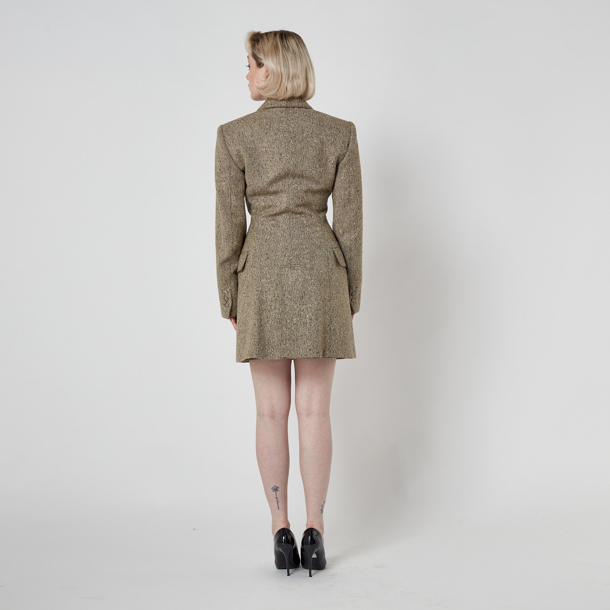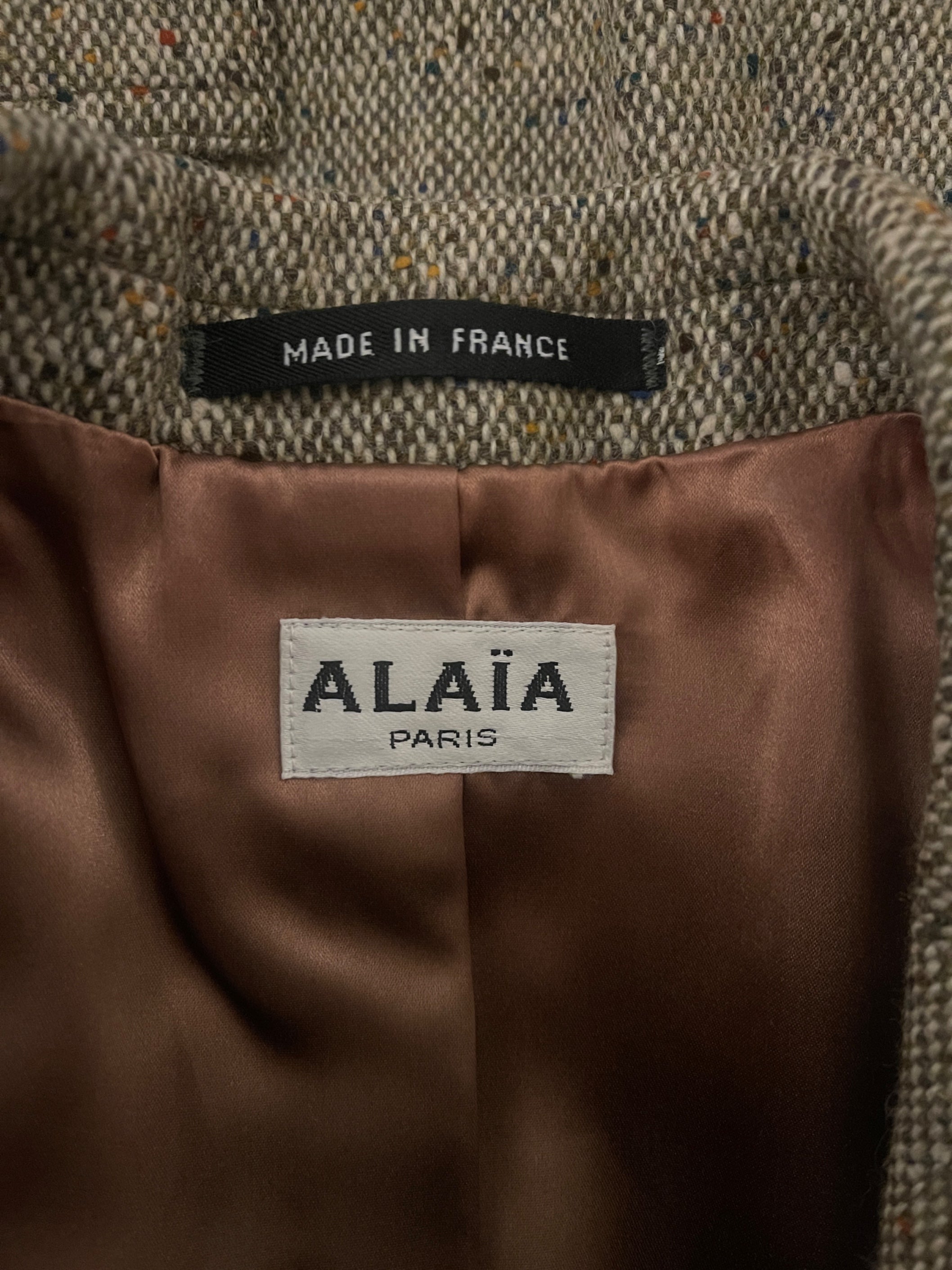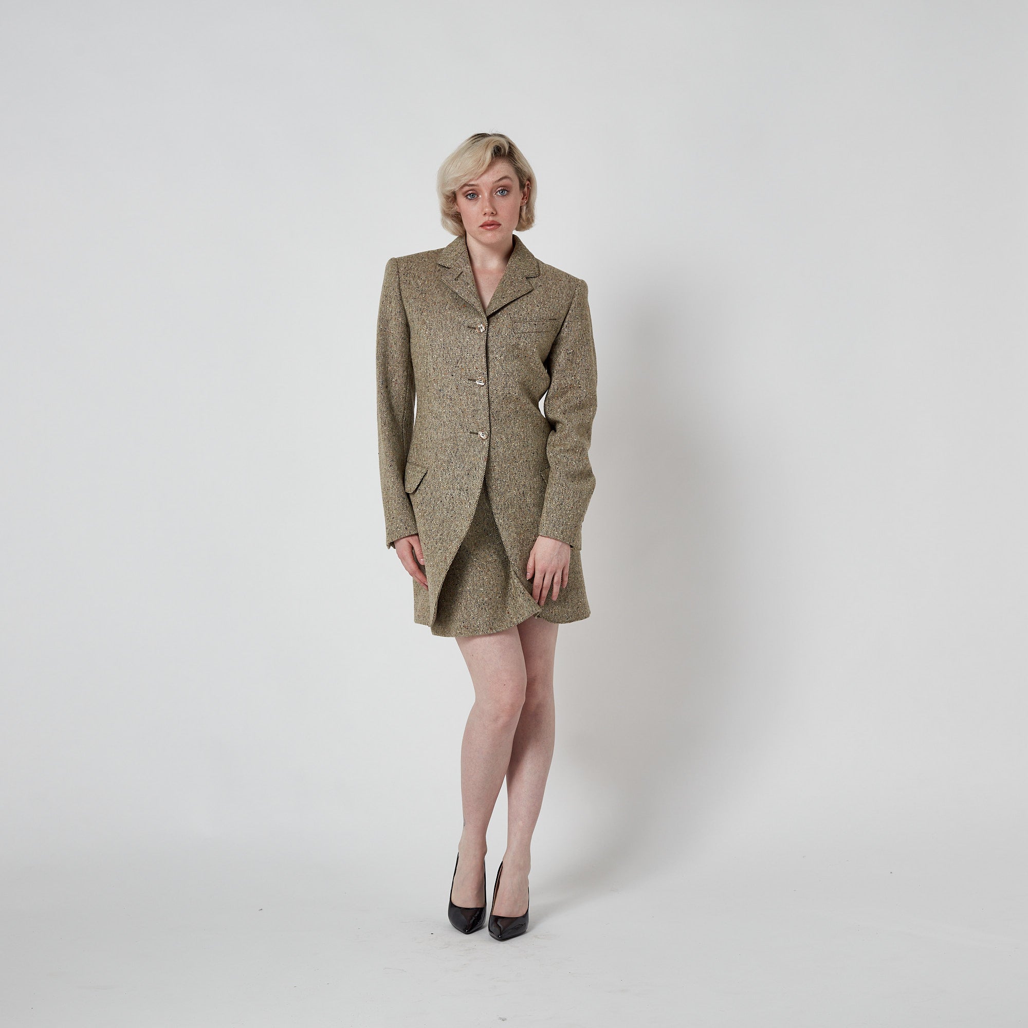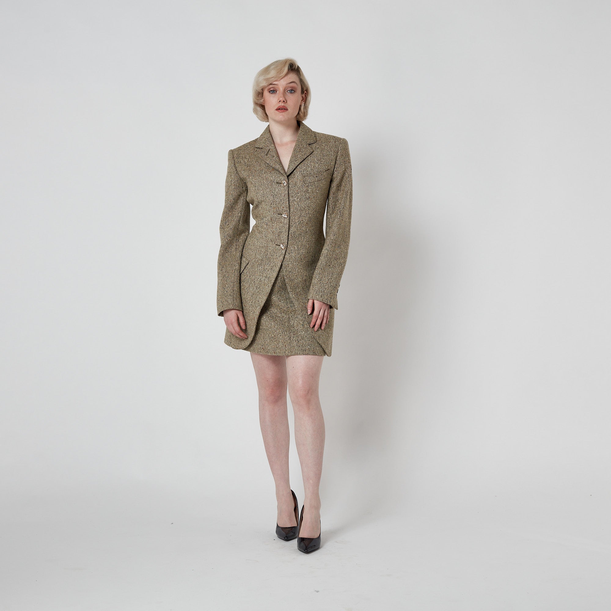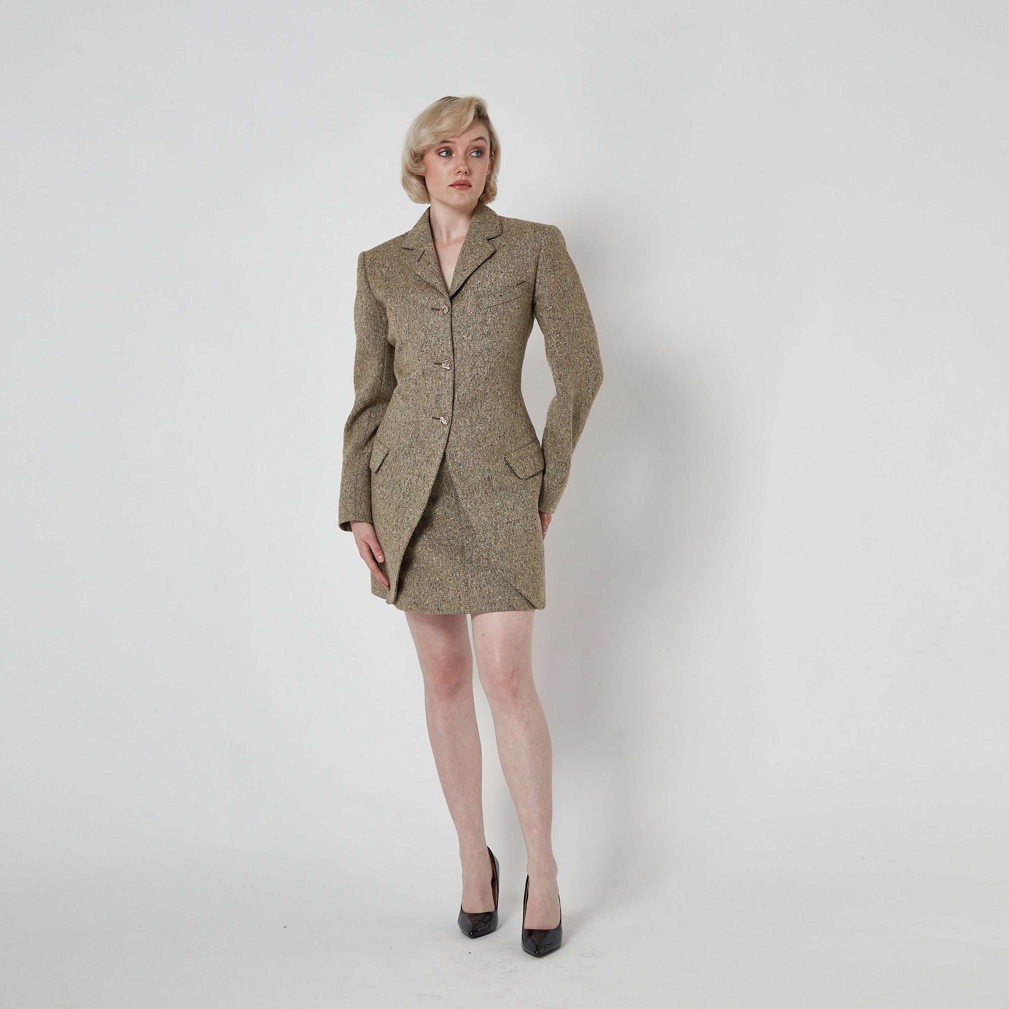 This is a beautifully tailored riding suit from Alaïa’s renowned 1987 collection which featured very similar designs to this suit modelled as separates on the runway. The jacket is precision tailored from a beautiful green-flecked wool tweed and features a short front that cuts away at the waist and a longer tail in the back. It takes its cues from traditional dressage tailcoats - a style which evolved from the Victorian frock coat - cut to be practical for horseback riding. The jacket features small notched lapels, the right side detailed with a buttonhole. The front closes with three chunky, textured faux mother-of-pearl buttons. It has two flap pockets at the hip and a welt pocket at the bust. The jacket is lined with a light brown hued silk-satin throughout, as are the pockets. It has two interior pockets. The back of the jacket can be unbuttoned - as though cut for sitting on horseback. The skirt is cut to a mini-skirt length with a high-waist. It fastens with a hidden tonal zip at the back, alongside a faux mother-of-pearl button on a tab. The skirt is also lined with light brown silk-satin.