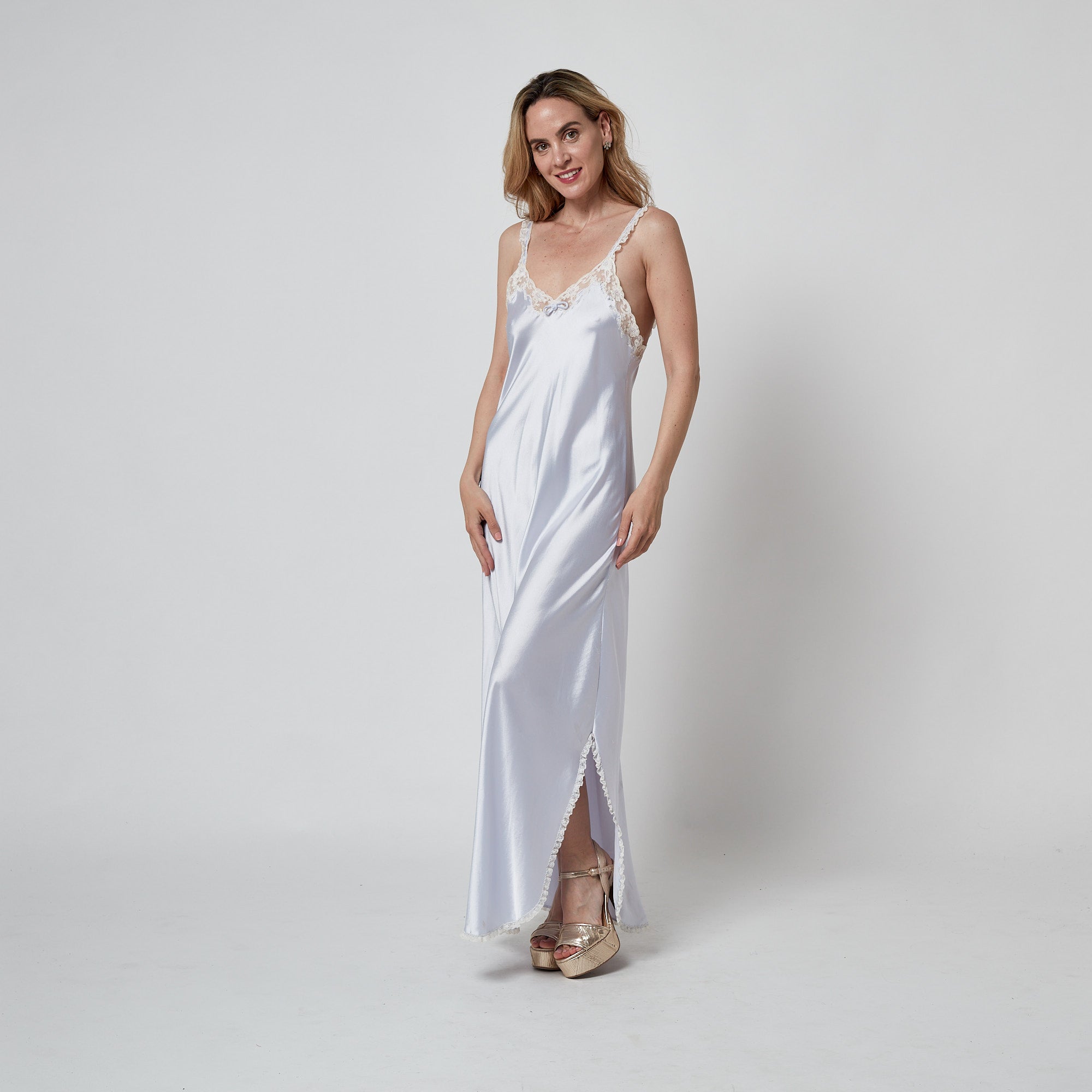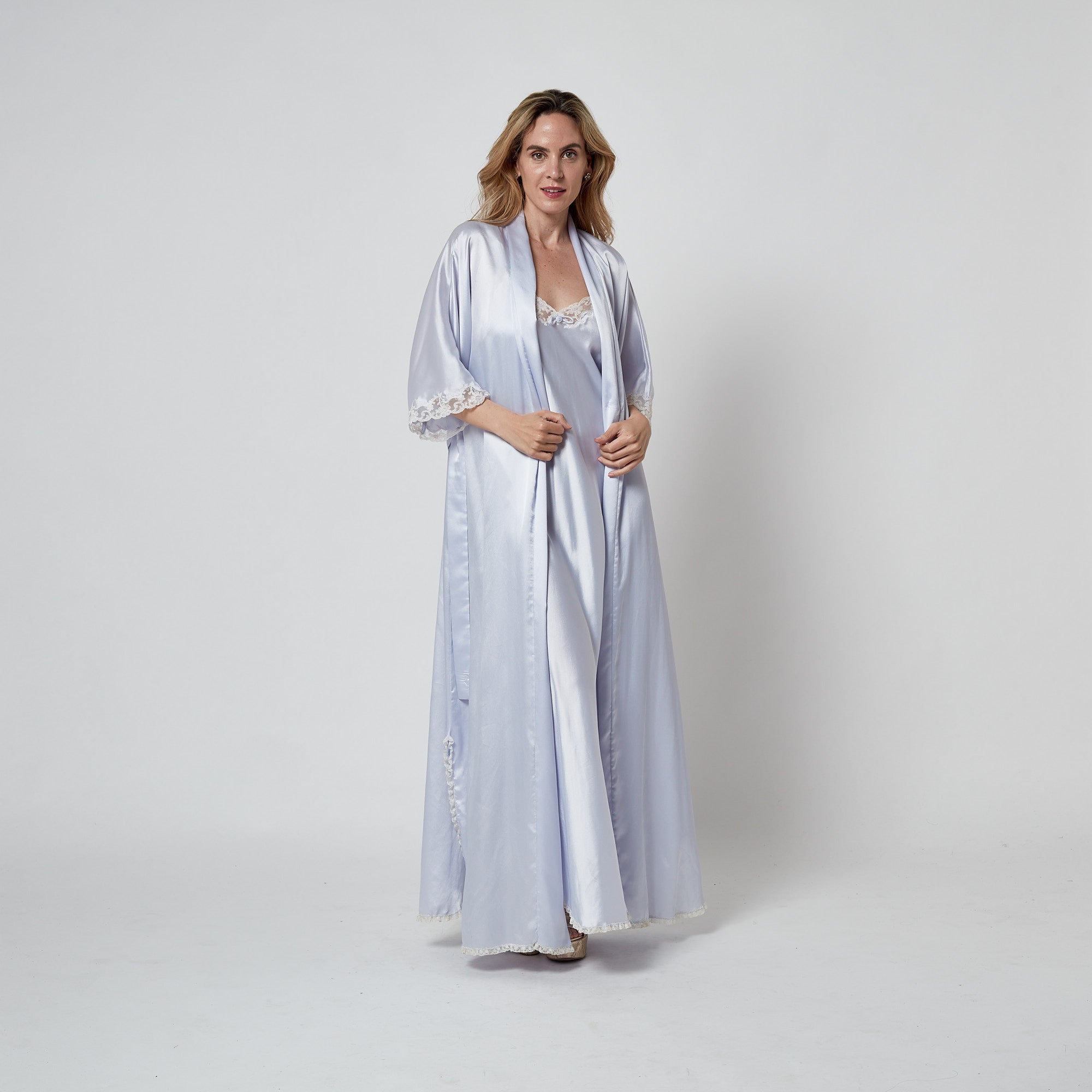 This lilac satin floor-length slip dress and dressing gown was designed by Christian Dior in the late 1980s to early 1990s. It features a soft sweetheart neckline and a straight, lowered back. The bust, back edge, and delicate shoulder straps are all trimmed with pretty white lace. The centre of the bust is crowned with a lilac fabric bow with a lilac rose centre. The skirt is finished with two curved side slits, each outlined in matching lace for subtle definition. The coordinating short-sleeve robe is cut for a loose, fluid fit with wide sleeves, also edged in white lace at the cuffs. It mirrors the slip with two curved, lace-trimmed slits at the hem. Comes with a matching lilac satin belt to cinch the waist of the robe if desired.