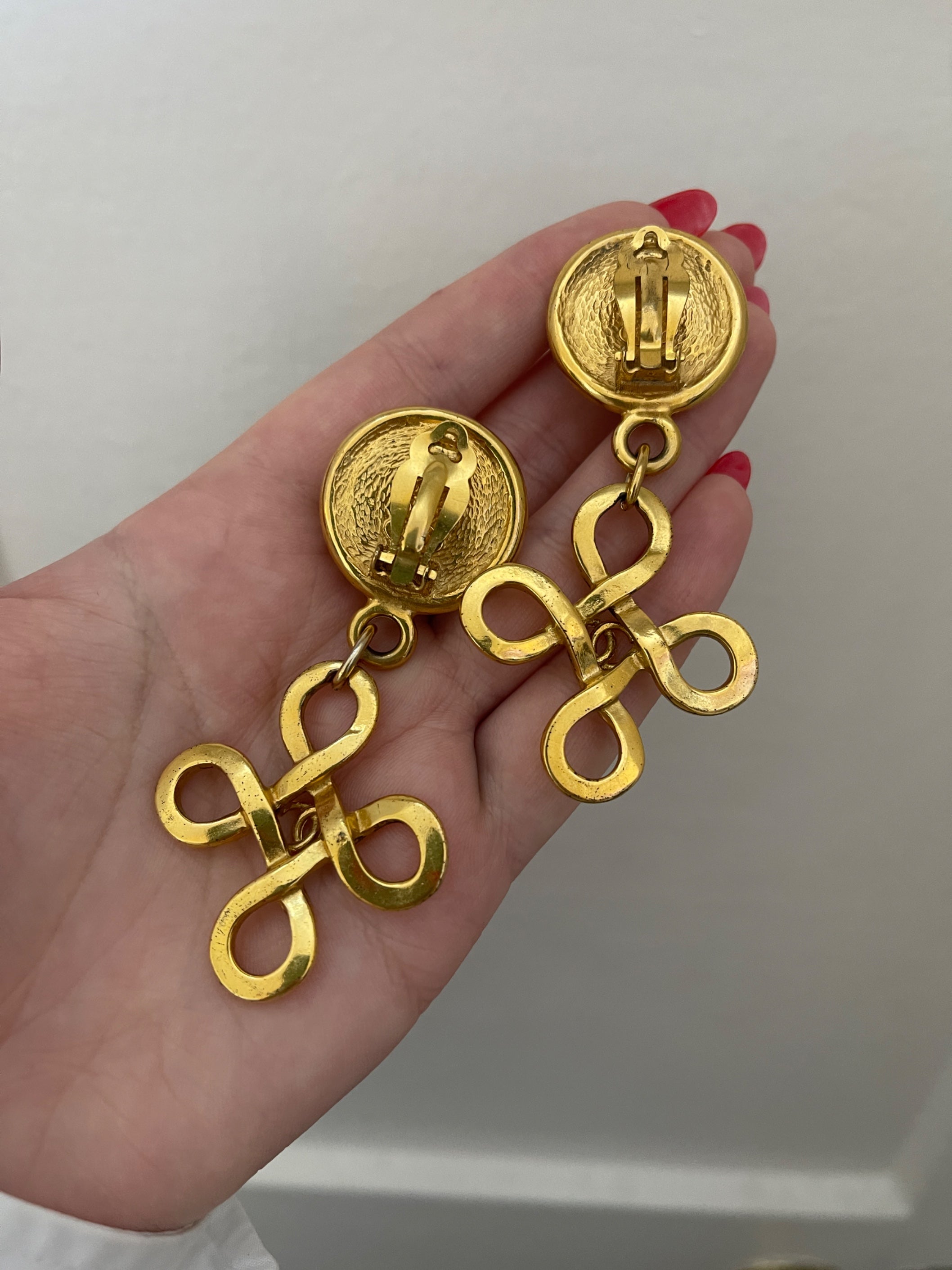 These striking gold-plated earrings were created by Victoire de Castallane for the Chanel Spring 1993 collection and are in fabulous condition. They form looping stylised cross motifs, crowned with a chunky double-C logo in the centre. The part of the earring that clips onto the ear is circular and adorned with a large pearlescent half-sphere, ringed with gold-plated base metal. The back is detailed with a clip-on clasp and a plaque that has the double-C logo, brand name, “Made in France” and “93 P” engraved onto it. These earrings are superb with only some very minor wear to the clip on rear - not visible when worn.
