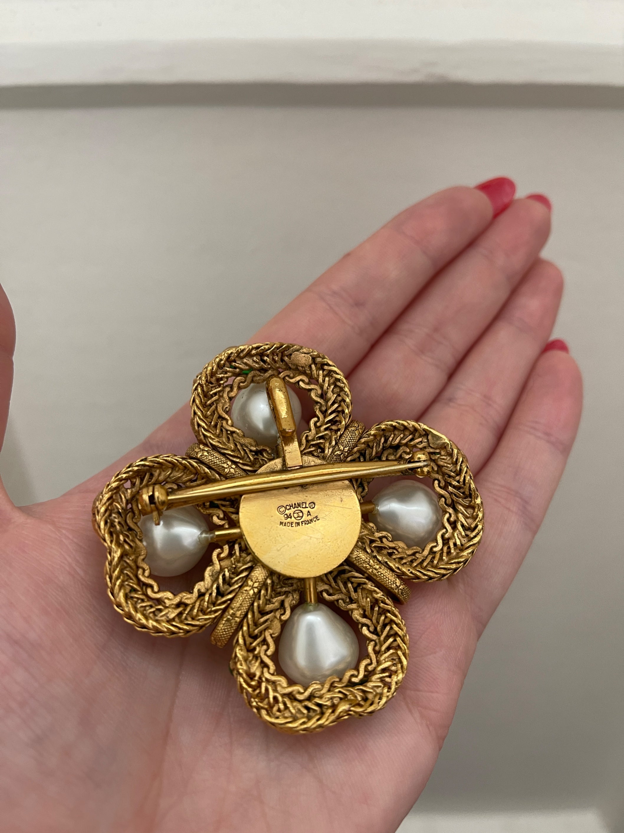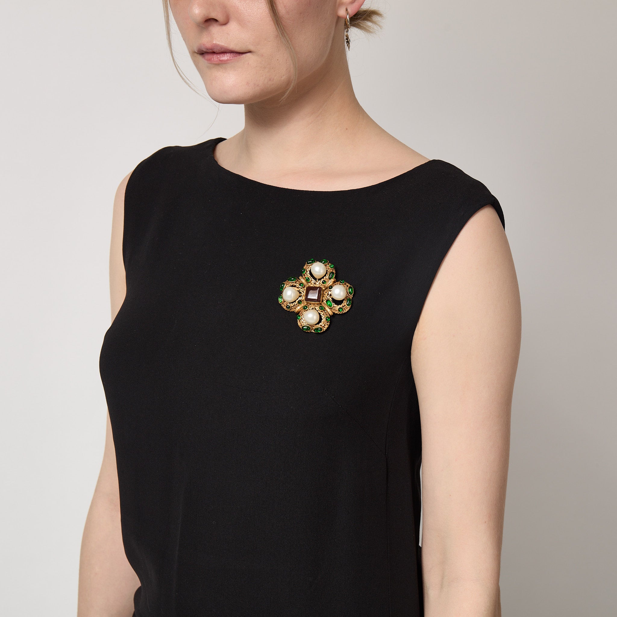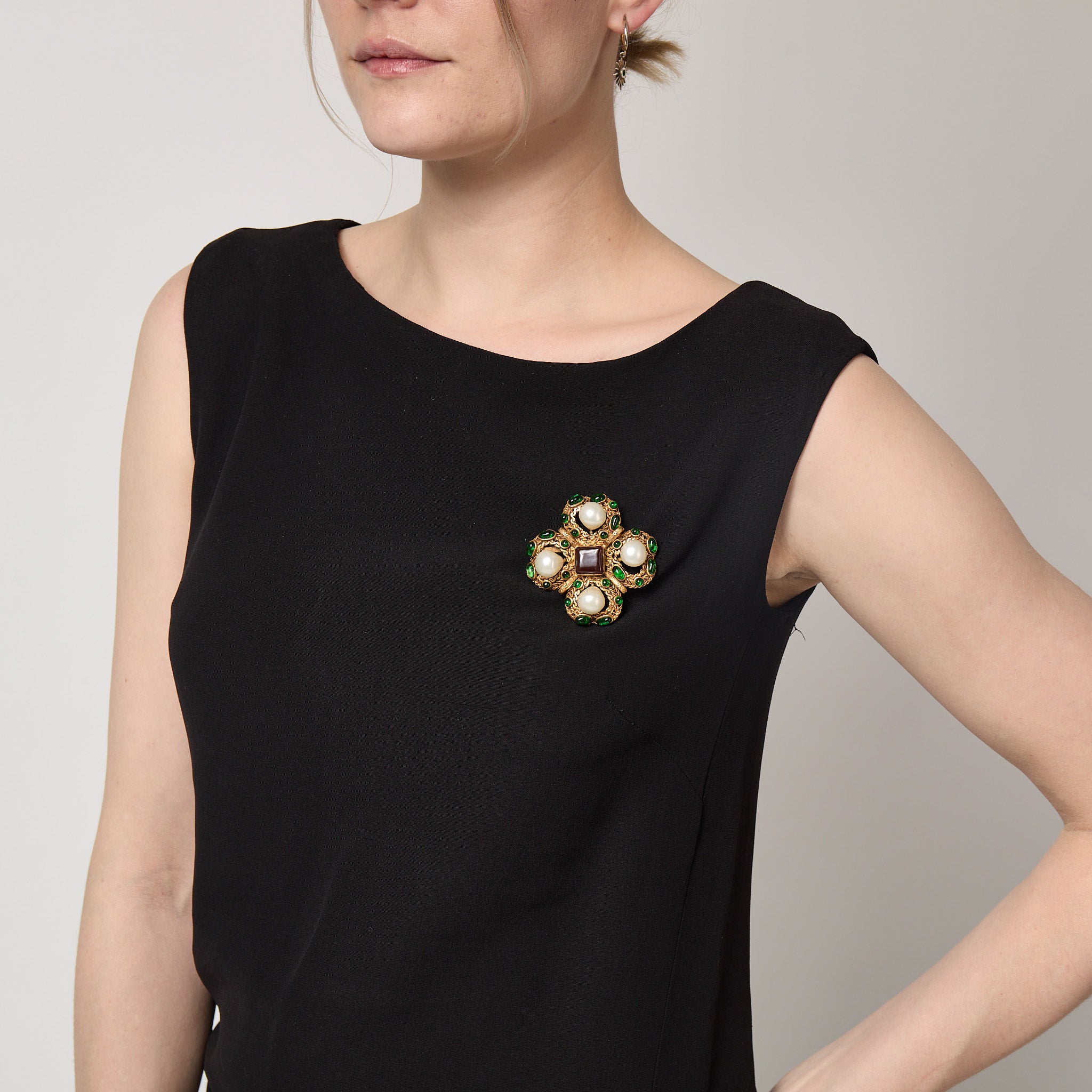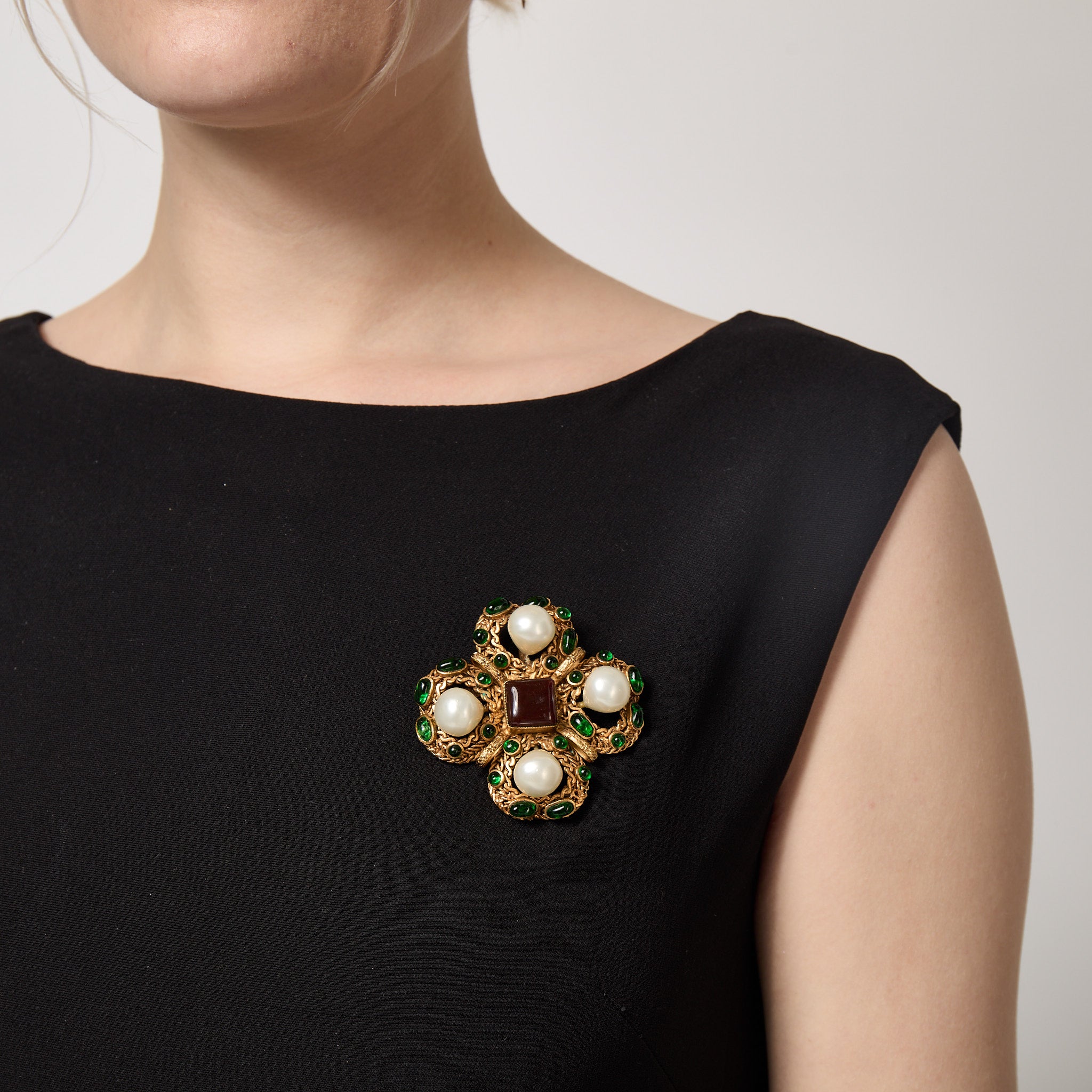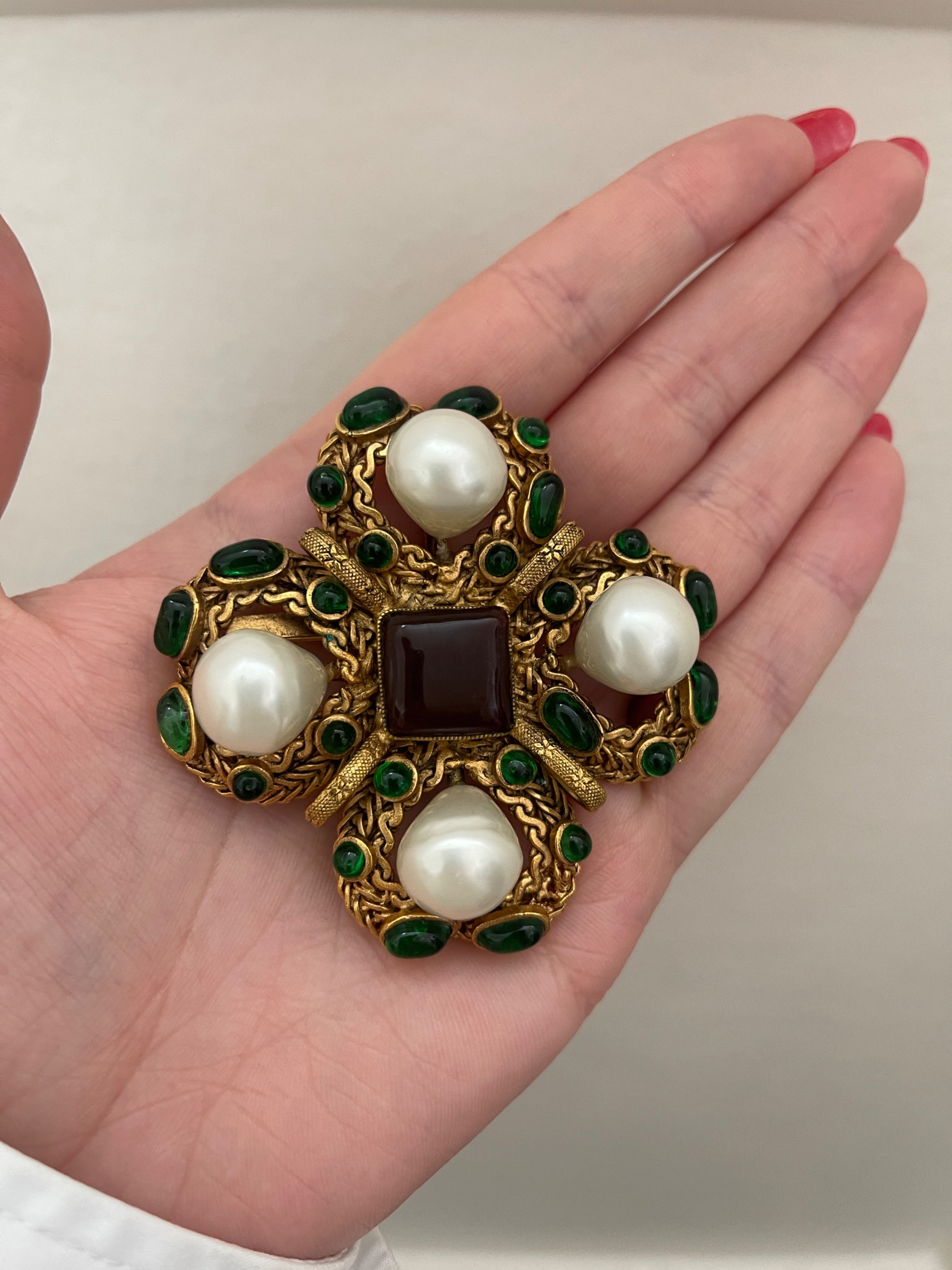 1994 Chanel Gold Brooch with Pearls and Green and Red Gripoix