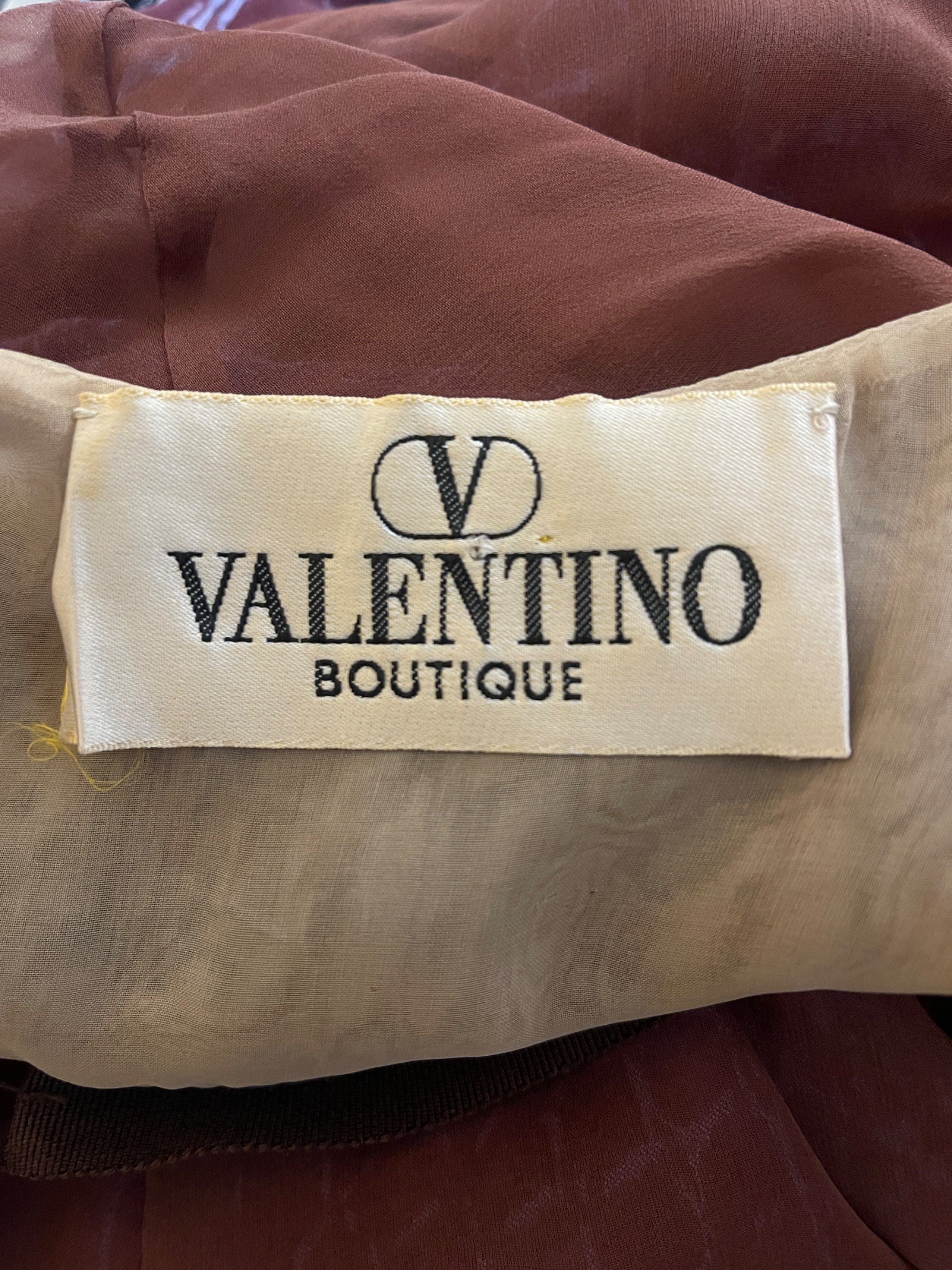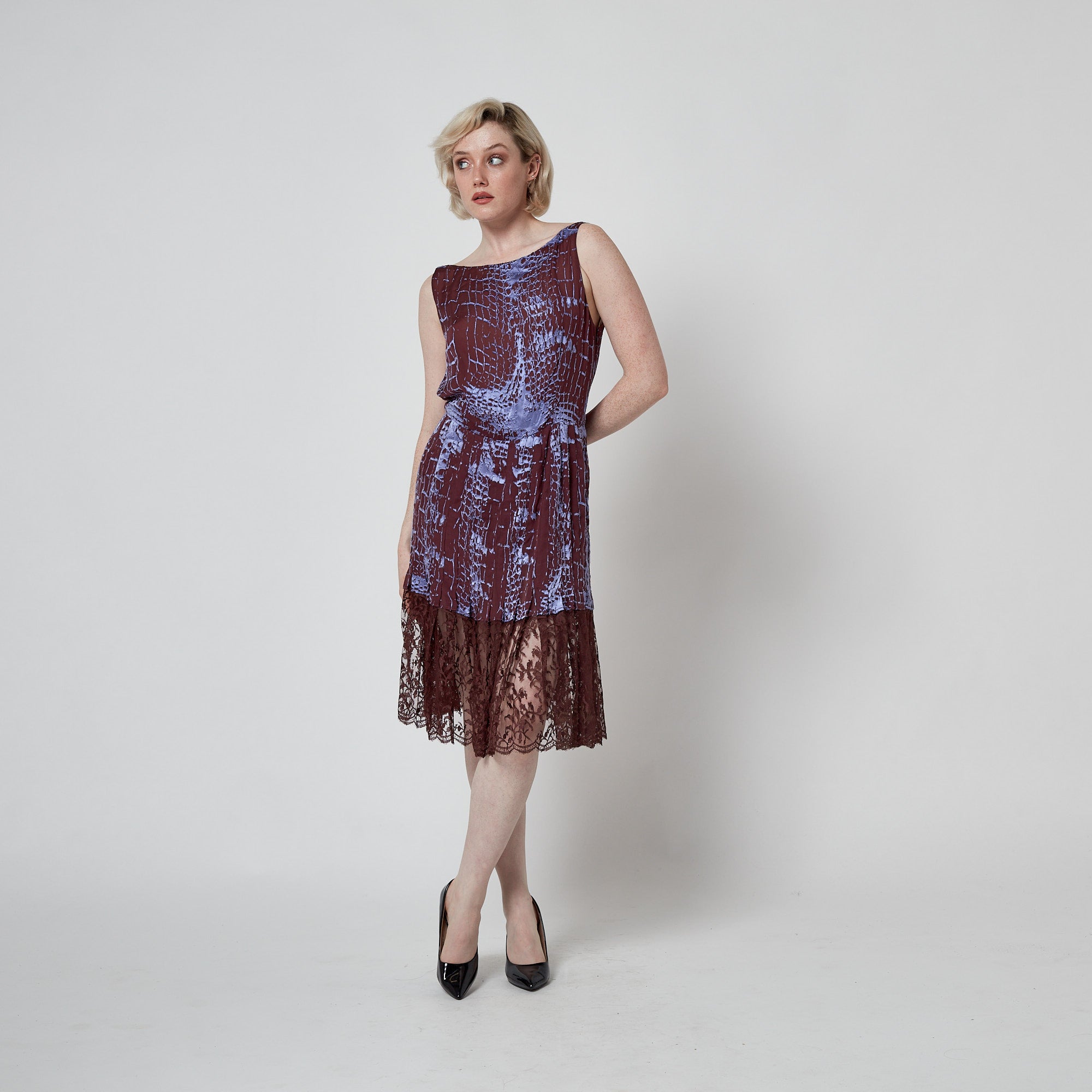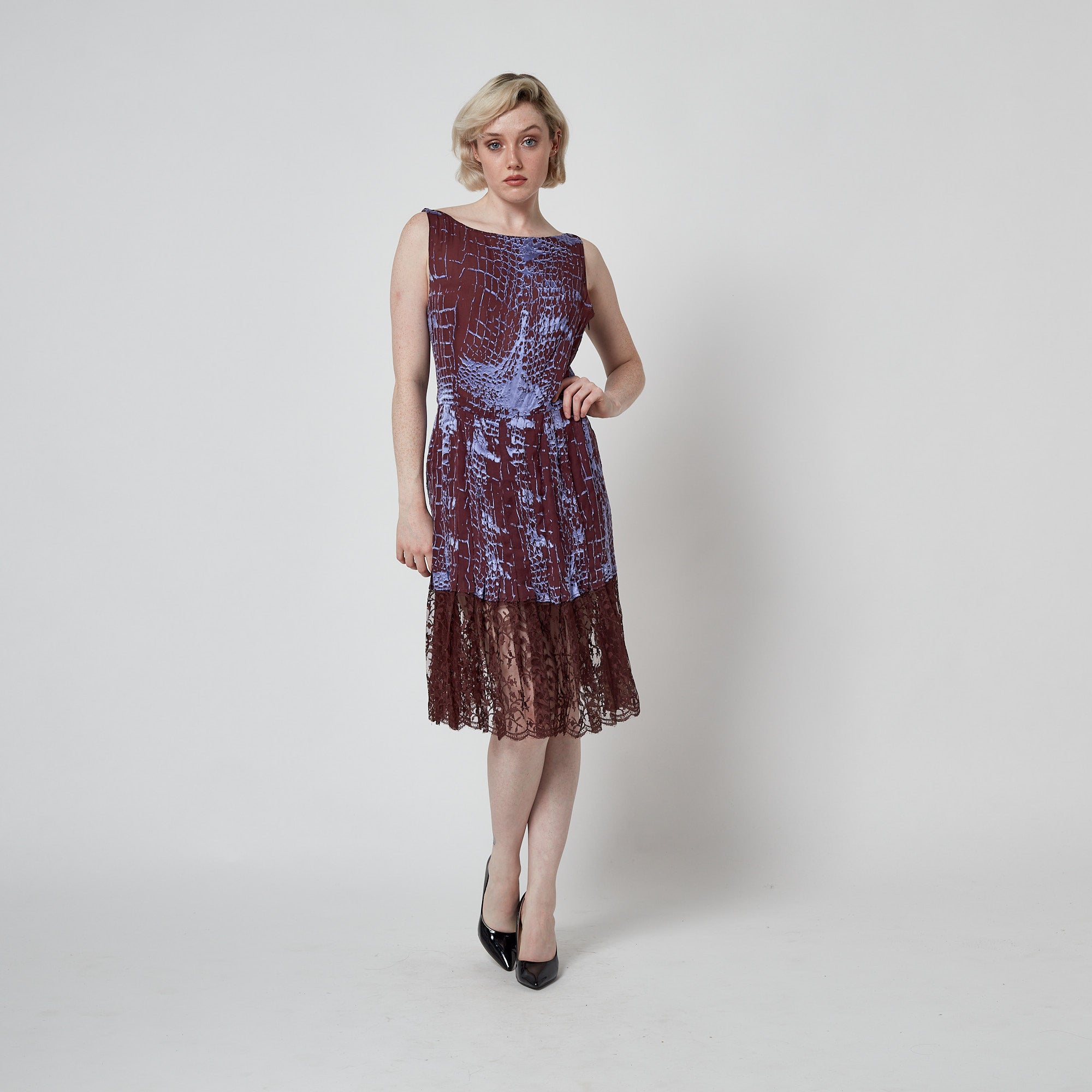 This Valentino Boutique dress is crafted from a lightweight silk-mix devoré fabric. We have seen identical prints in different colourways in both the Fall 1997 and Spring 1998 collections. It has a background of deep burgundy-brown crepe detailed with a textured, scale-like pattern in glossy lilac velvet. The dress is cut to a relaxed, flowy shape with a slash-neckline and pretty low cowl-back. The neck of the cowl has a weight hidden inside the fabric to hold its shape. The cowl also reveals the nude sheer silk crepe lining the back. The waistband cinches the waist only slightly, allowing the top of the dress to drape over the top of the waist. The devoré fabric falls to thigh length and gives way to a sheer panelled flounce of burgundy-brown lace. The dress is lined at the top with chocolate-brown sheer silk crepe but the skirt is unlined. It fastens under the left arm with a hidden tonal burgundy zip and hook-and-eye clasp.